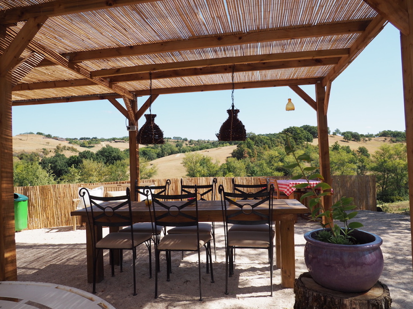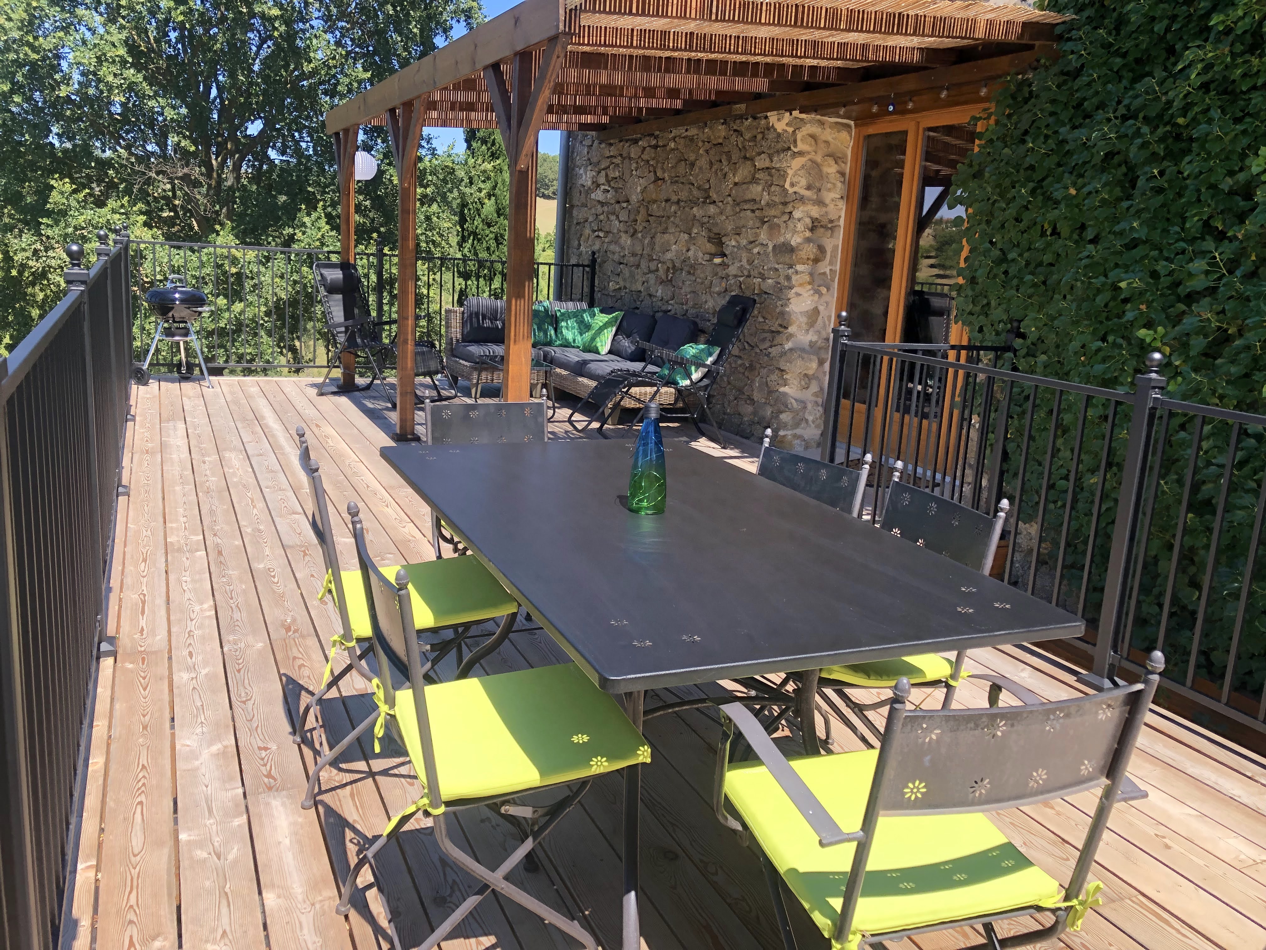 Grâce à la position du gîte, ses murs épais et la climatisation réversible, il reste frais en été et est chauffé en automne ou au printemps. Une grande terrasse avec vue magnifique, équipée d’une table, d’un salon, de chaises longues et d’un barbecue Weber, invite à profiter du plein air. La terrasse est partiellement couverte et offre une vue imprenable sur les collines, le village de Lapenne et les couchers de soleil.