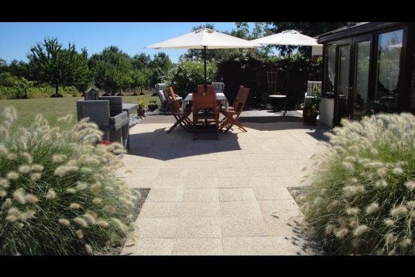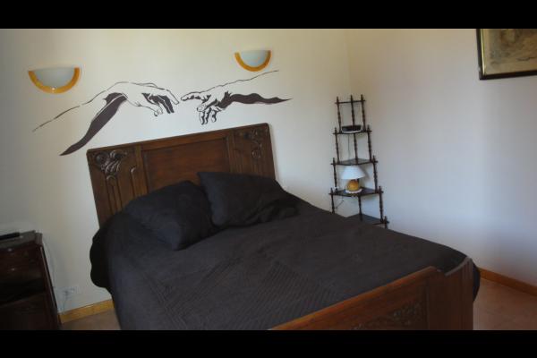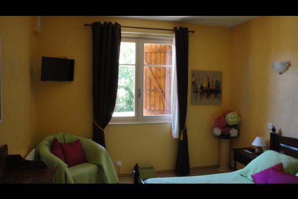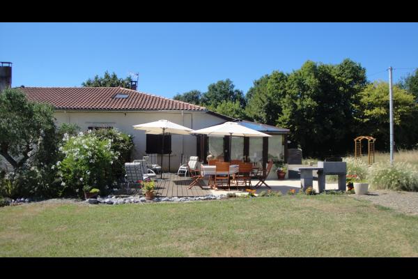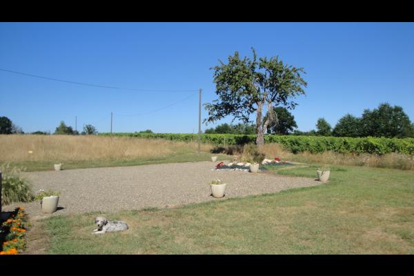Gîte mitoyen avec la maison des propriétaires, donnant sur un grand parc végétalisé.