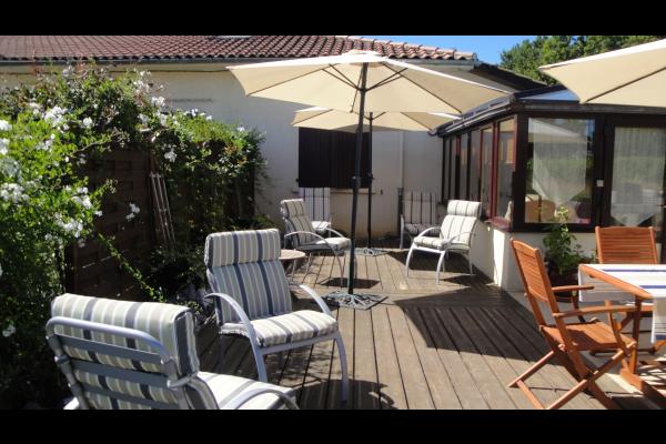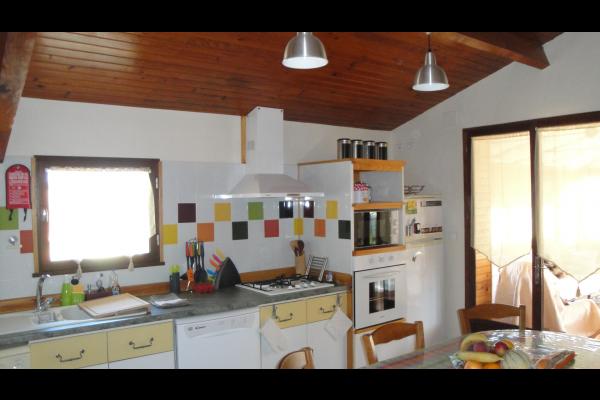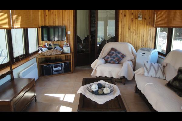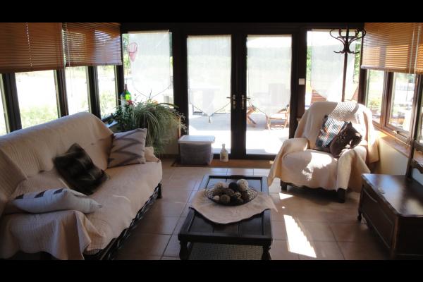 Grande véranda aménagée en salon avec accès privilégié sur l’extérieur.Cuisine et coin repas entièrement équipés. (Réfrigérateur/congélateur, four, four Micro-ondes, lave-vaisselle, lave-linge, plaque de cuisson…)