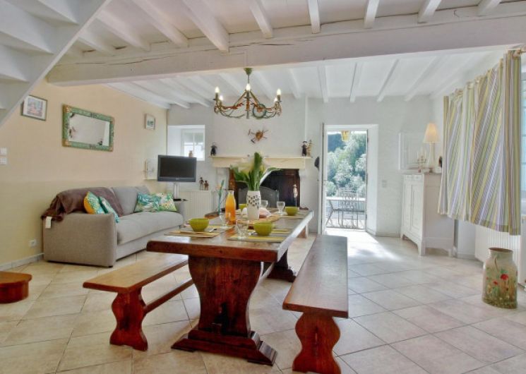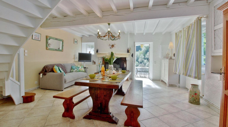 En rez-de-chaussée: salle à manger /coin cuisine/coin salon, salle d’eau + wc. En étage: 2 chambres (1 lit 2 pl., 2 lits 1 pl.), lit et chaise bébé. accès par extérieur: buanderie, parking et cour. Charges comprises, chauffage central au gaz, .Lits faits à l’arrivée et bois fourni. .