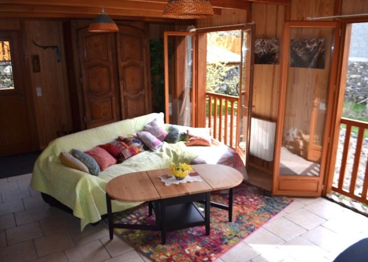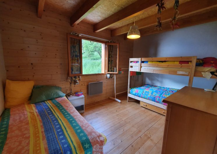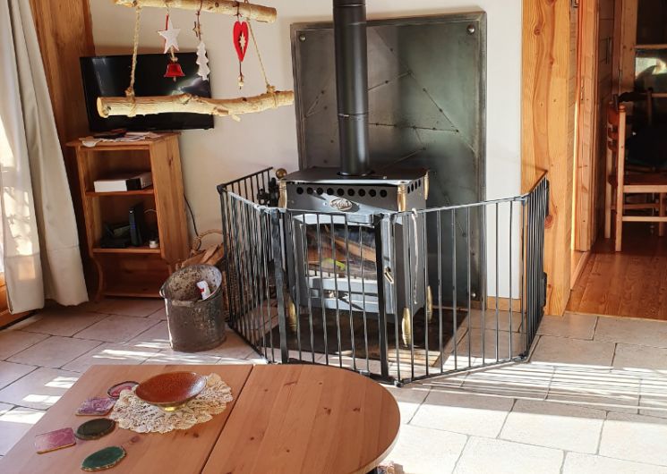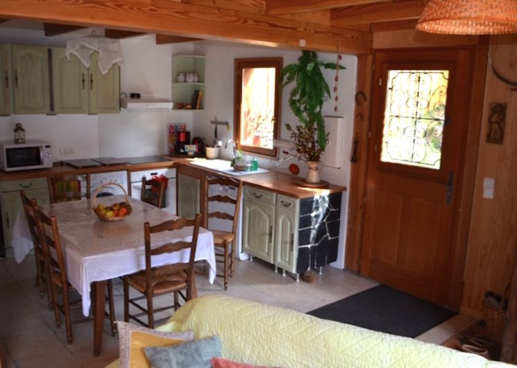 Cuisine intégrée avec espace repas attenant, ouverte sur le séjour salon avec poêle à bois (bois fourni) avec vue sur les montagnes environnantes. Deux chambres indépendantes avec pour l’une un lit en 140 et pour l’autre, trois lits en 90 (deux lits superposés et un lit tiroir).lit bebe chaise haute baignoire si besoin