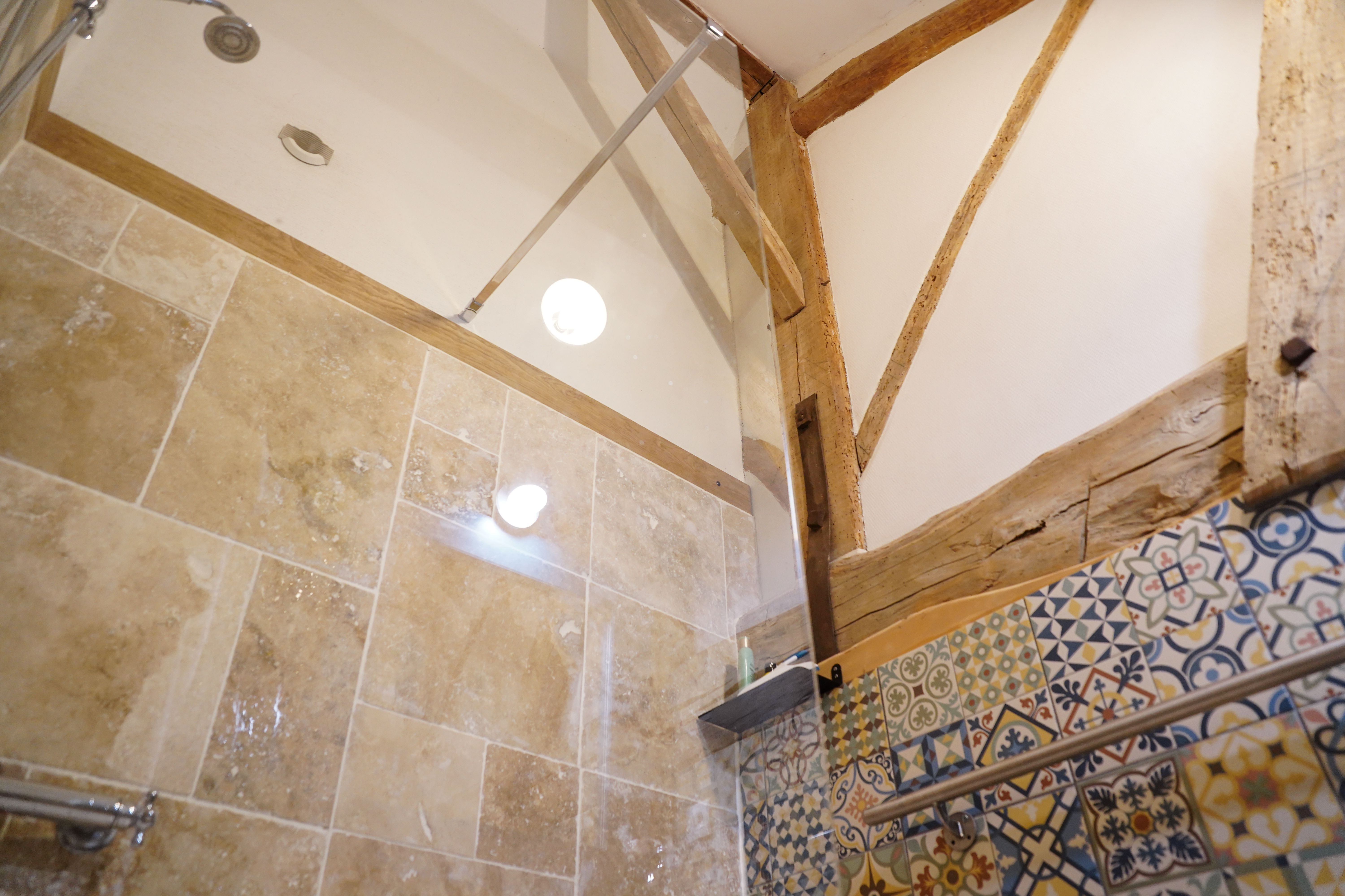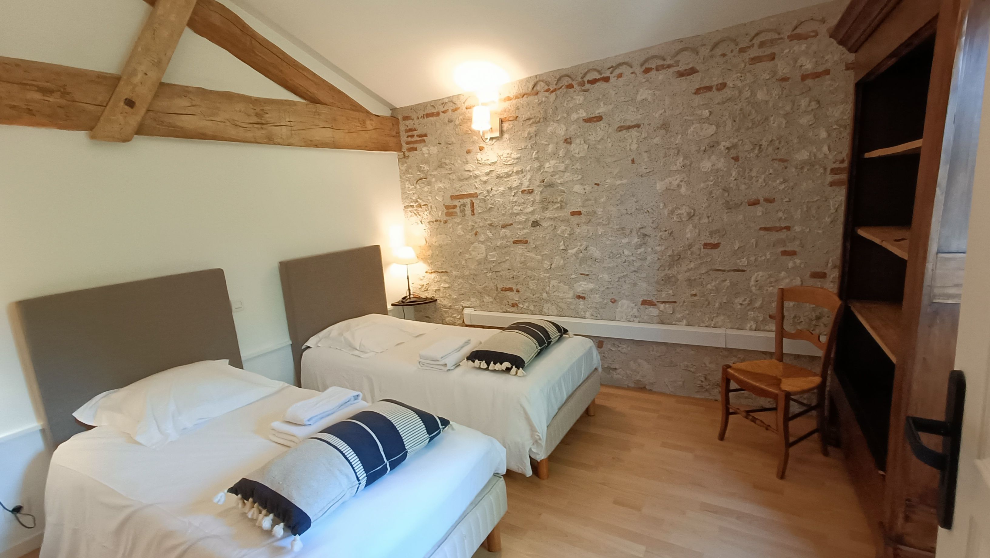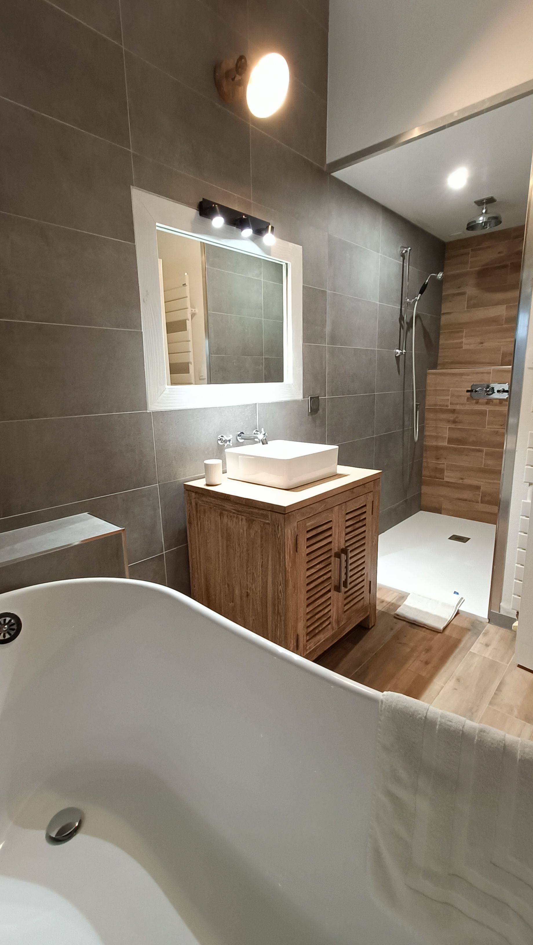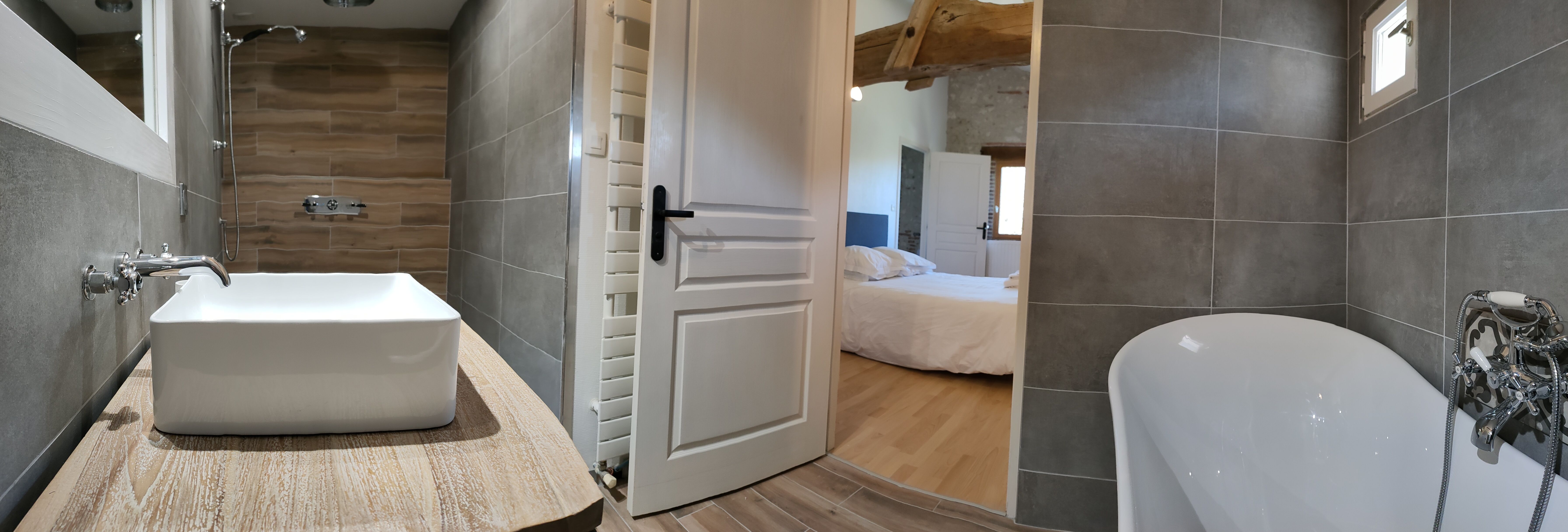 À l’étage 1 chambre parentale lit 180 avec salle de bain baignoire romantique et grande douche + 1 ch (2 lits x90), & 1 ch (1×160), salle d’eau avec douche, WC indépendant sur le palier.