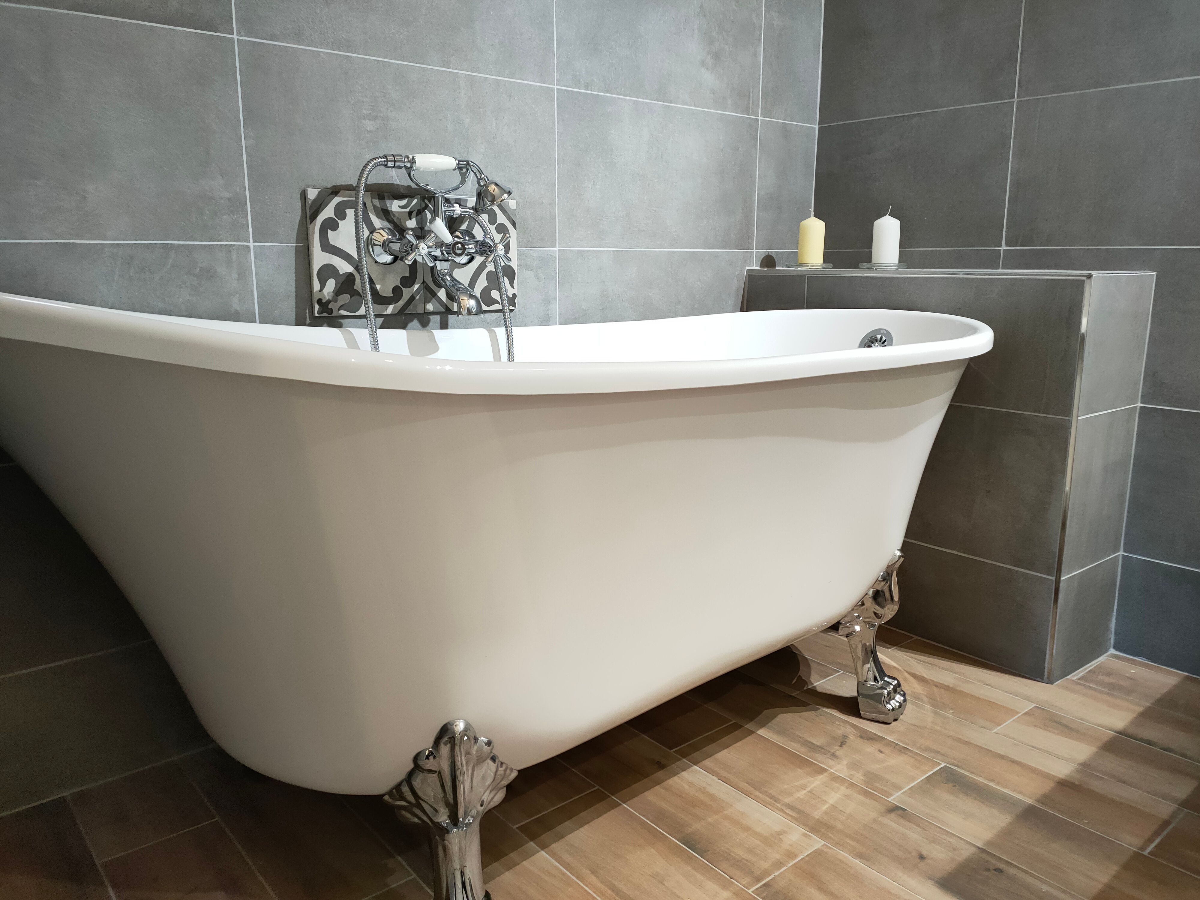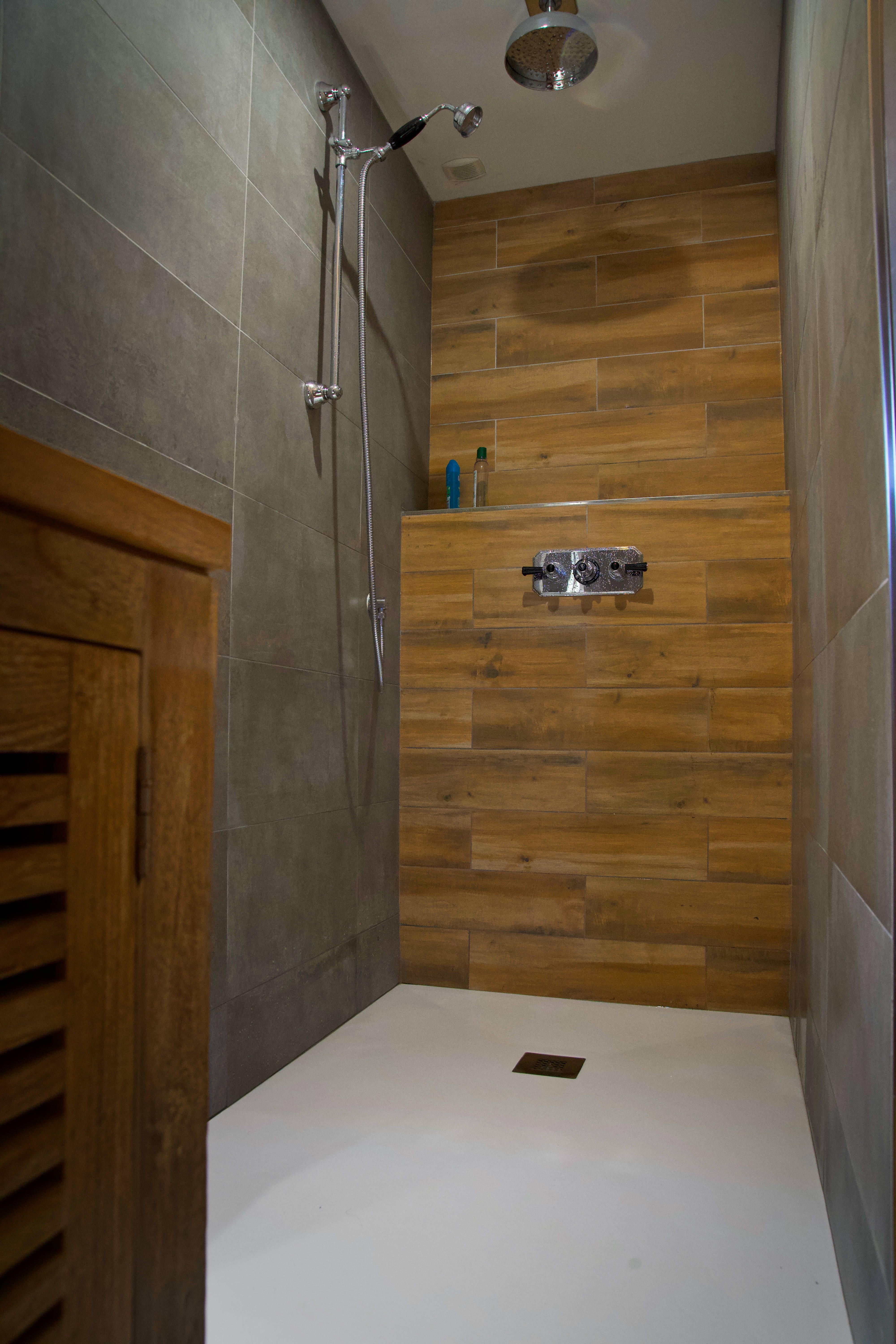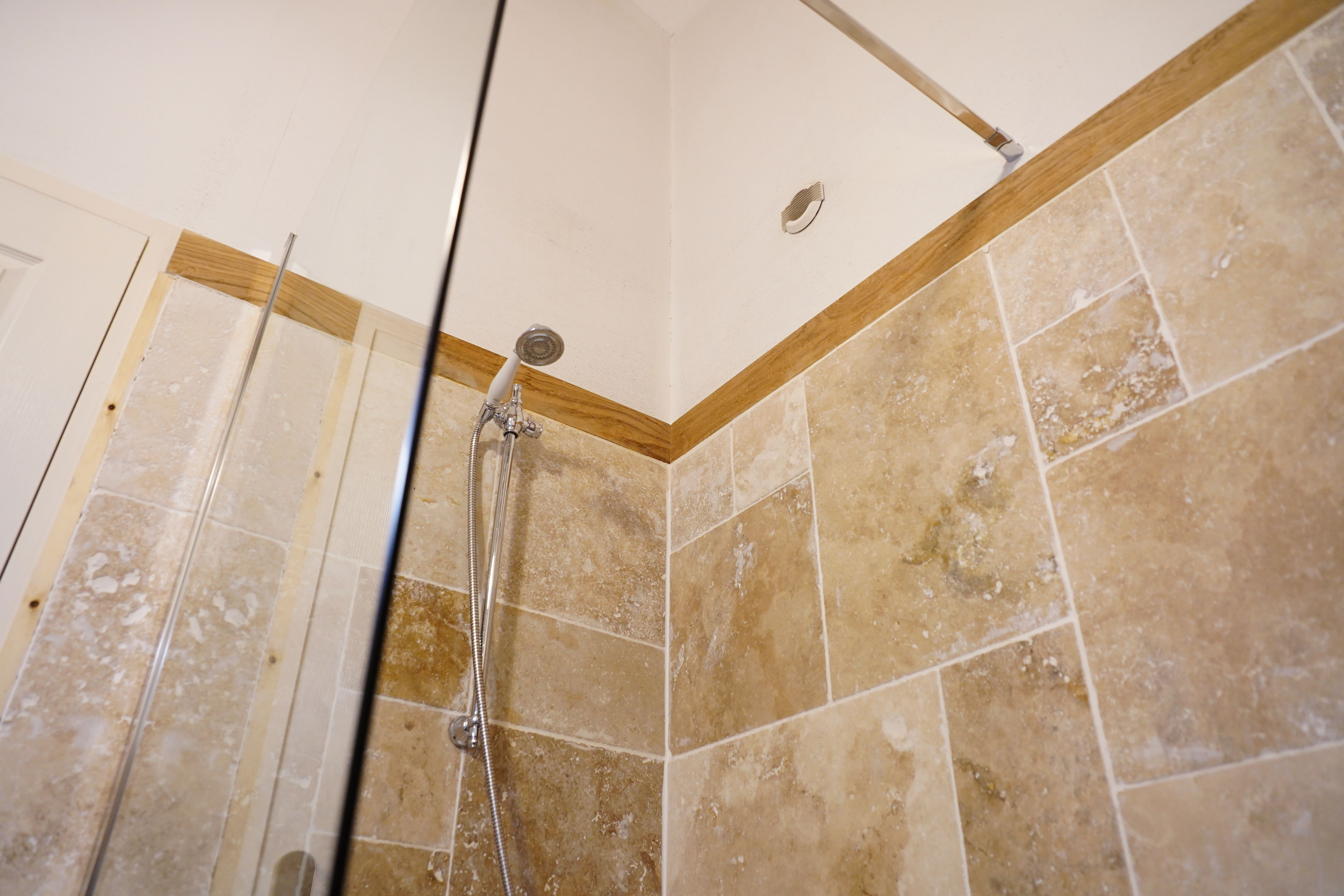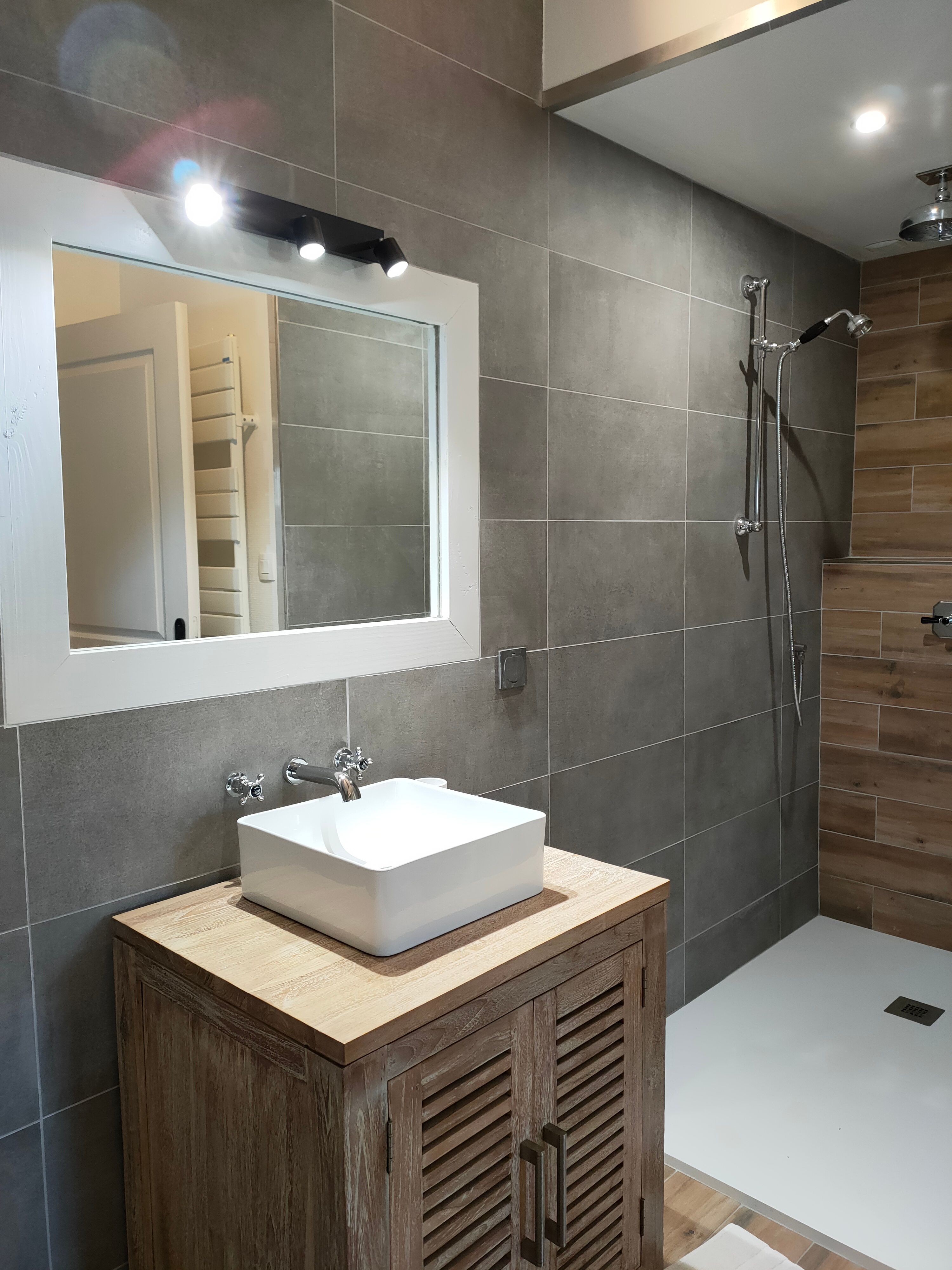 À l’étage 1 chambre parentale lit 180 avec salle de bain baignoire romantique et grande douche + 1 ch (2 lits x90), & 1 ch (1×160), salle d’eau avec douche, WC indépendant sur le palier.