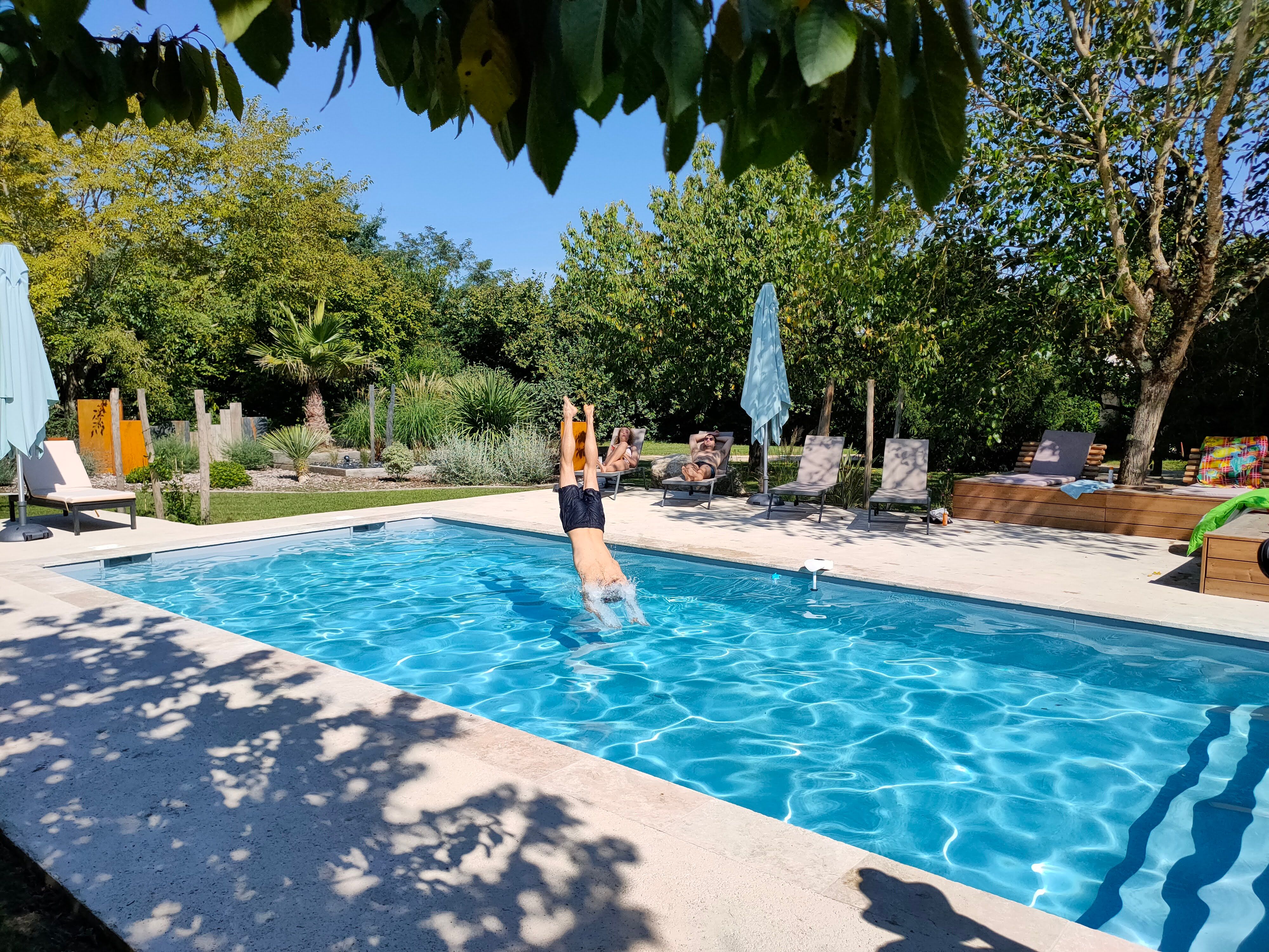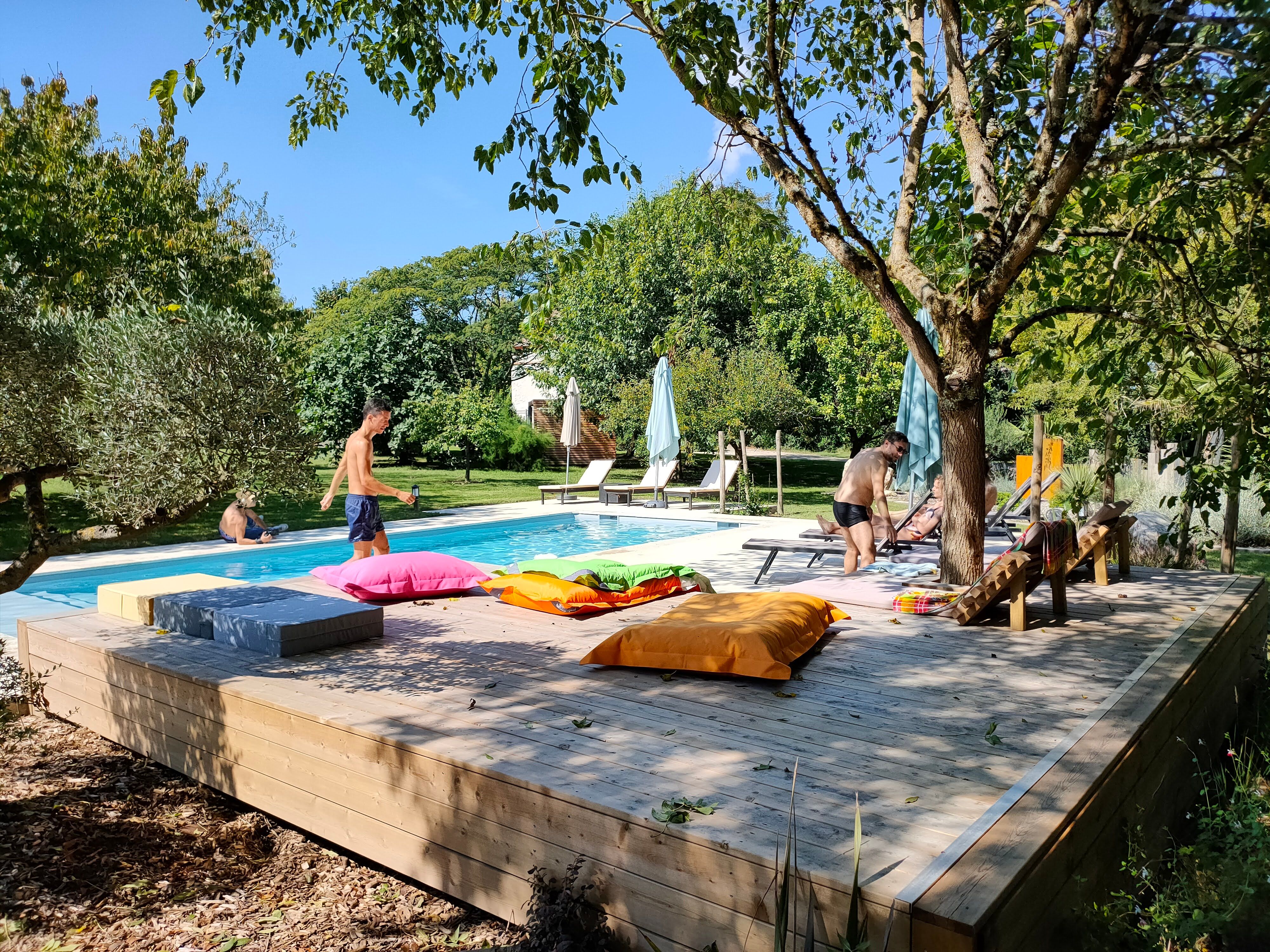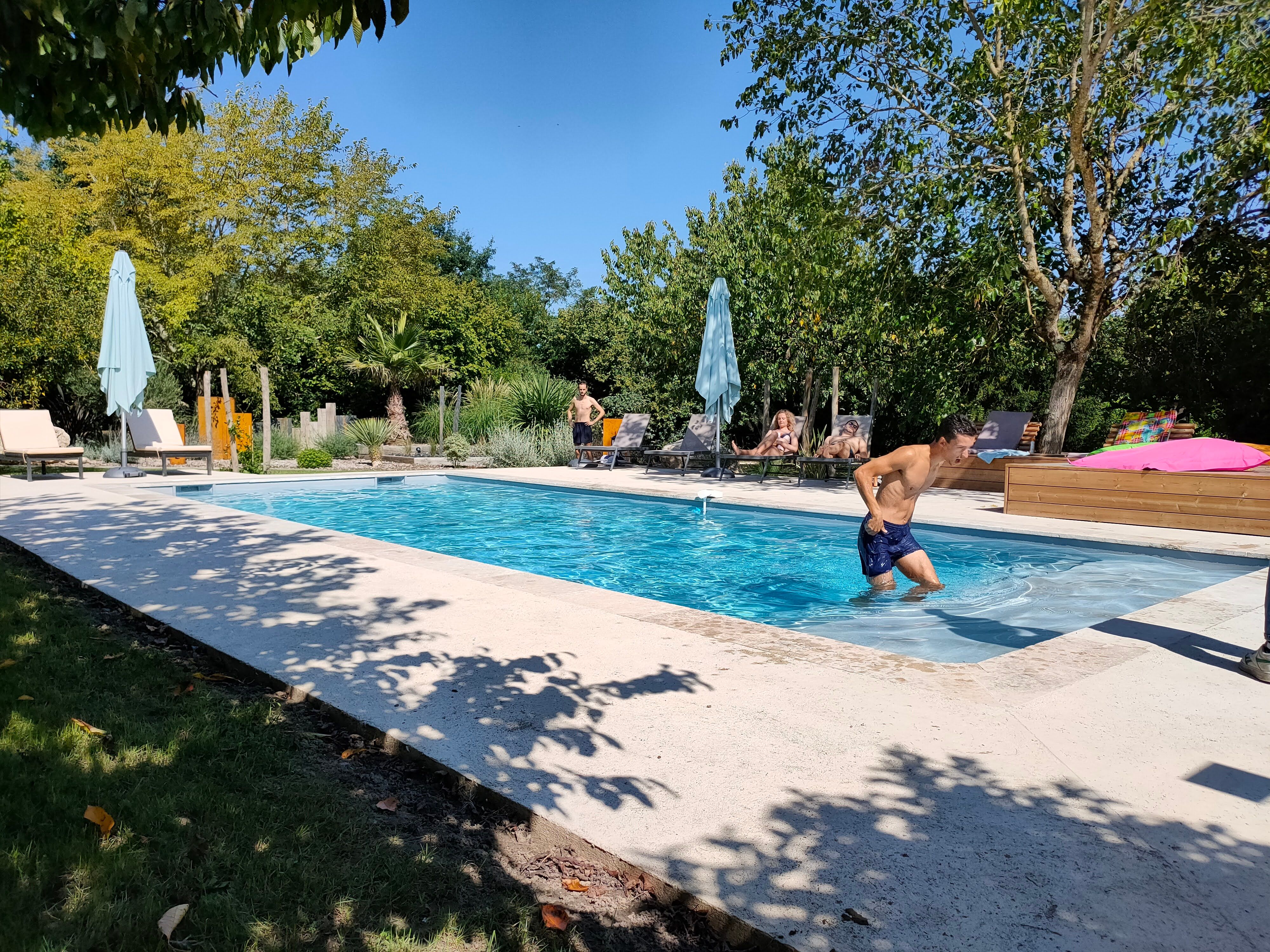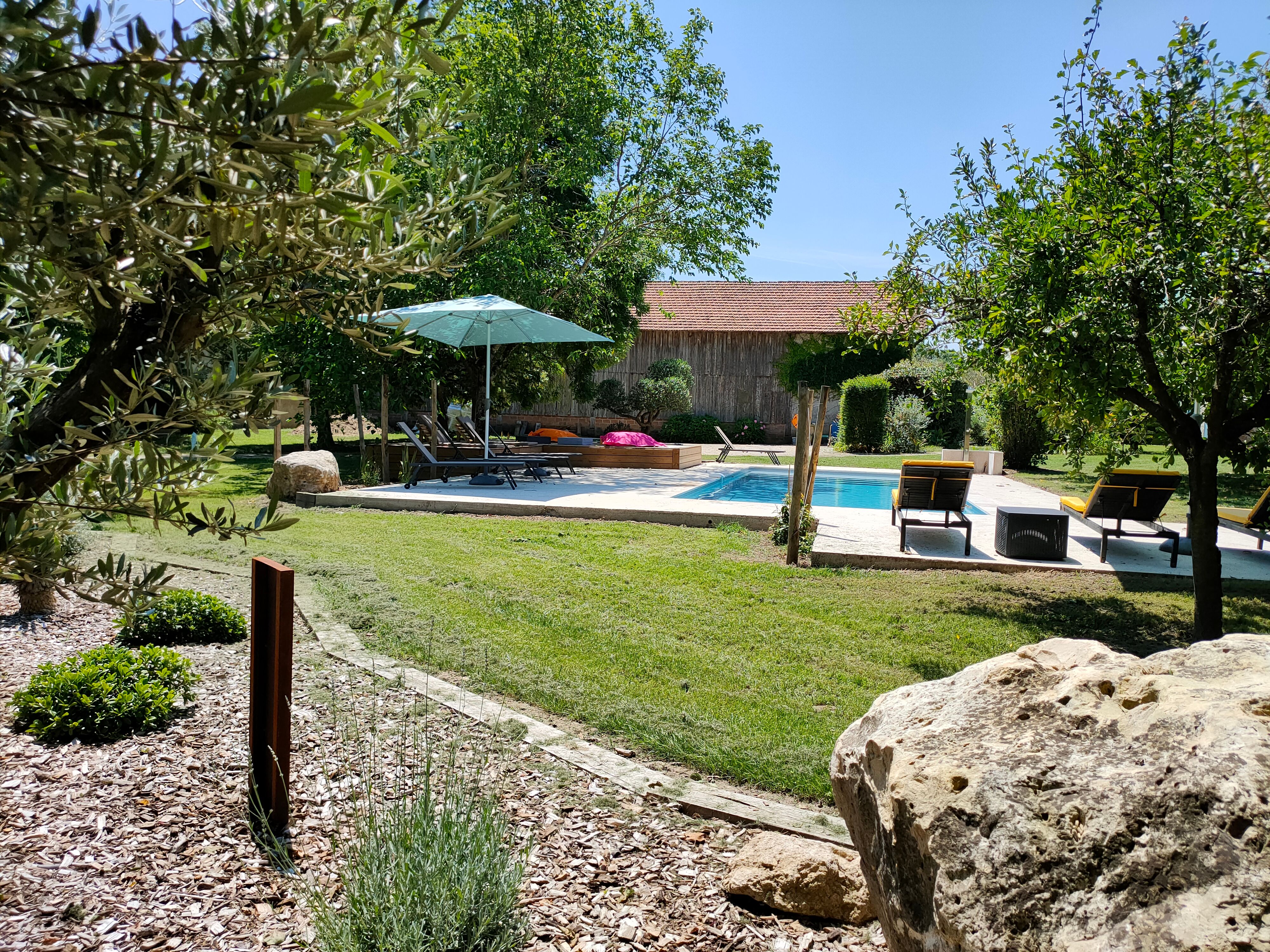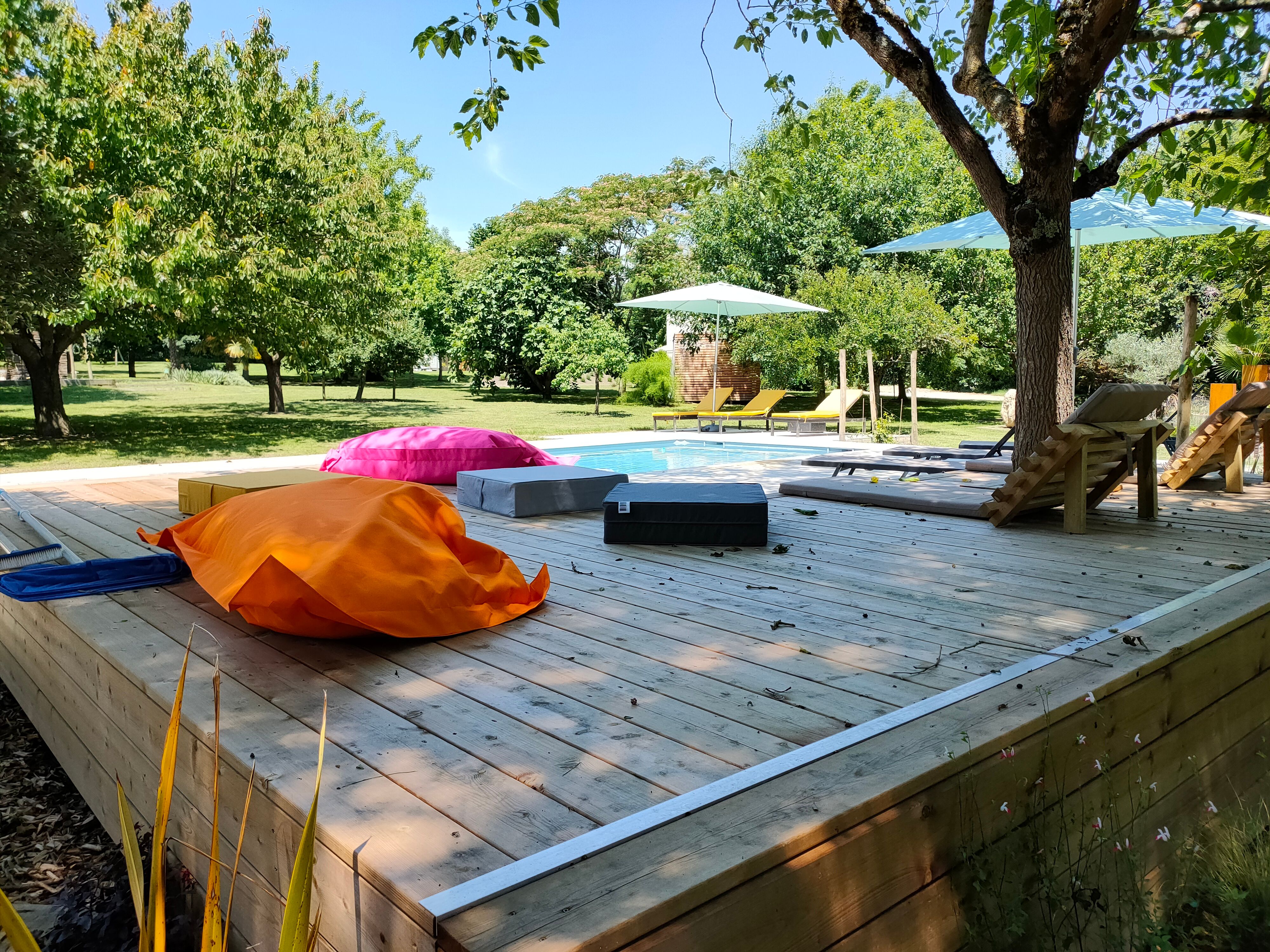 Terrasse privée avec salon de jardin, barbecue, coin lounge, canapé extérieur, parasol et chaises longues. Espace vert privatif. Piscine privée et trampoline, lit d’appoint 1 personne si besoin. Lit et chaise BB possibles