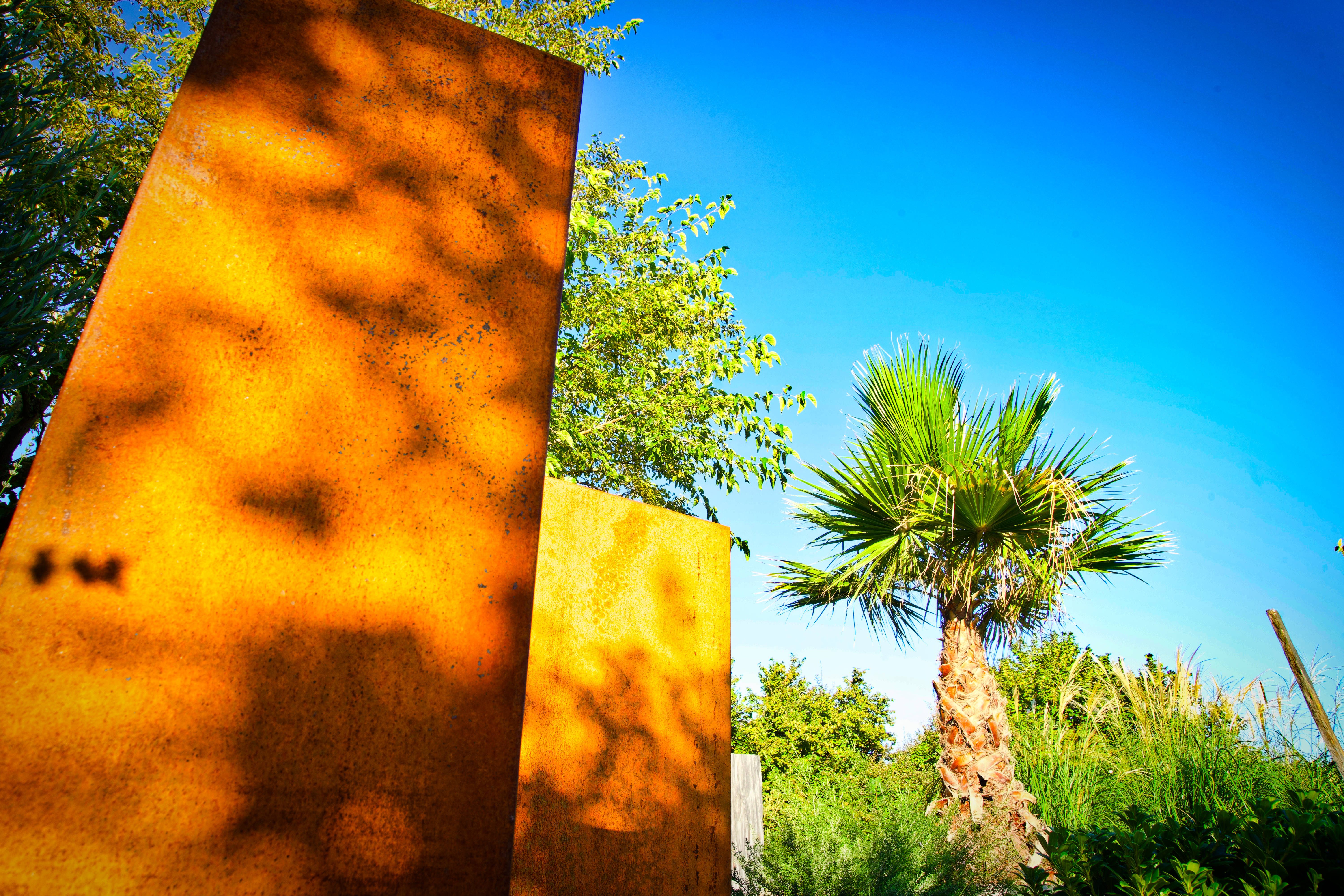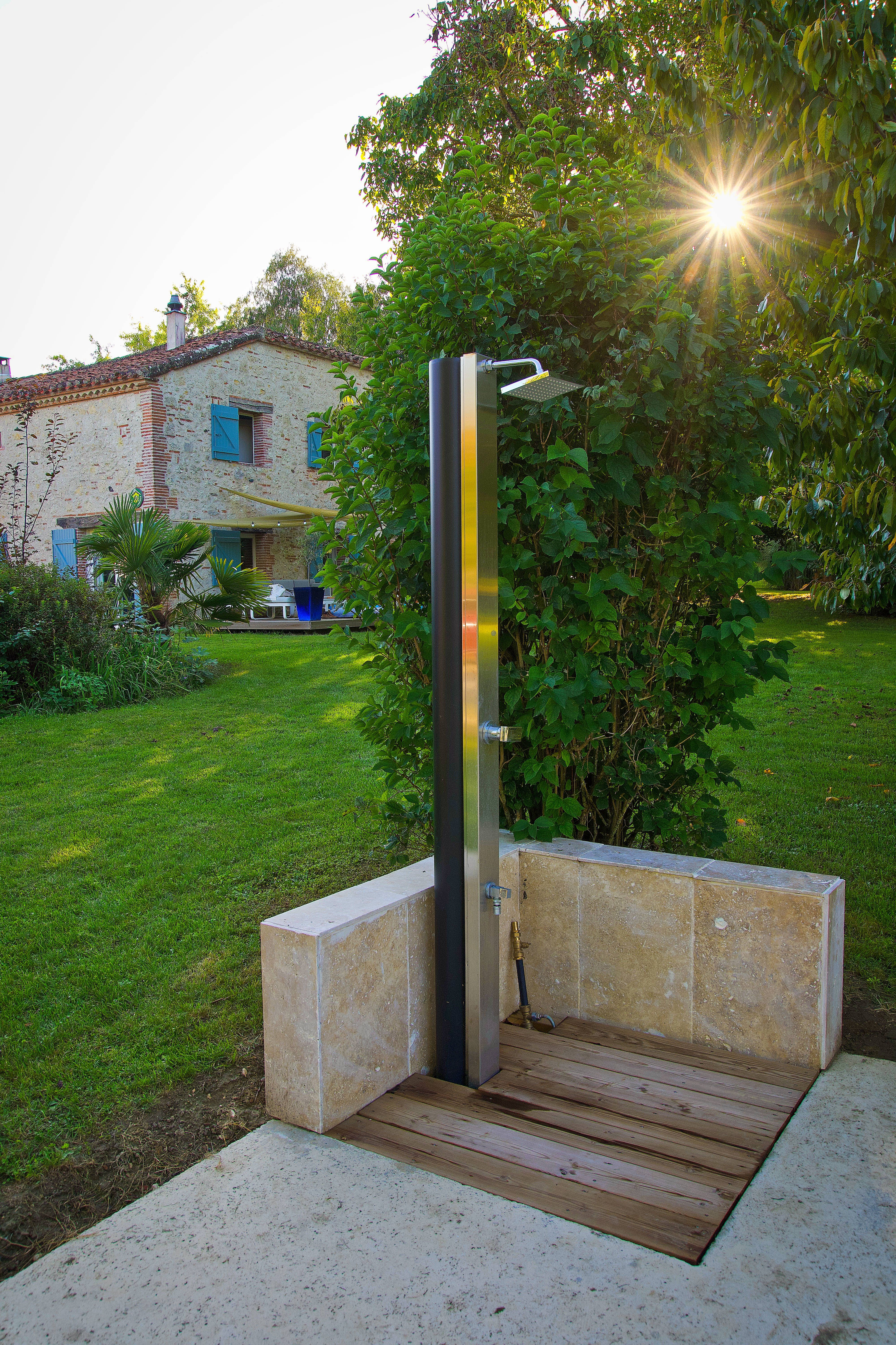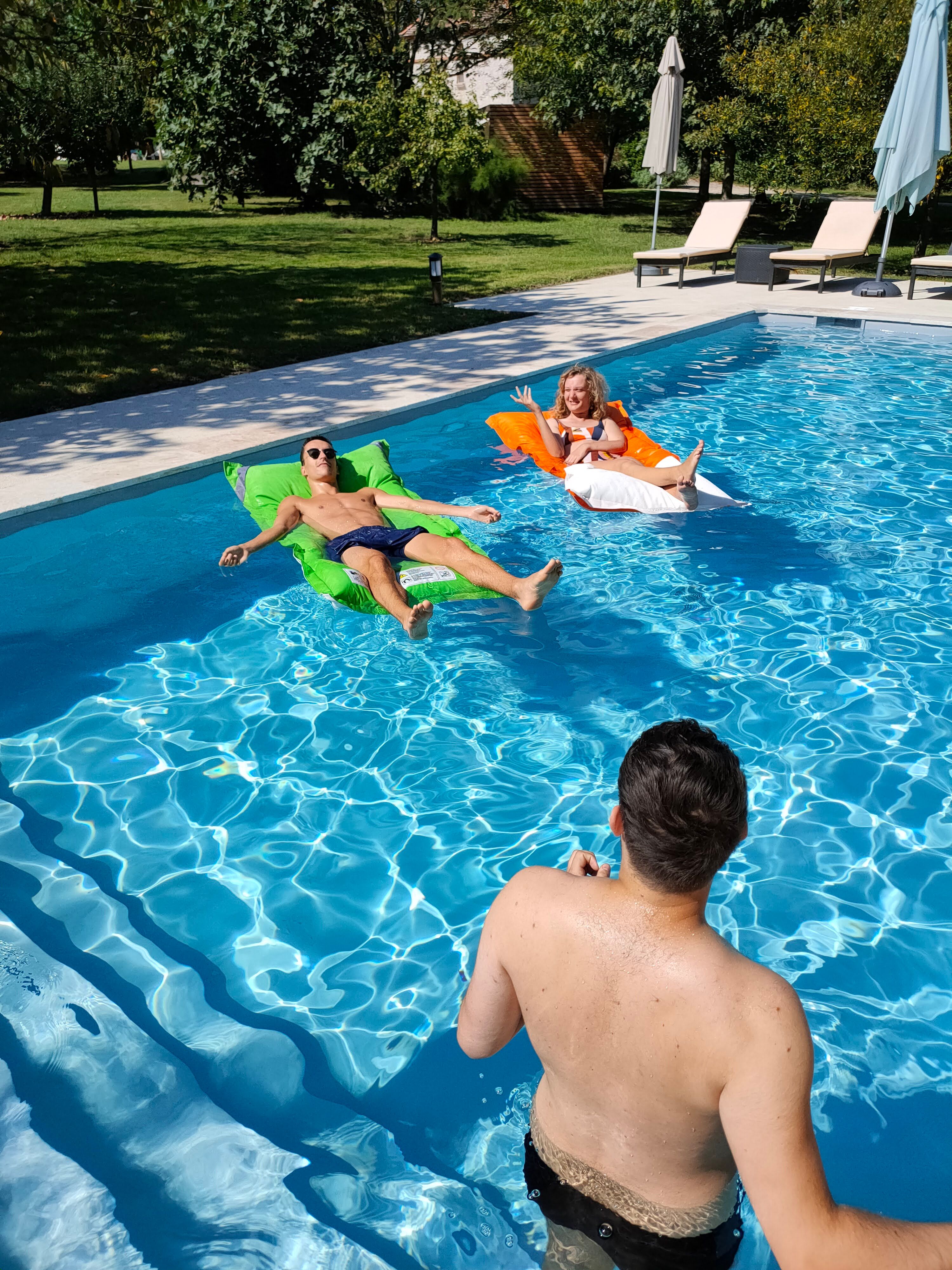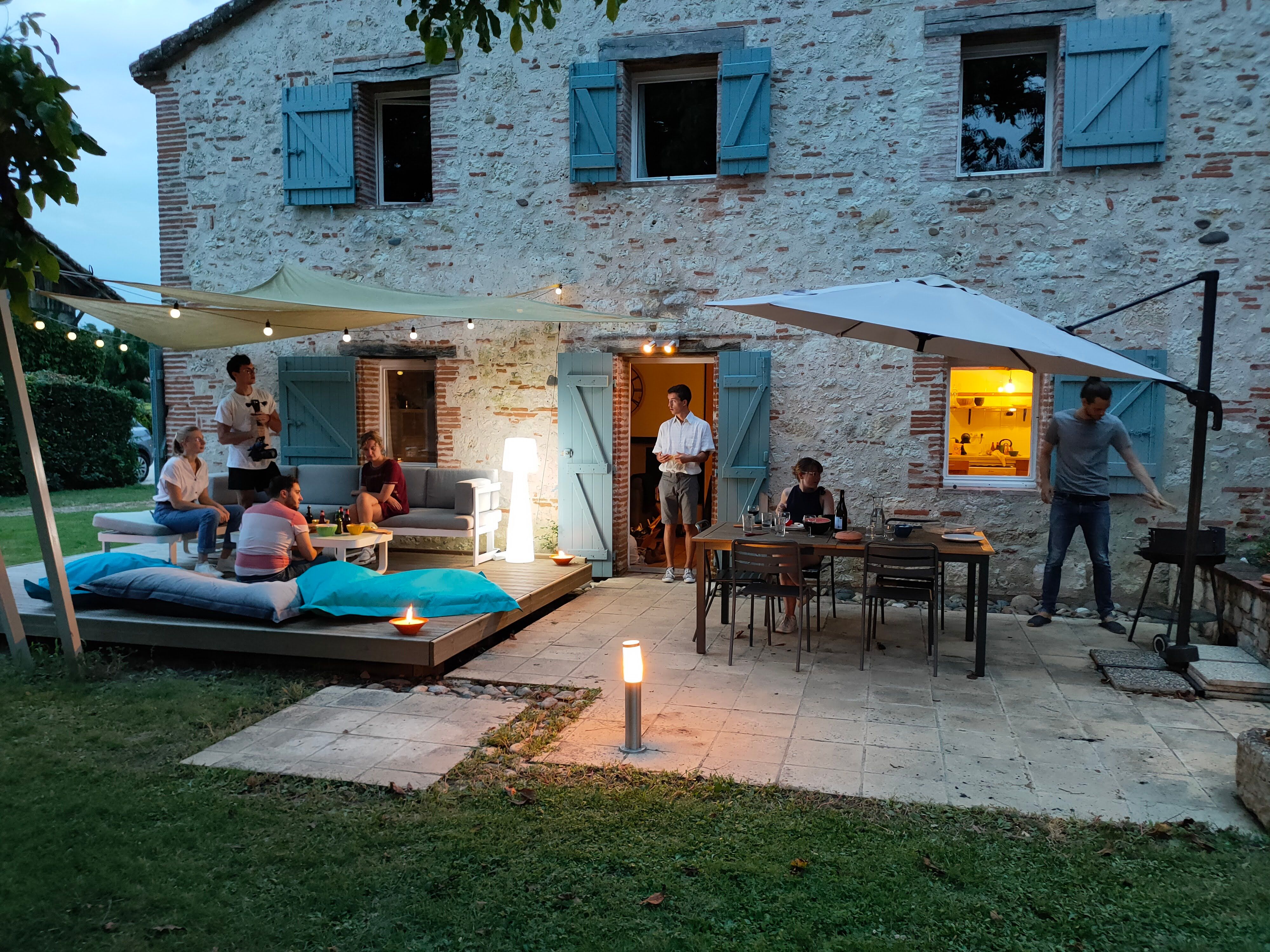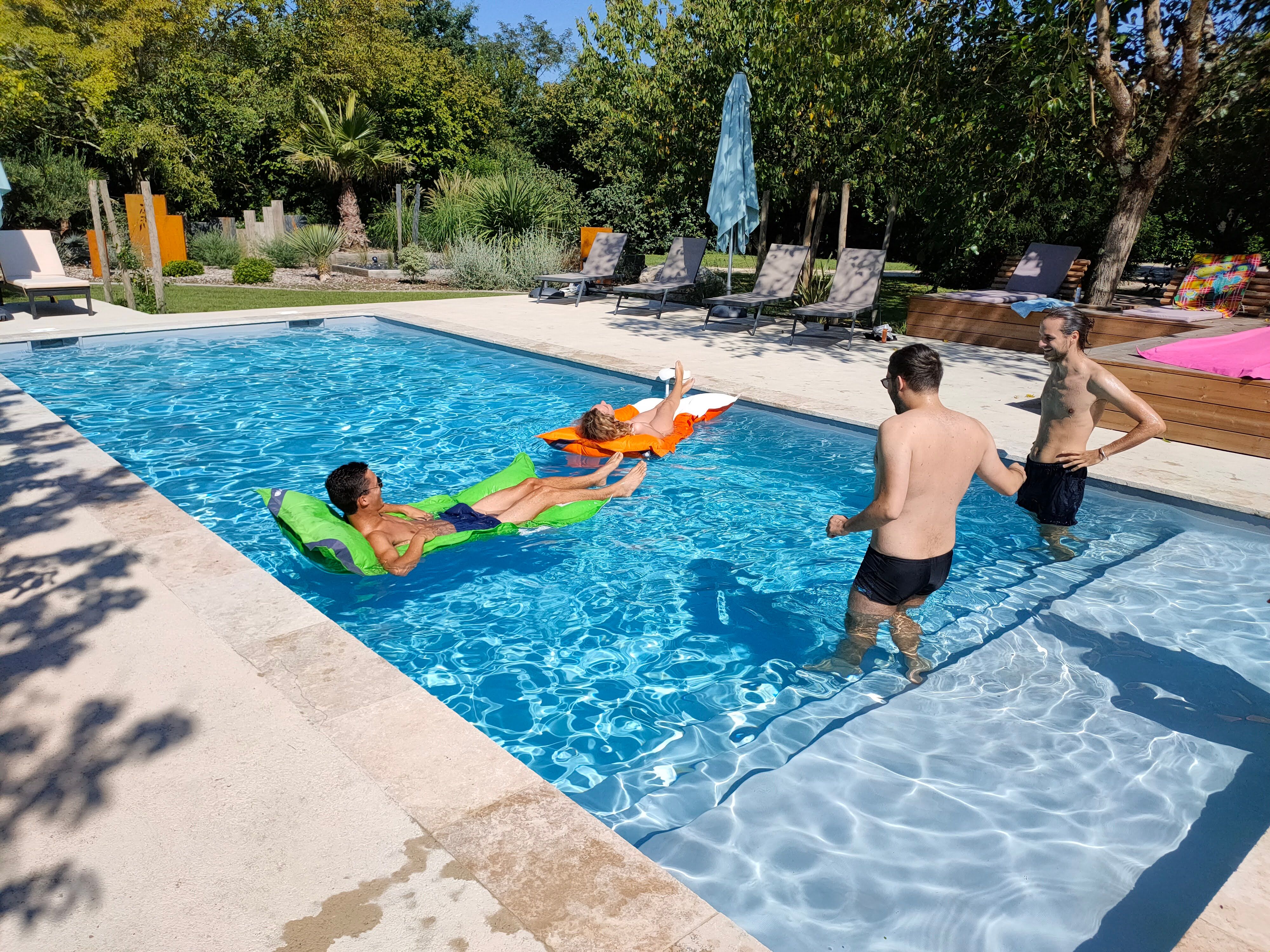 Terrasse privée avec salon de jardin, barbecue, coin lounge, canapé extérieur, parasol et chaises longues. Espace vert privatif. Piscine privée et trampoline, lit d’appoint 1 personne si besoin. Lit et chaise BB possibles