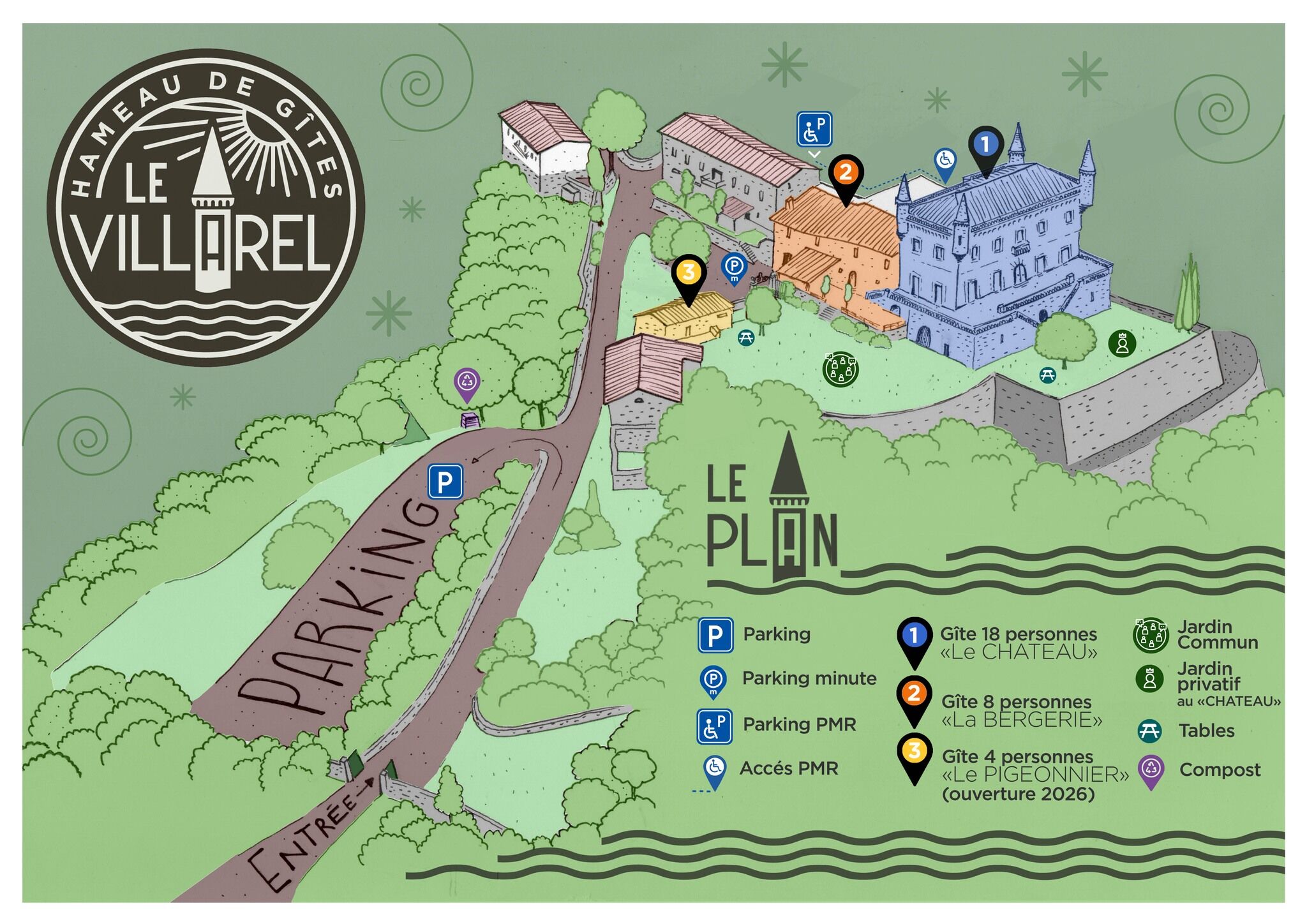 Actuellement, seuls le gîte « Le Château », pouvant accueillir jusqu’à 18 personnes, et le gîte « La Bergerie », pouvant accueillir jusqu’à 8 personnes, sont ouverts à la réservation. Le gîte « Le Mazet » (4 personnes) ouvrira courant 2026.
