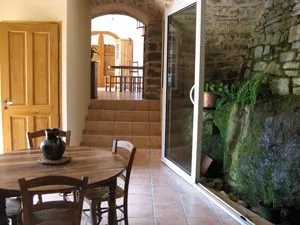 Dans le salon, à l’abri d’une baie vitrée, la roche qui affleure, une petite source et des fougères sont mises en valeur par un bel éclairage.
