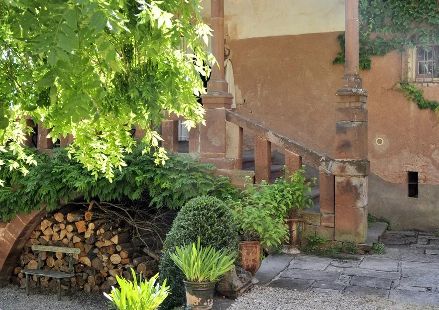 Escalier sous porche et le bois qui vous attend pour une bonne flambée – © Gîte La Contie