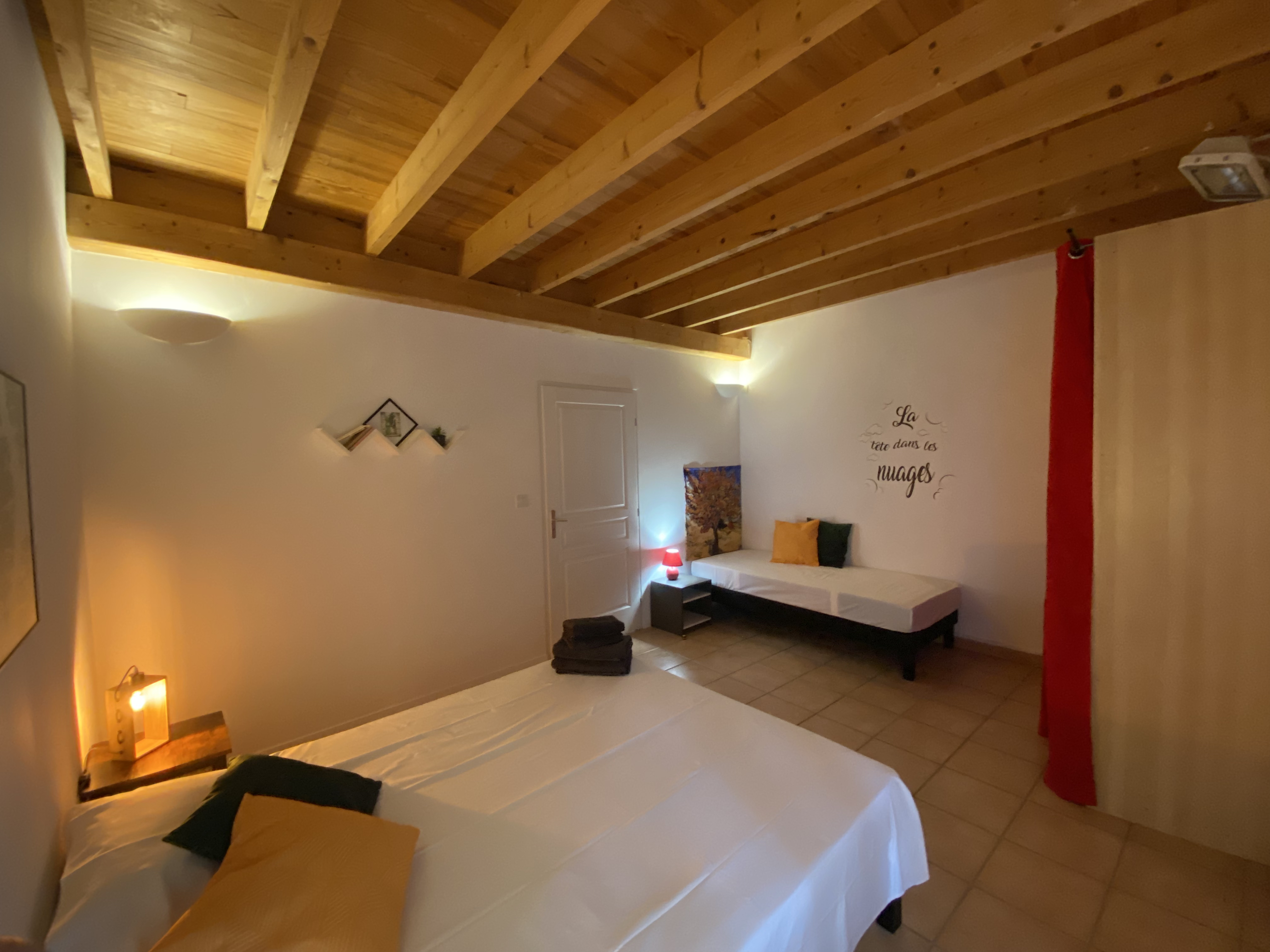 Le Mûrier : appartement spacieux de 132 m² pour 10 personnes sur 2 niveaux dans la magnanerie historique. Au 1er étage : grand salon / salle à manger ouvert avec poêle, 2 chambres, salle de bain moderne. Au 2ème étage, la mezzanine s’ouvre sur un salon confortable équipé de 5 canapés-lit pouvant être utilisés comme salon ou espace de couchages selon les besoins.