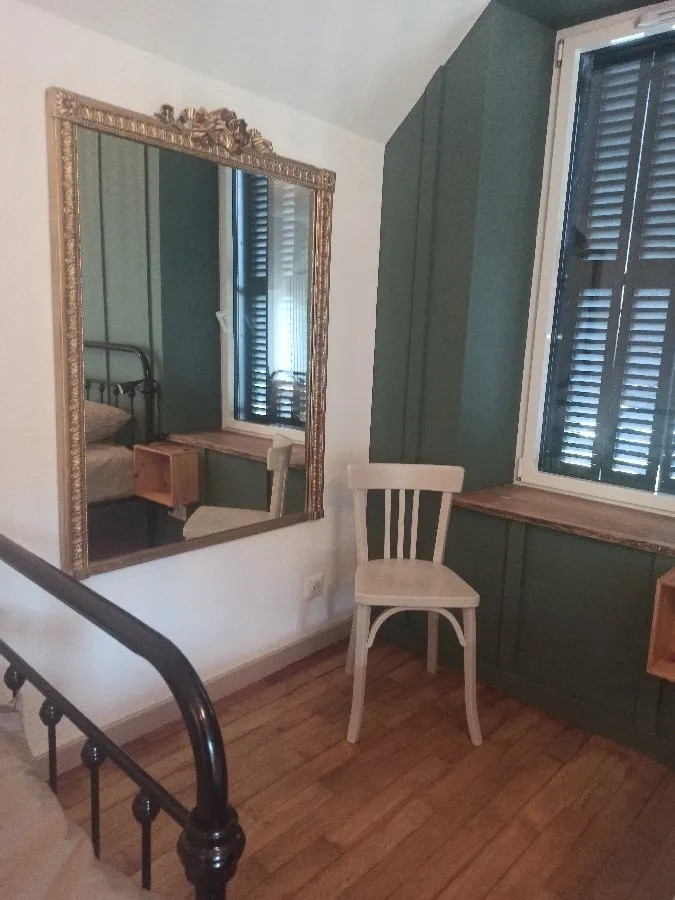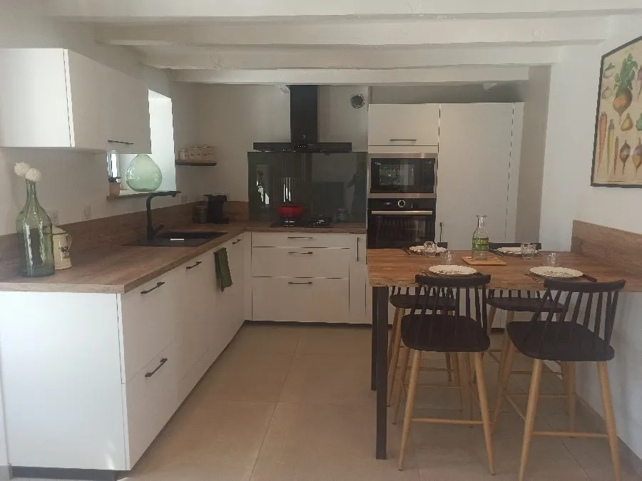 L’espace à vivre est au rez-de-chaussée, un confort maximal avec une cuisine équipée avec une décoration épurée et chinée par la propriétaire.