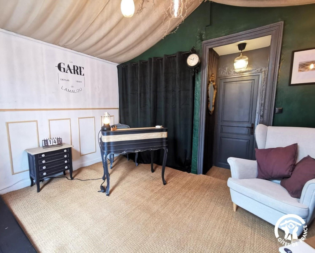L dispose d’une agréable entrée, décorée sur la thématique ferroviaire comme l’ensemble de la maison, où vous serez accueillis chaleureusement par vos hôtes et où vous pourrez vous renseigner sur les activités et prestations proposées aux alentours de l’hébergement. En suivant, vous disposerez d’une pièce commune salon et cuisine avec un agréable canapé devant la télévision et une cuisine bien équipée avec micro-ondes, réfrigérateur avec compartiment congélateur et tout le nécessaire de cuisine. Cette pièce est également la salle où vous prendrez les petits-déjeuners servis par vos hôtes, des petits-déjeuners complets et divers (au choix, plusieurs types de petits-déjeuners : petit-déjeuner typique français, petit-déjeuner britannique…) : croissants, pains au chocolat, pains, fromage et yaourts, œufs, jus de fruits et café sont au menu, et même de petits gâteaux faits maison ! La maison d’hôtes dispose également d’un bel extérieur rappelant l’ancienne gare, avec piscine ainsi que divers espaces pour vous détendre sous le soleil de l’Hérault ! Fauteuils, hamacs, chaises longues, bancs, table à manger sont mis à disposition, le tout dans un écrin de verdure à deux pas de la voie verte juste derrière le portail du jardin de La Gare de Lamalou ! La chambre d’hôtes dispose de places de parking privatives juste devant la maison. Attractions touristiques : Si vous êtes d’humeur sportive, ne manquez pas de faire une balade à vélo ou une randonnée le long de la voie verte qui passe juste derrière le jardin du gîte, et profitez d’un moment de détente dans un écrin de verdure autour de la voie verte. Offrez-vous également une expérience bien-être inoubliable aux Thermes de Lamalou-les-Bains. Profitez des cures thermales réputées pour leurs bienfaits sur la santé, où l’eau thermale naturelle est mise à profit pour ses propriétés curatives. Découvrez ensuite le patrimoine historique de la région en visitant par exemple la Chapelle Notre Dame de Capimont à