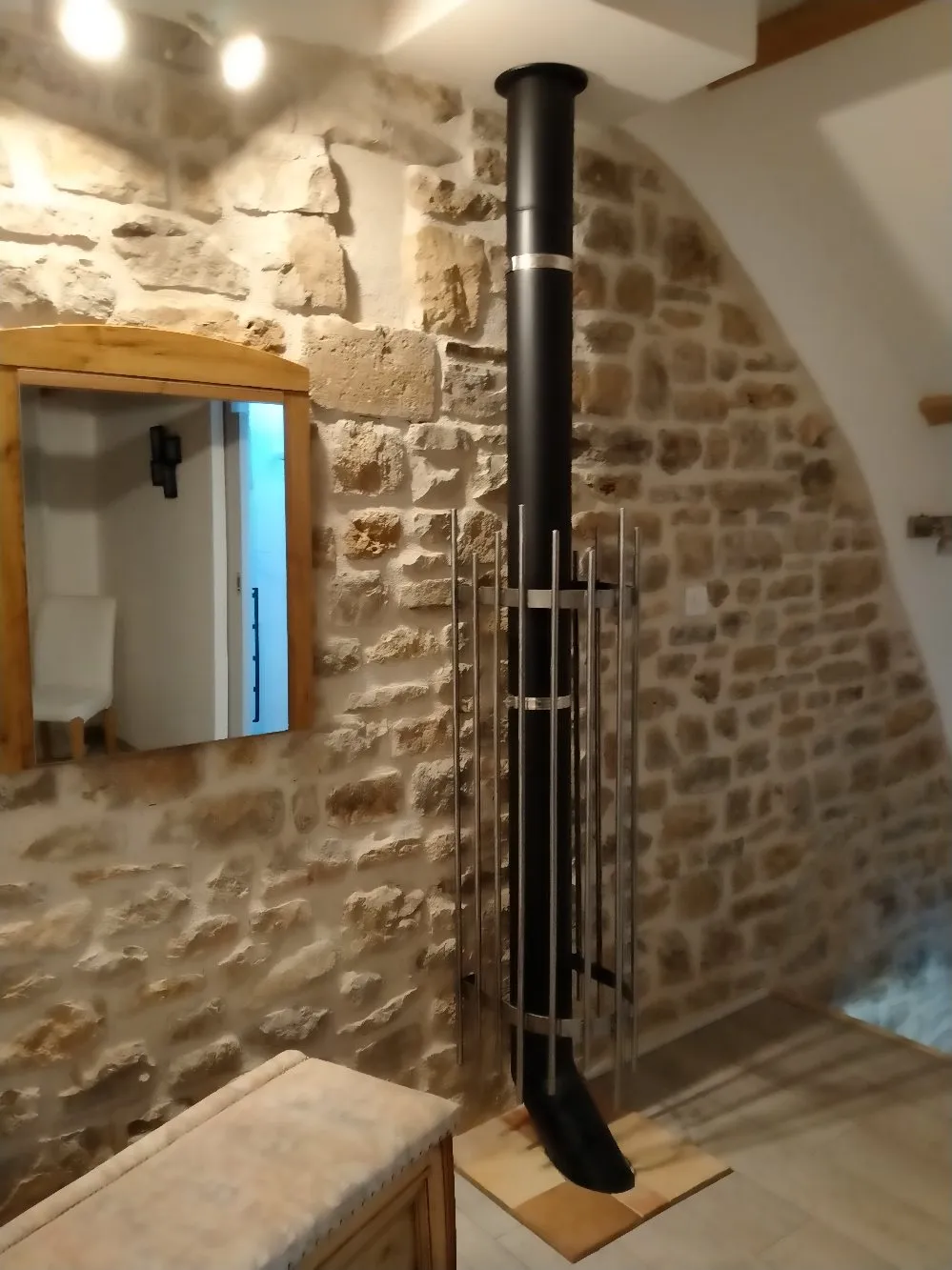 Le rez-de-chaussée se compose d’une cuisine intégrée et d’un coin salon avec un poêle à bois.
