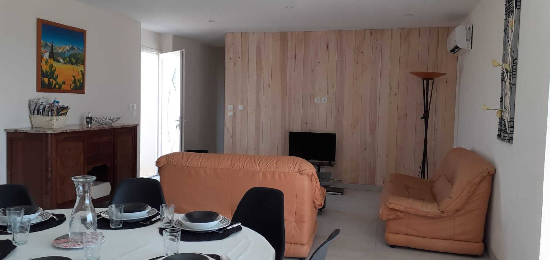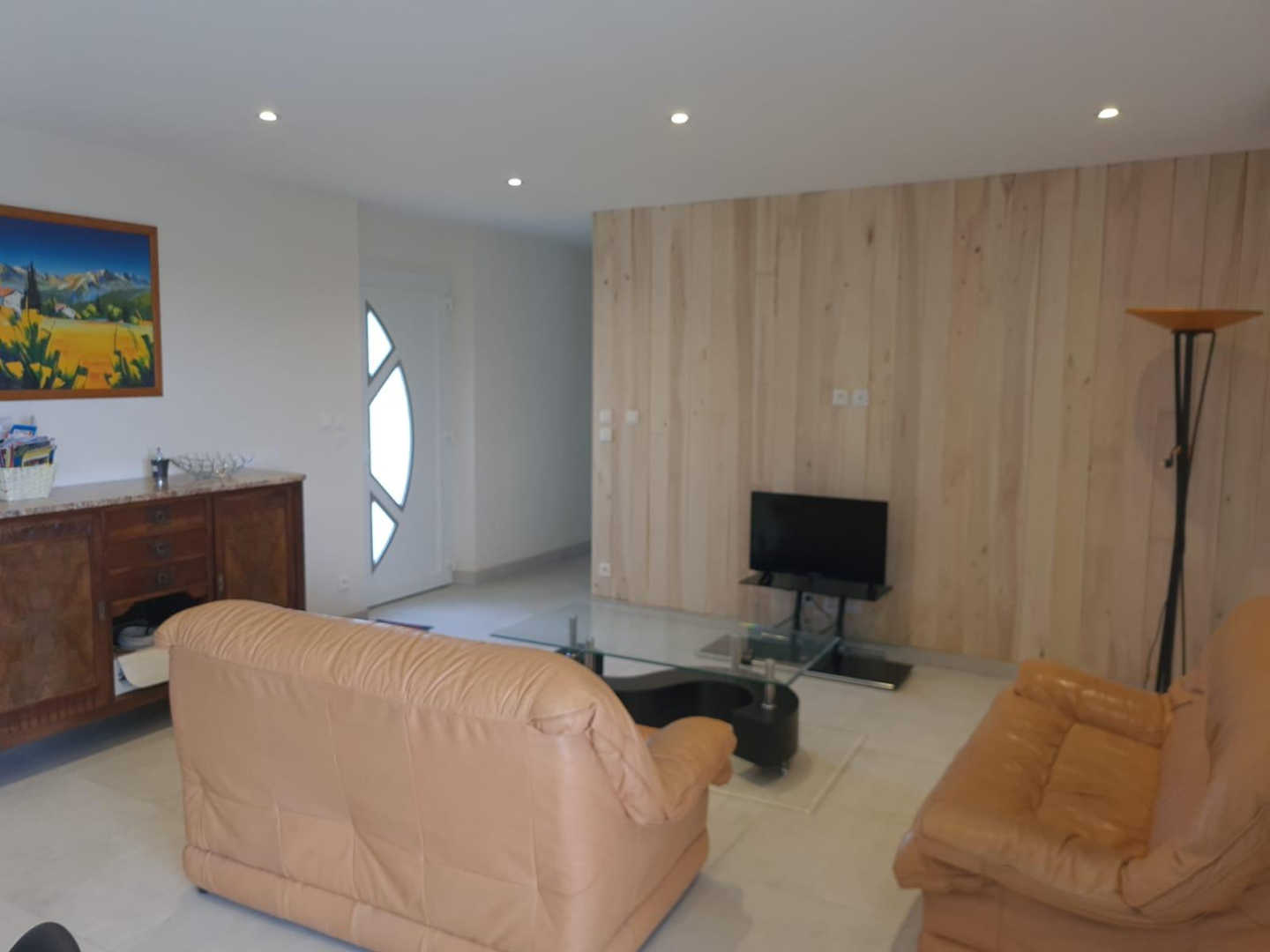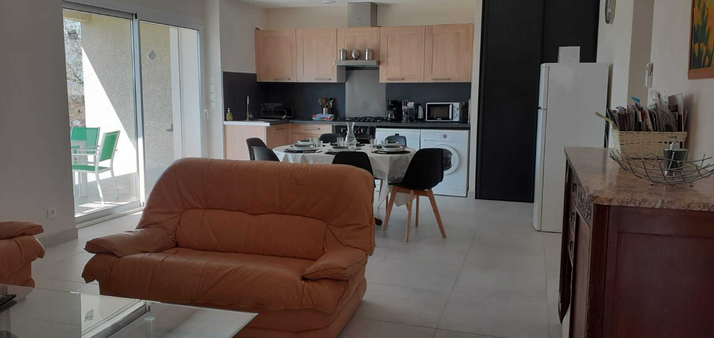 Pièce à vivre avec cuisine ouverte toute équipée, 3 chambres.
