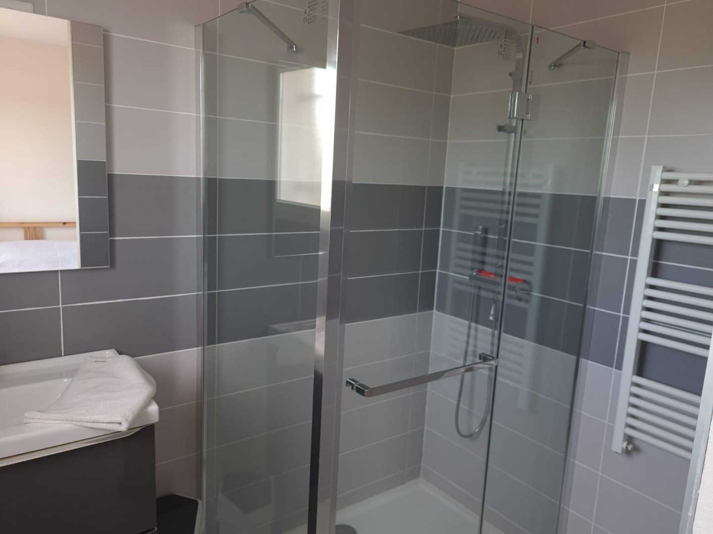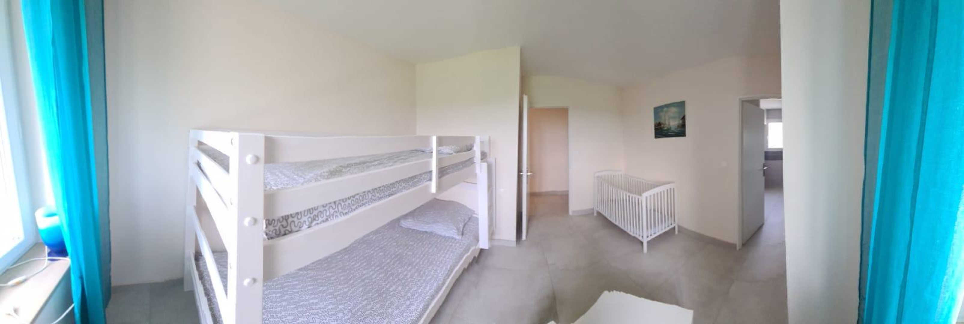 La première avec un lit double 140×190 et salle d’eau privative, une autre avec lit double 140×190, la dernière avec deux lits simples 90×190 superposés. Ces deux chambres partagent une salle d’eau.