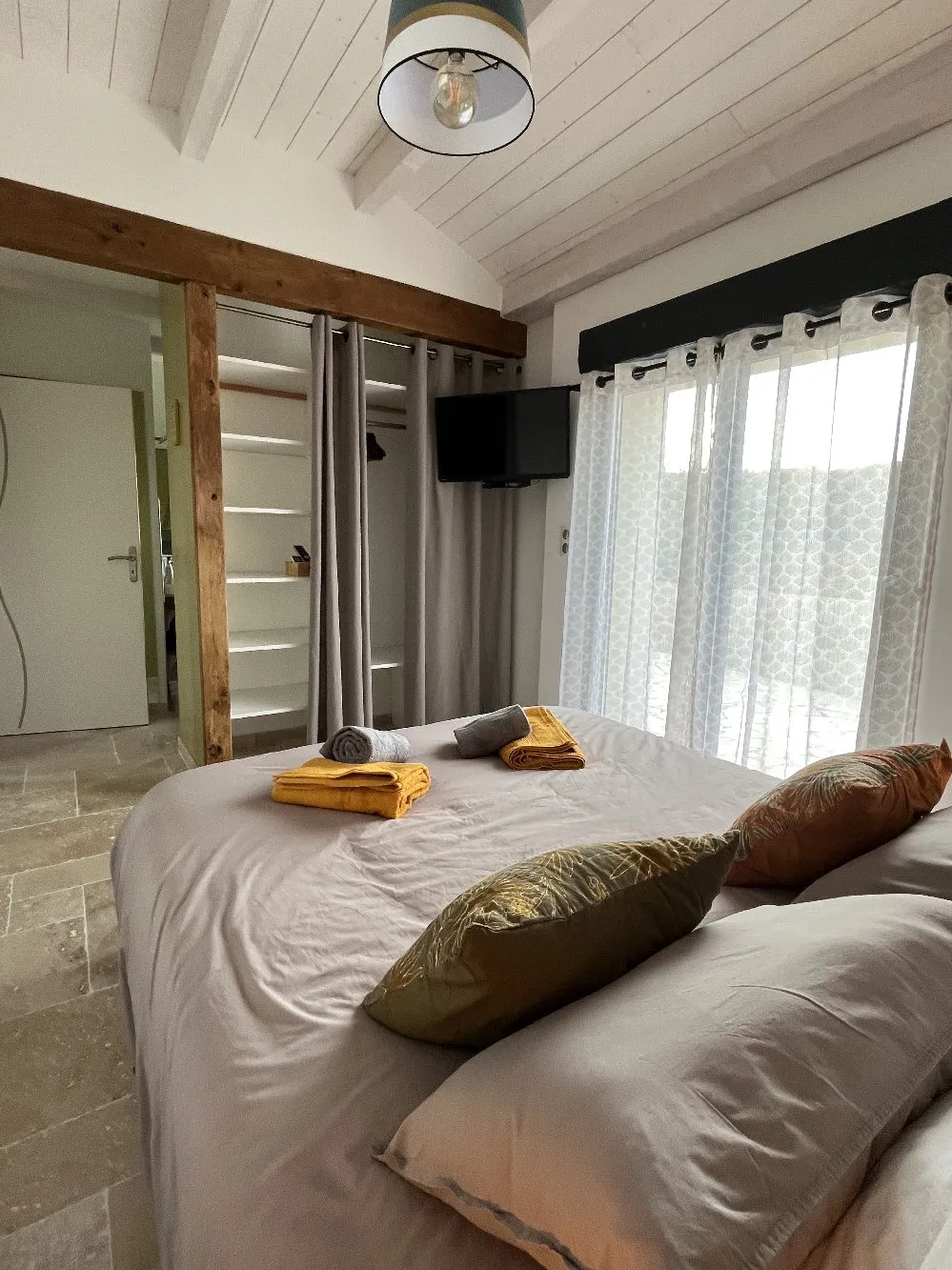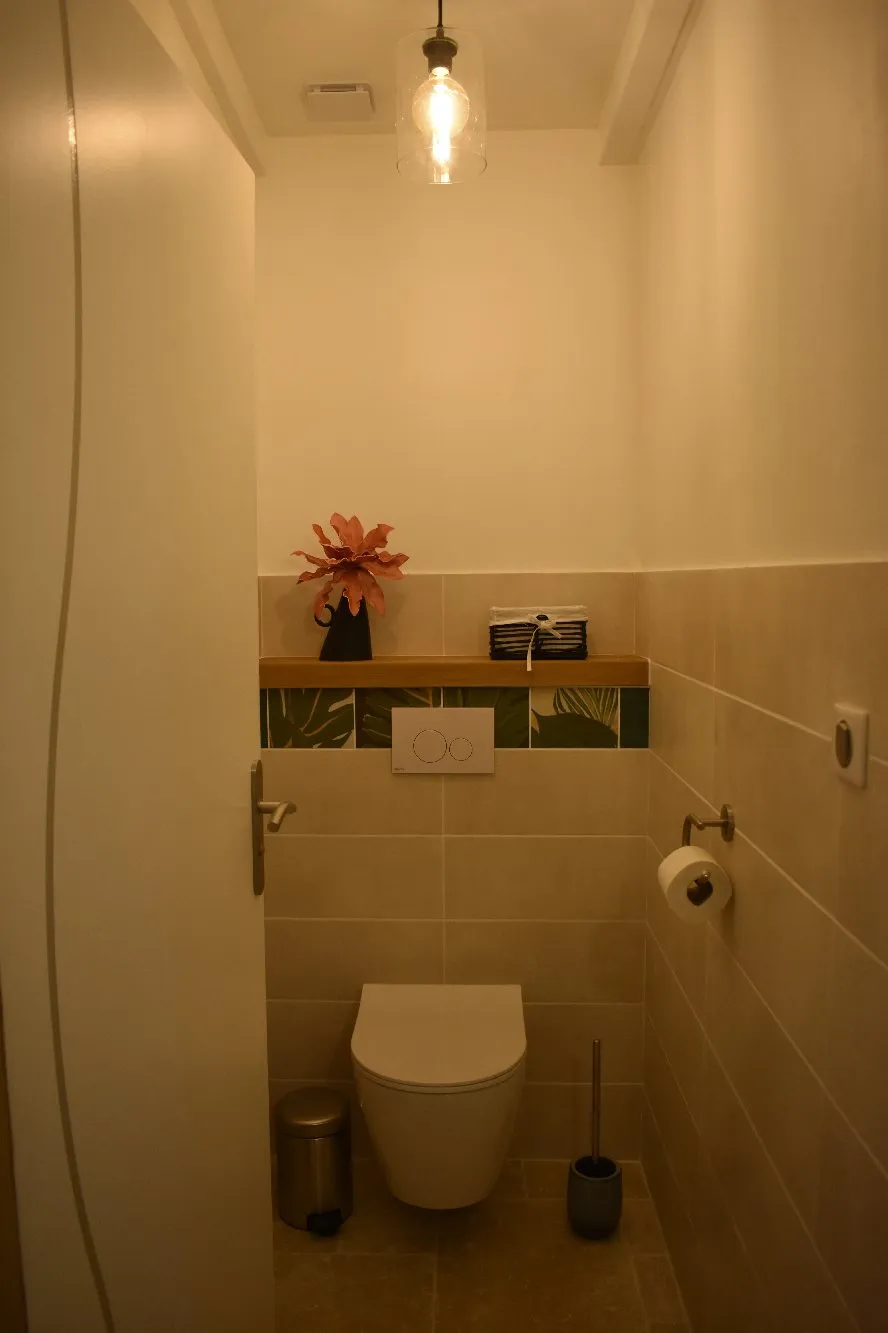 Gîte d’une surface de 61 m² climatisé composé d’un coin séjour avec canapé, TV écran plat, un coin repas, un coin cuisine tout équipé (lave-vaisselle, four, micro-ondes, cafetière filtre et cafetière senséo, vaisselles, frigo, congélateur, plaques de cuisson gaz, lave-linge), une chambre avec 1 couchage en 160, une salle d’eau/WC avec cabine de douche, un wc de plus indépendant, une suite parentale avec lit en 160, rangements, TV, salle d’eau avec douche à l’italienne attenante, une petite terrasse.