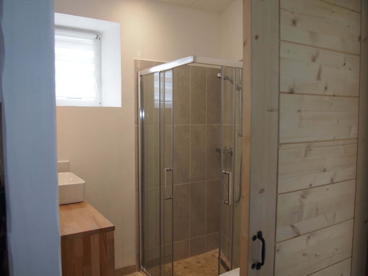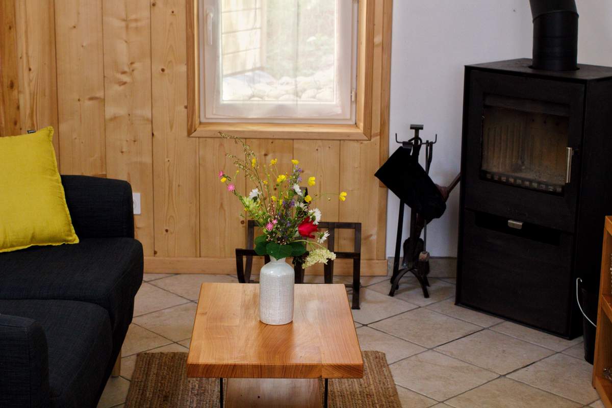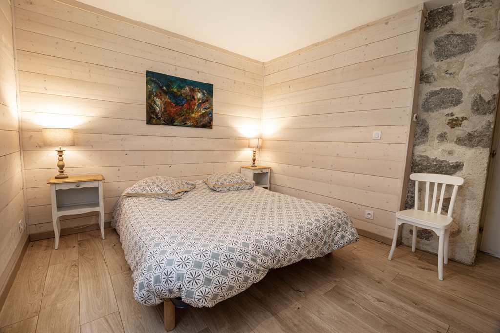 Gite de plain pied, salon avec poêle à bois, espace repas et cuisine intégrée, salle d’eau ,1 chambre avec 1 lit (160 cm). Chauffage électrique,