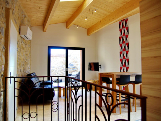 Un escalier intérieur vous emmène à l’étage sur une cuisine ouverte à l’ allure scandinave entièrement équipée : plaques induction, mini-four, réfrigérateur/congélateur, lave-vaisselle, cafetière et bouilloire électriques, lave linge ainsi que toute la vaisselle, plats et ustensiles de cuisine. Un séjour avec canapé et TV.