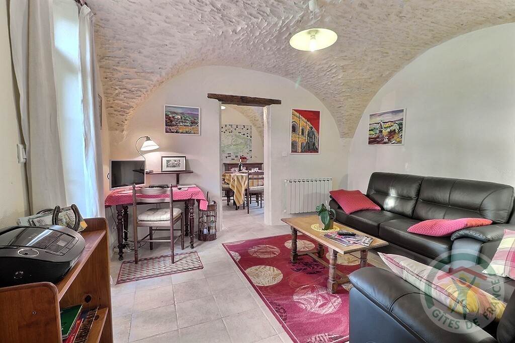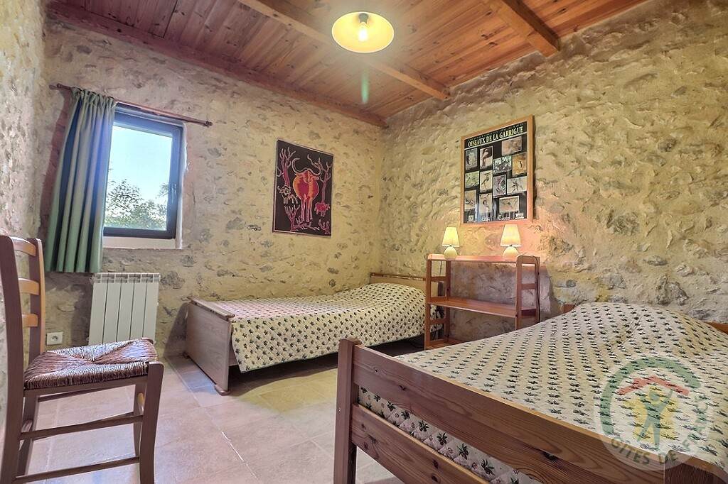 Environnement de Mas. Mitoyen avec logement du propriétaire. Cuisine, salon, 2 chambres, salle d’eau avec wc, terrain clos, terrasse, espace extérieur sans vis à vis, salon de jardin, parking, four combiné, lave-vaisselle, lave-linge, TV, Wi-Fi, piscine privée commune (12m x 6m), ouverte du 15 Mai au 30 Septembre. Couchages : 1 lit en 160 + 2 lit 1 pers. Ping-pong / pinède / Plancha à gaz sur la terrasse. Taxe de séjour en sus. Dans un environnement sauvegardé (30 ha en agriculture biologique dans le site classé des Gorges du Gardon), le Mas de Gasc est un havre de paix et de dépaysement pour amoureux de la Nature. Vieux de plusieurs siècles et restauré avec soin, il a su garder son âme d’antan. Les pierres apparentes et les voûtes contribuent à en faire un lieu où il fait bon vivre. Régine et Jean-Denis (Eco-Acteurs de la réserve de Biosphère des Gorges du Gardon) seront heureux, si vous le souhaitez, de vous aider à mieux connaitre leur région, sa flore et sa faune particulièrement riche sur le plan ornithologique. Idéal pour le farniente au bord de la piscine ou sous les pins séculaires, idéal aussi pour visiter cette si belle région du sud de la France, entre mer et montagne et au passé prestigieux.