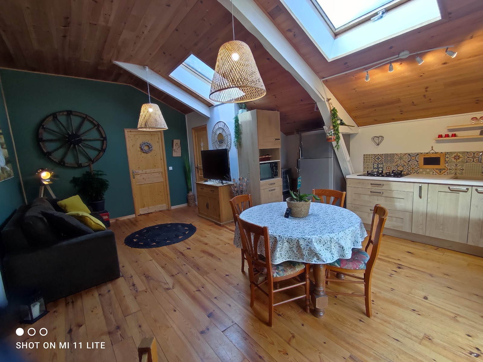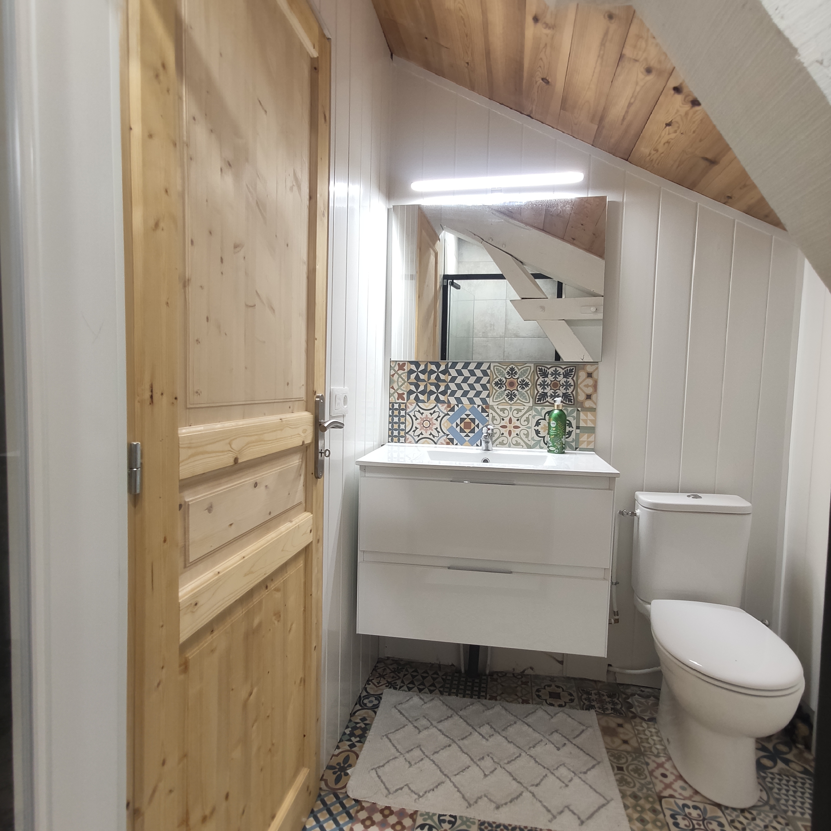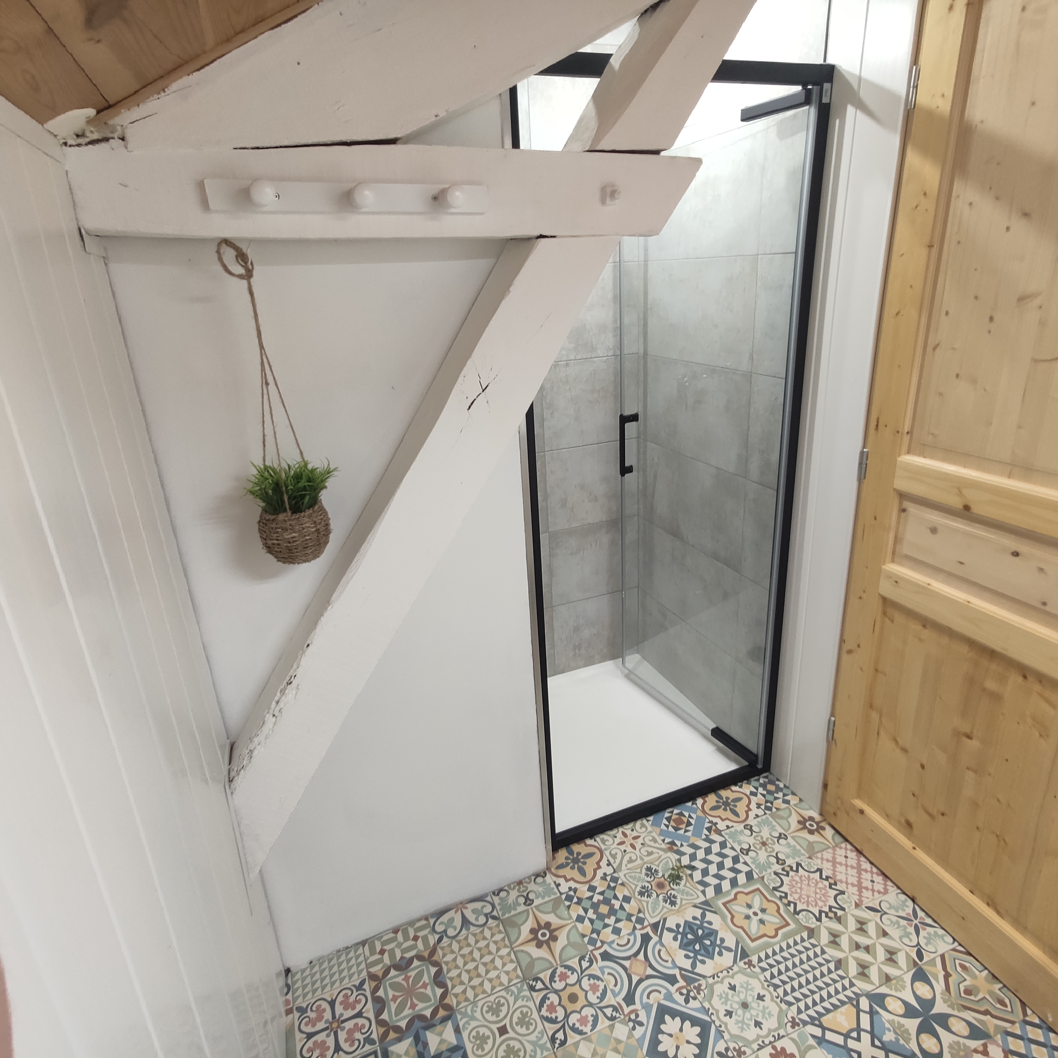 Composé d’une chambre avec une salle d’eau avec douche et wc, une jolie pièce à vivre avec cuisine aménagée et salon.