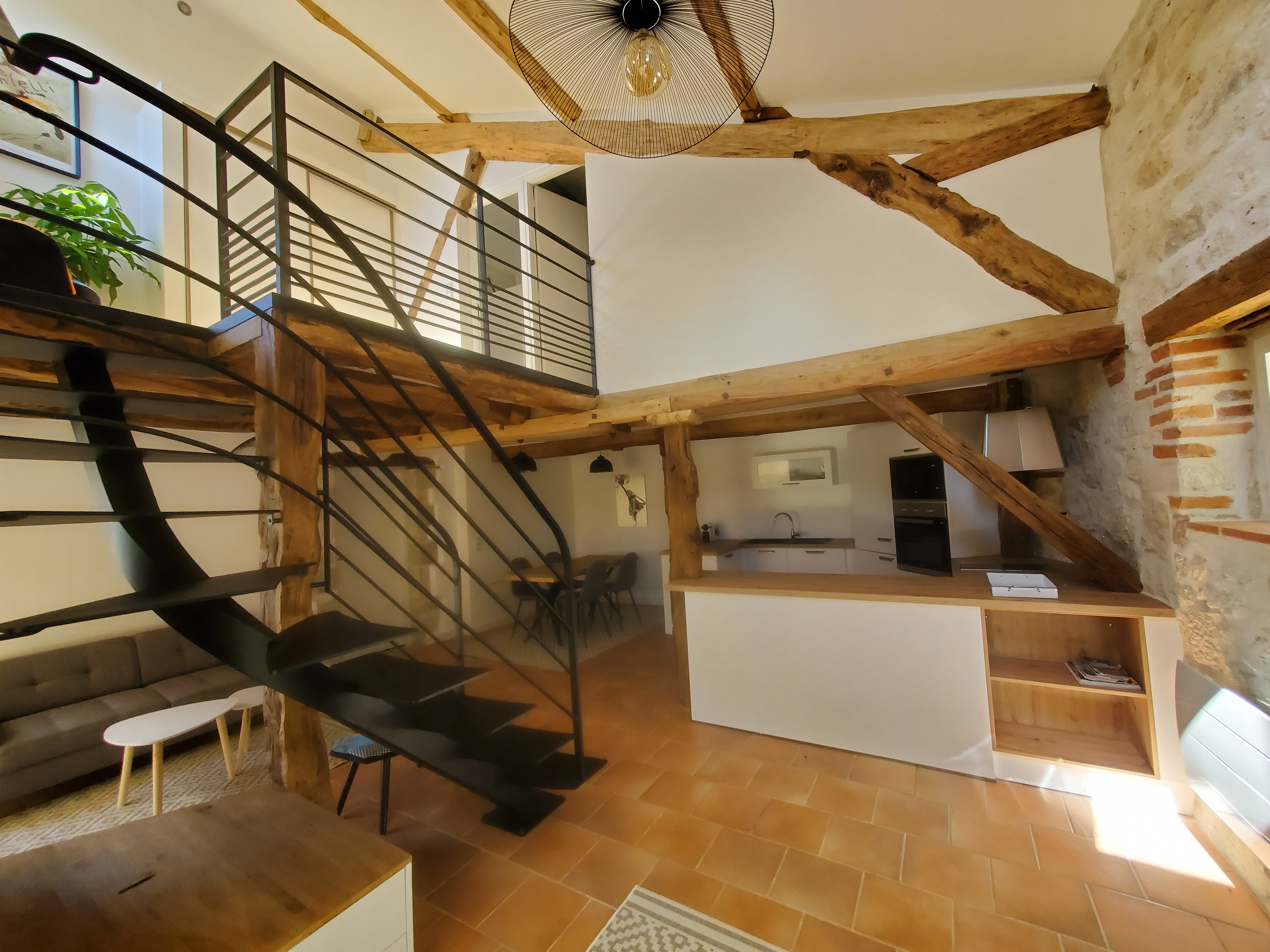 une pièce de 35 m² comprenant un coin salon avec TV écran plat connecté et une barre de son, salle à manger et une cuisine entièrement équipée (four, micro-ondes, plaque à induction, hotte aspirante, réfrigérateur avec compartiment congélation, lave vaisselle, lave linge, bouilloire, grille pain, cafetière ainsi que tout le nécessaire pour cuisiner comme à la maison).