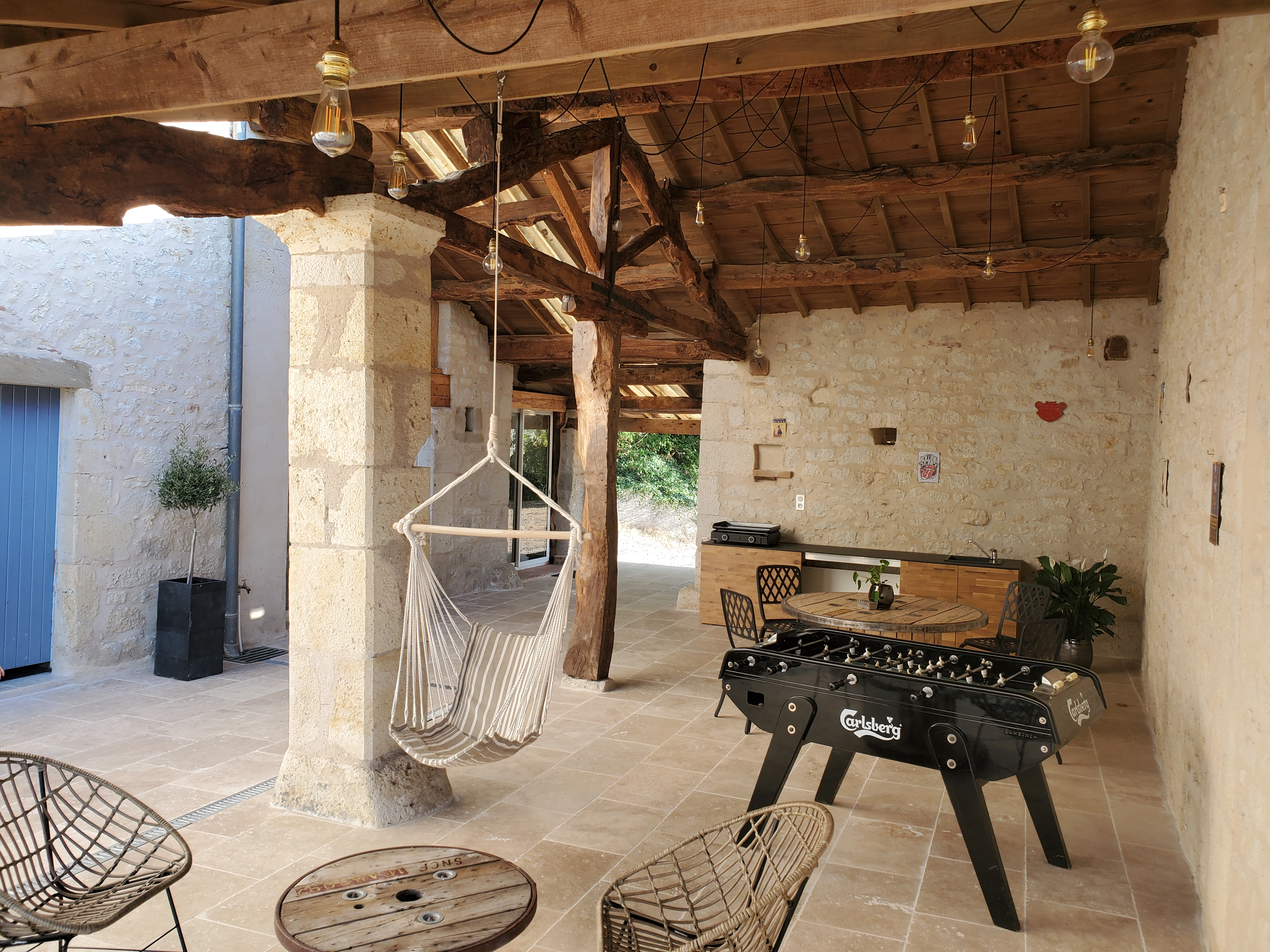 Vous pourrez profiter d’une terrasse couverte de 80m² comprenant une cuisine d’été avec une plancha au gaz, une table à manger et un salon de jardin. Vous pourrez aussi vous relaxer dans le bain nordique à remous privatif quelque soit la saison !