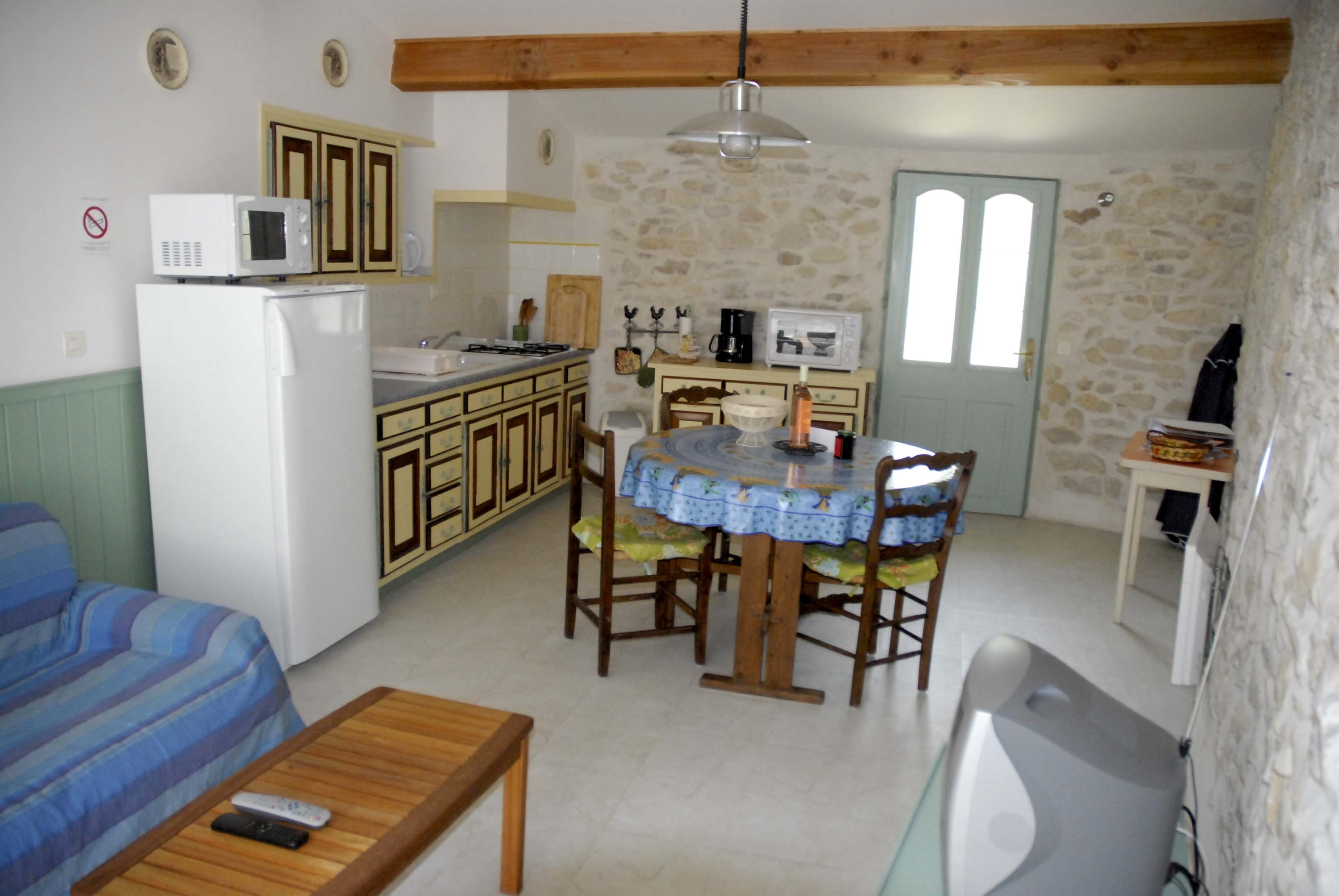 Ce gîte très calme pour 3 personnes est situé sur l’arrière du Mas et comprend une splendide terrasse avec vue sur la piscine et la garrigue, une salle à manger avec coin cuisine équipée, une salle d’eau avec grande douche, un WC séparé, deux chambres dont une donnant sur la terrasse.