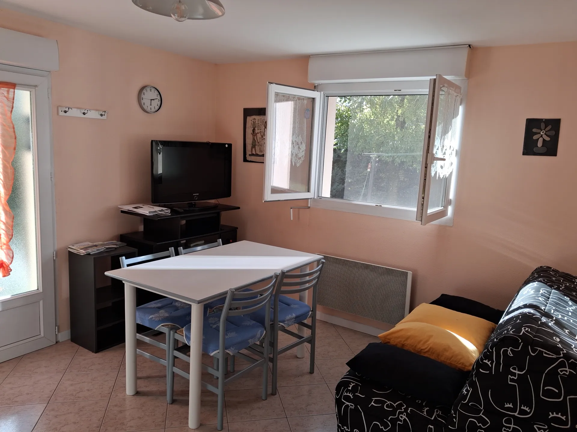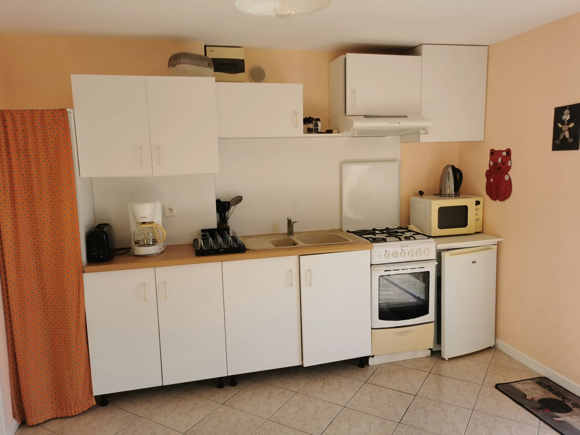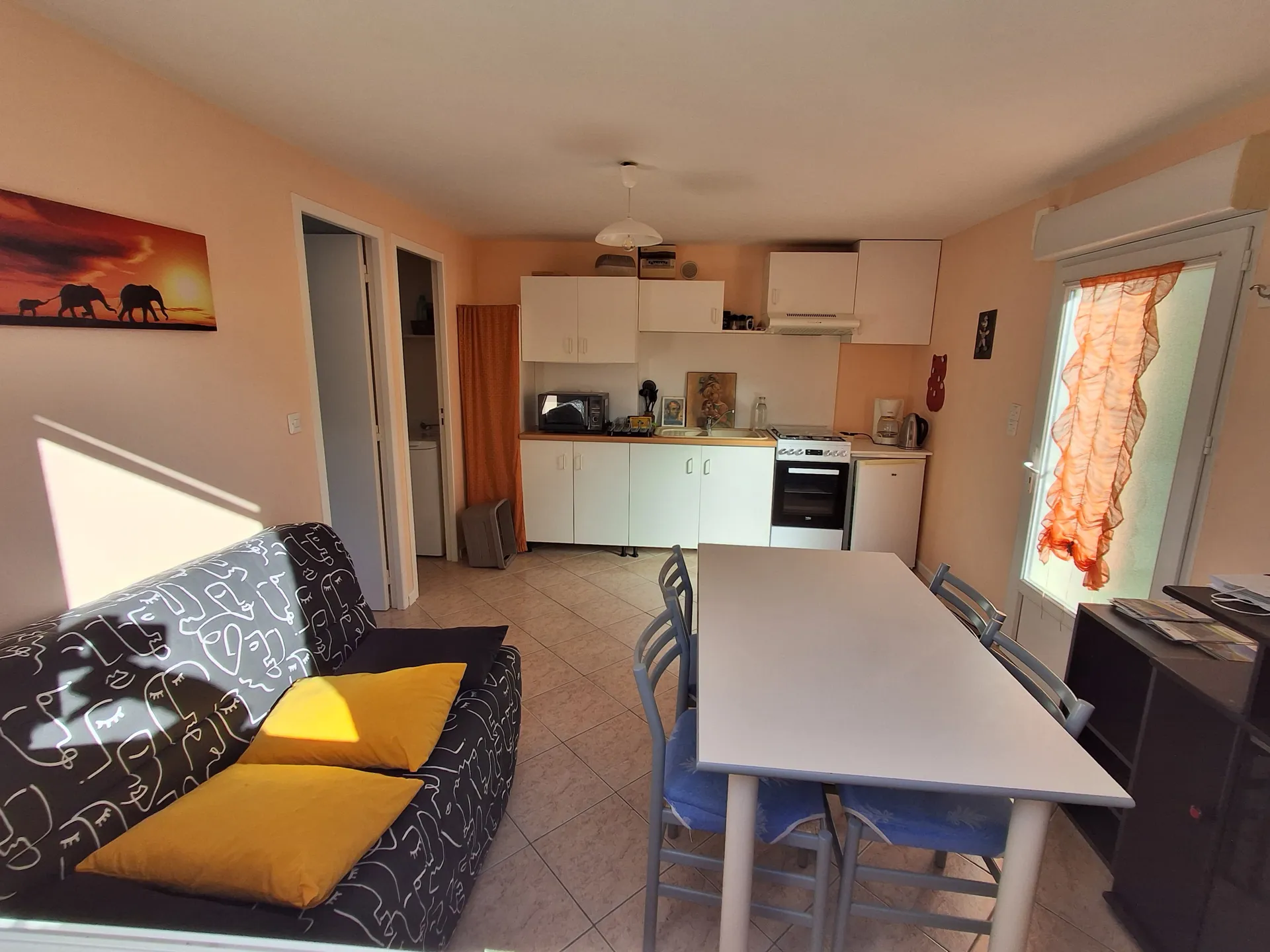 La pièce de vie rassemble un séjour convivial et un coin cuisine équipé de l’essentiel pour préparer vos repas. La chambre dispose d’un lit en 140 x 190 cm.
