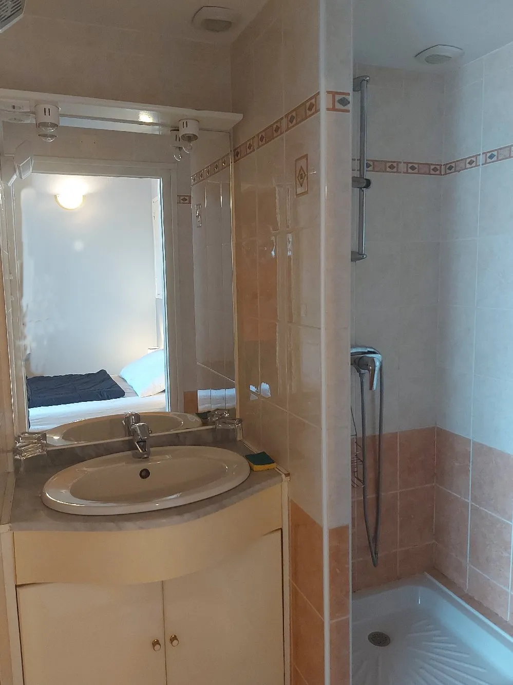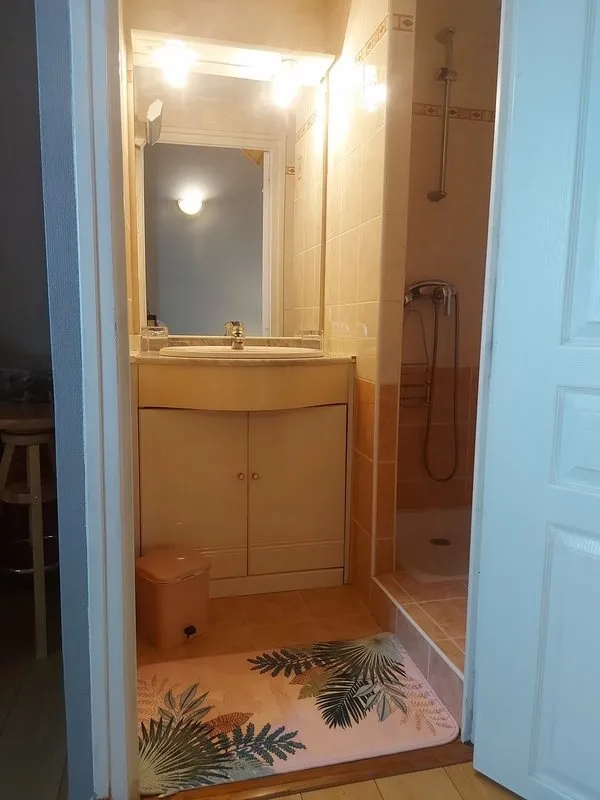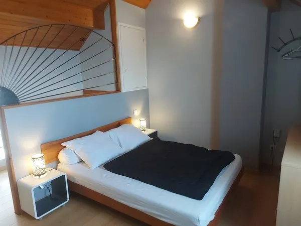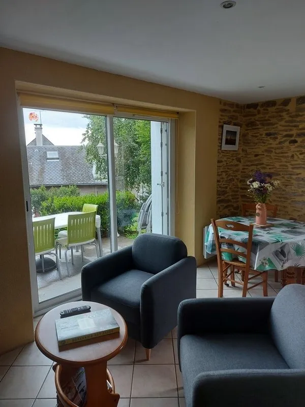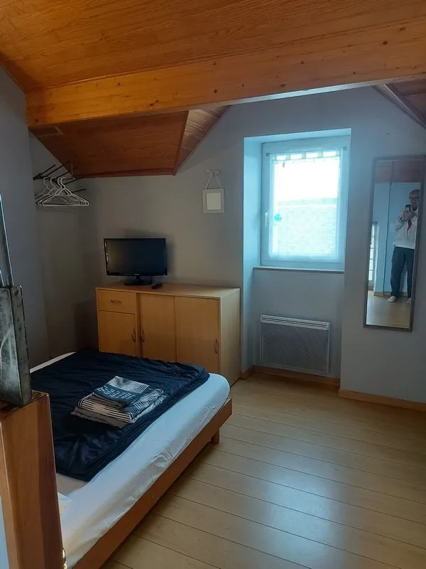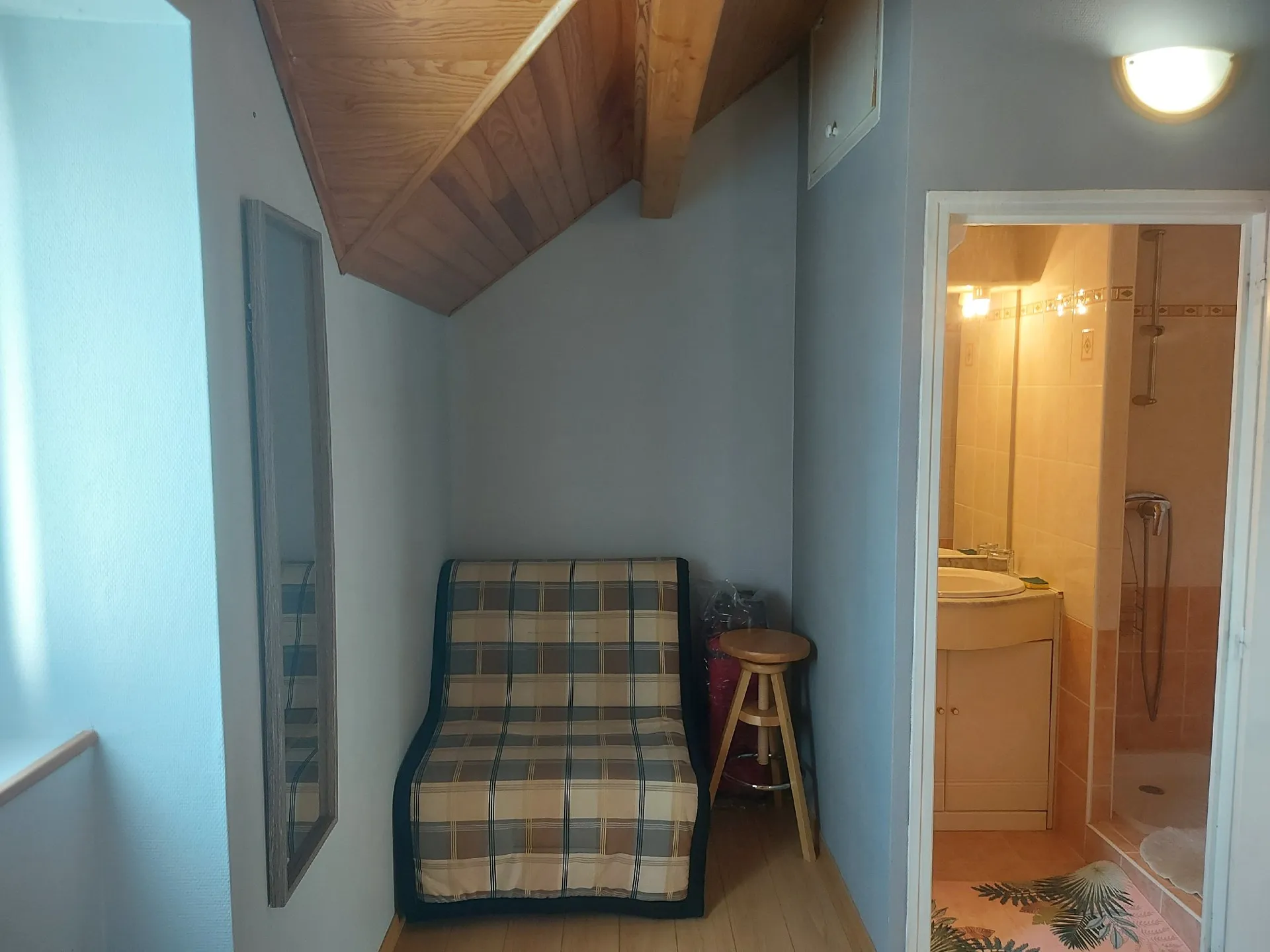 A l’étage : chambre mansardée avec 1 lit en 140, chauffeuse 1 personne. Salle d’eau, lave-linge. Chauffage complet électrique, terrasse de 15 m², jardin clos (120 m²), salon de jardin, barbecue.