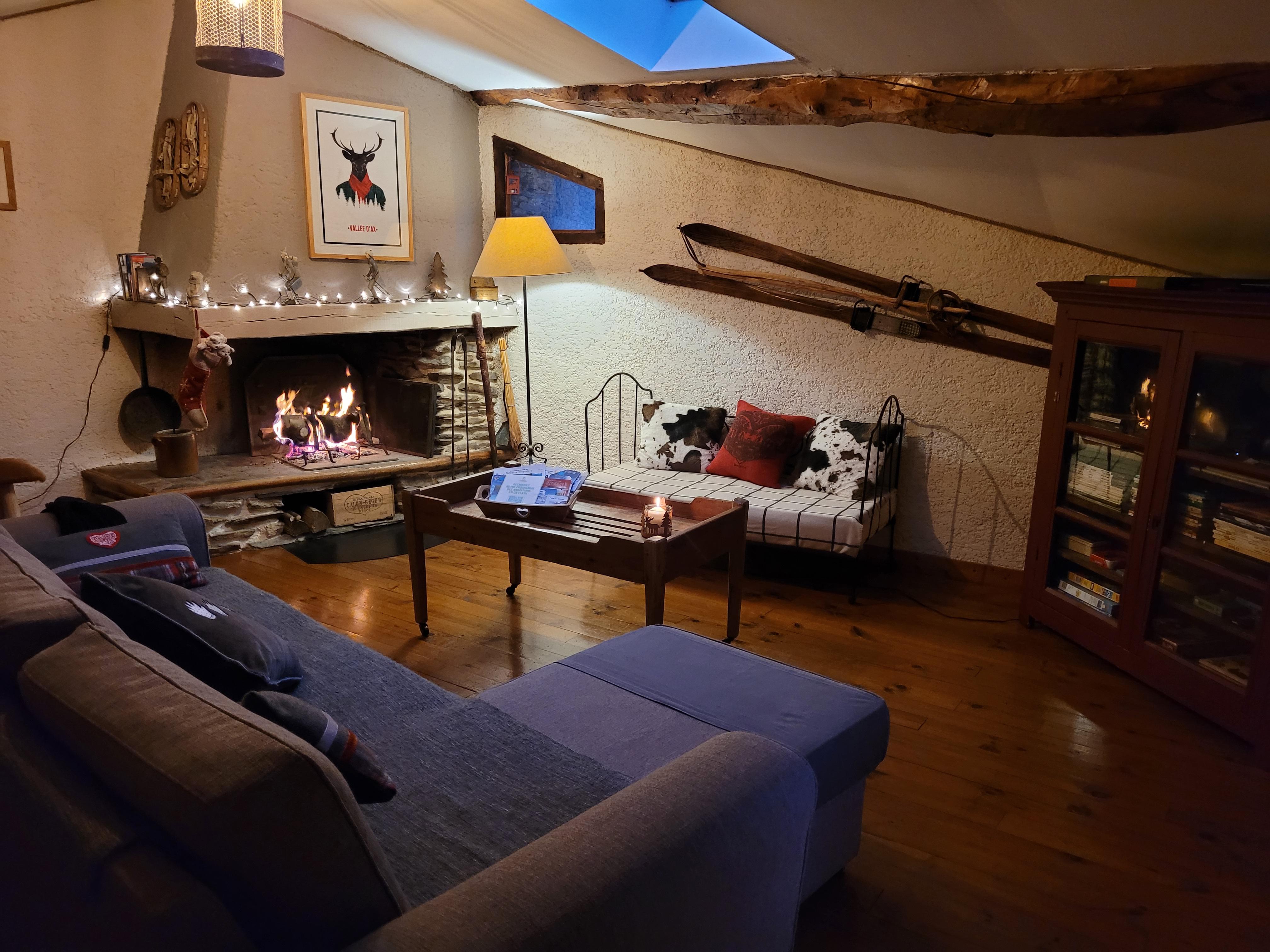 Au 2ème étage, salon mansardé équipé d’un canapé avec méridienne, d’une cheminée à foyer ouvert, d’une bibliothèque, d’une TV avec TNT satellitaire et d’un lecteur DVD.