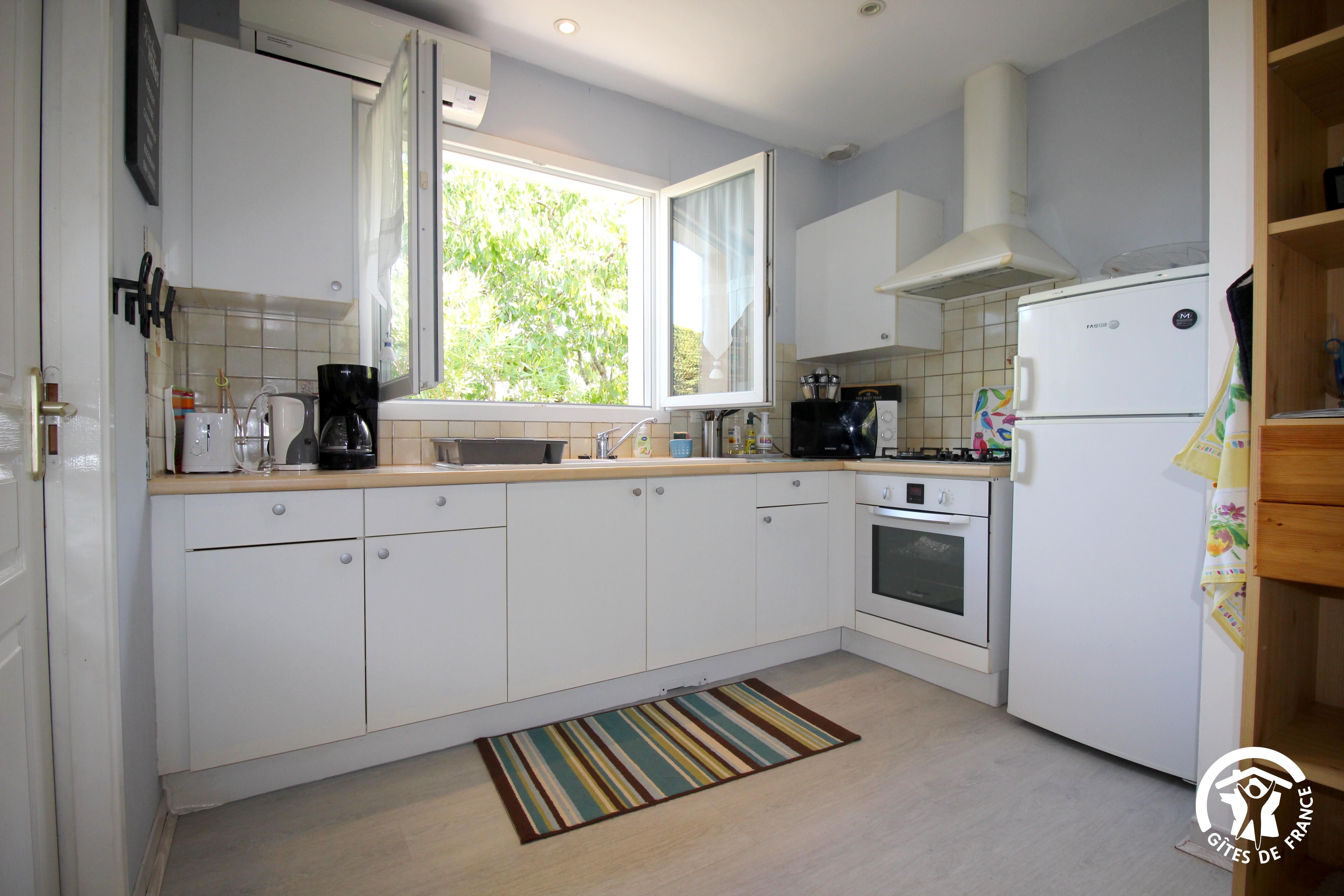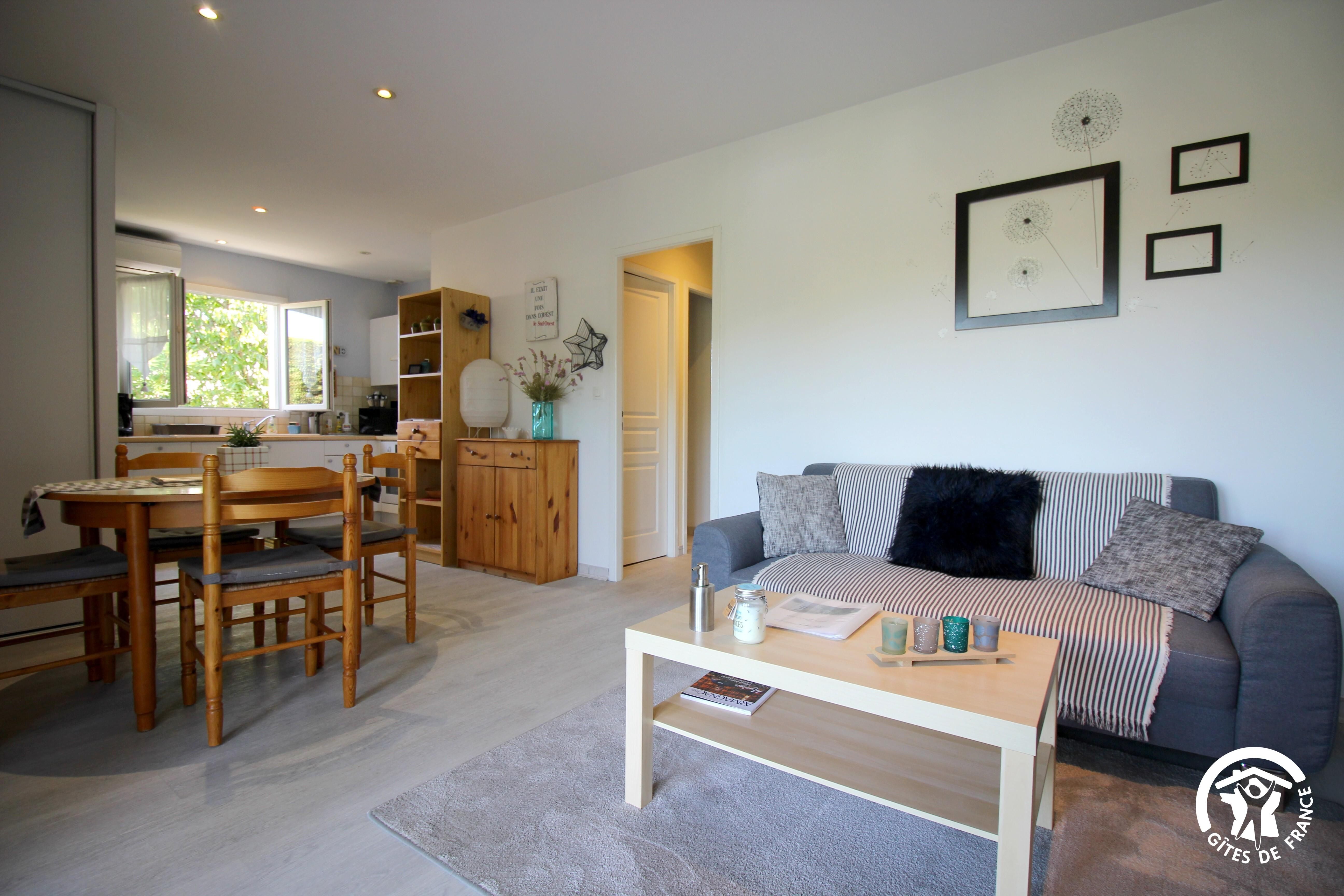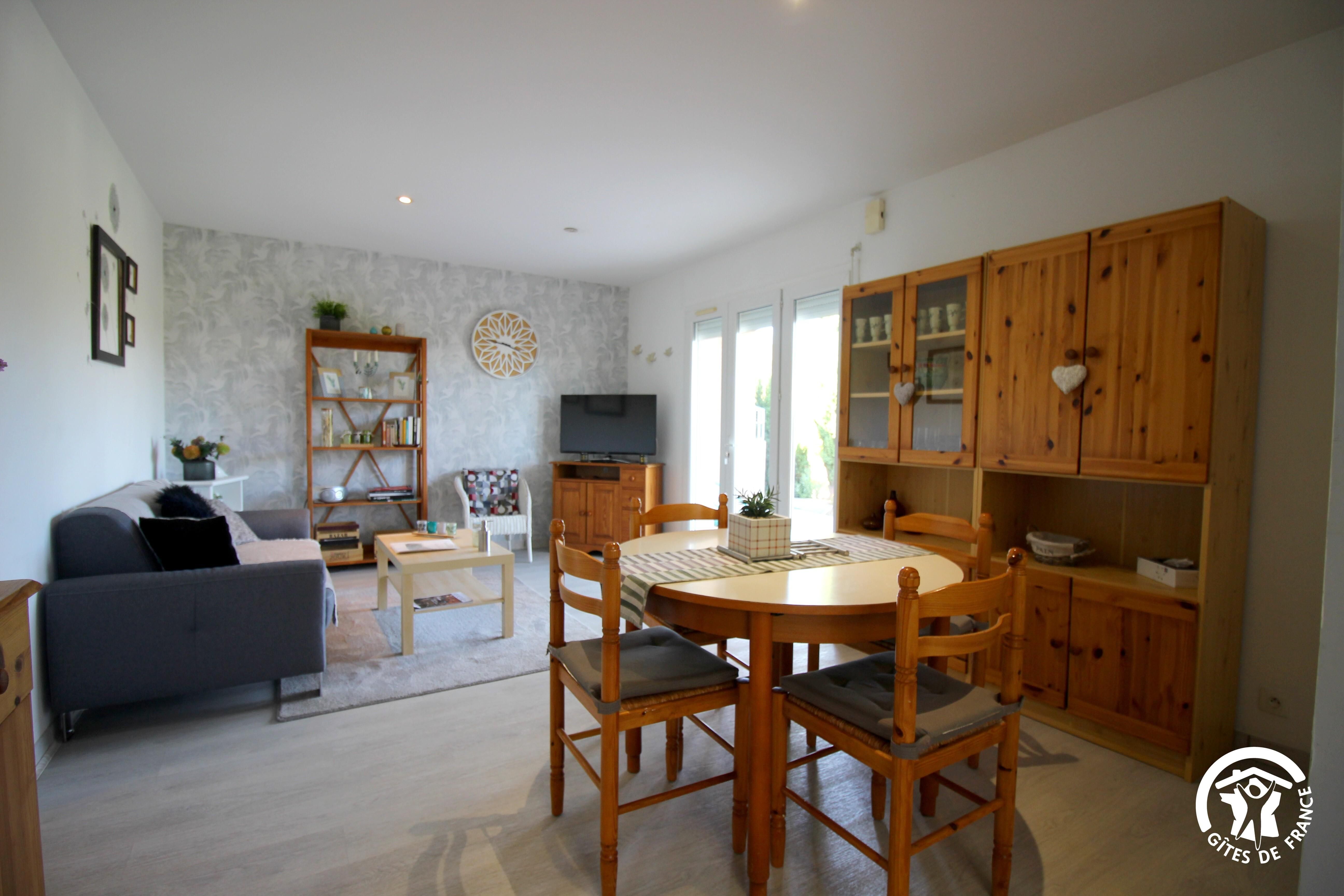 Salon avec espace repas et cuisine ouverte, accès direct à la terrasse par baie vitrée, 2 chambres avec 1 lit en 140 chacune, Salon avec canapé et fauteuil, salle d’eau avec douche, WC séparé, cellier. Équipement bébé: lit + chaise haute..