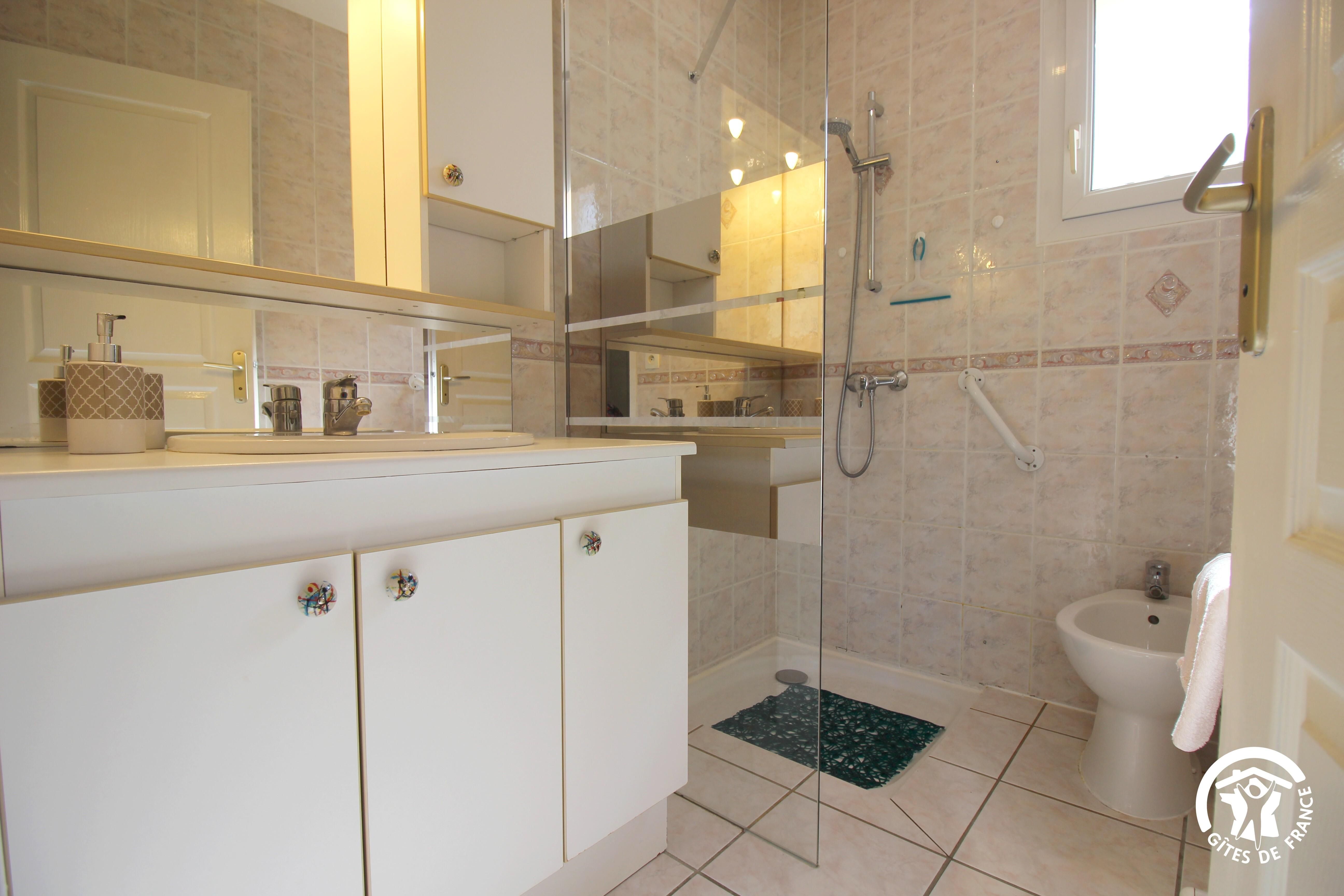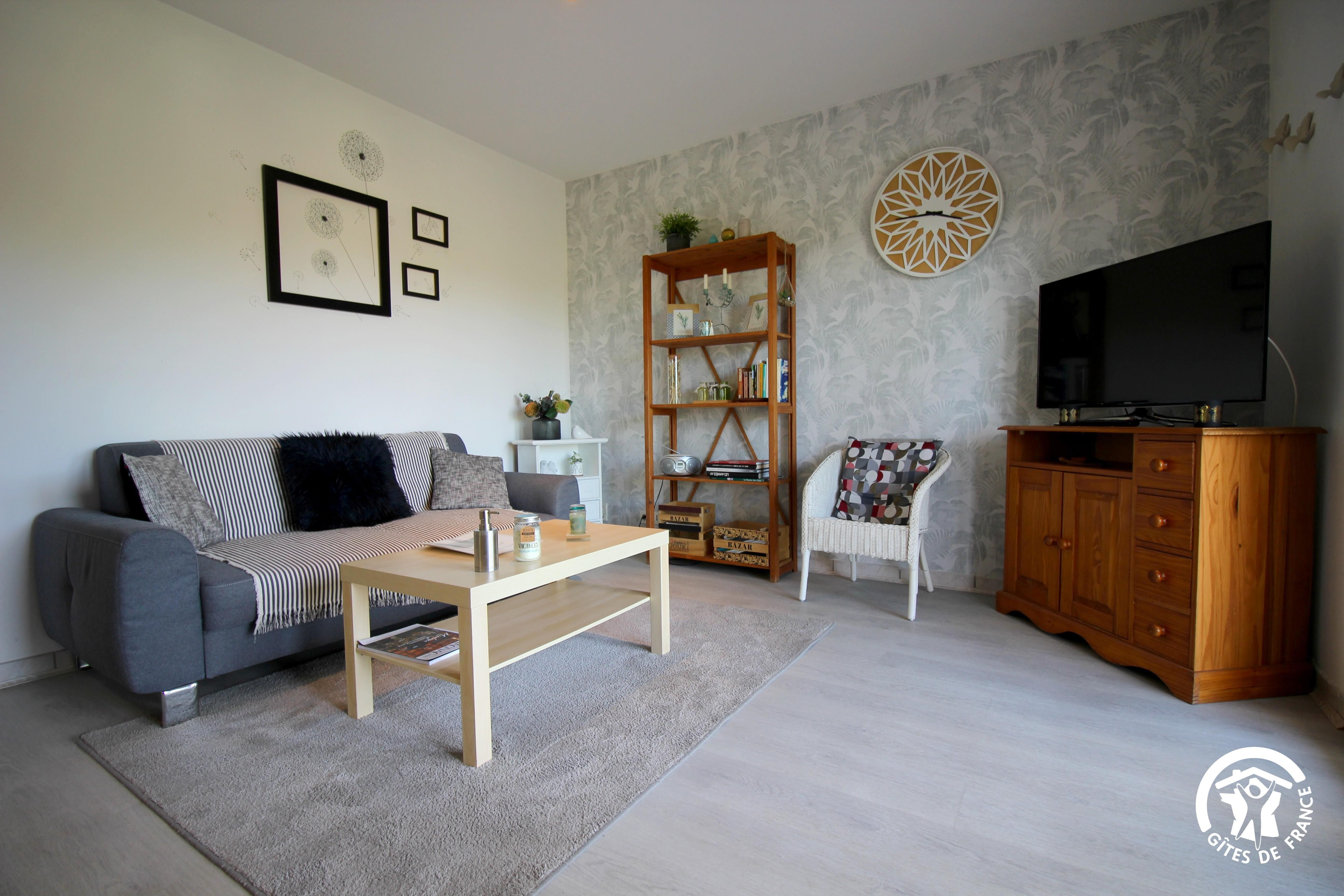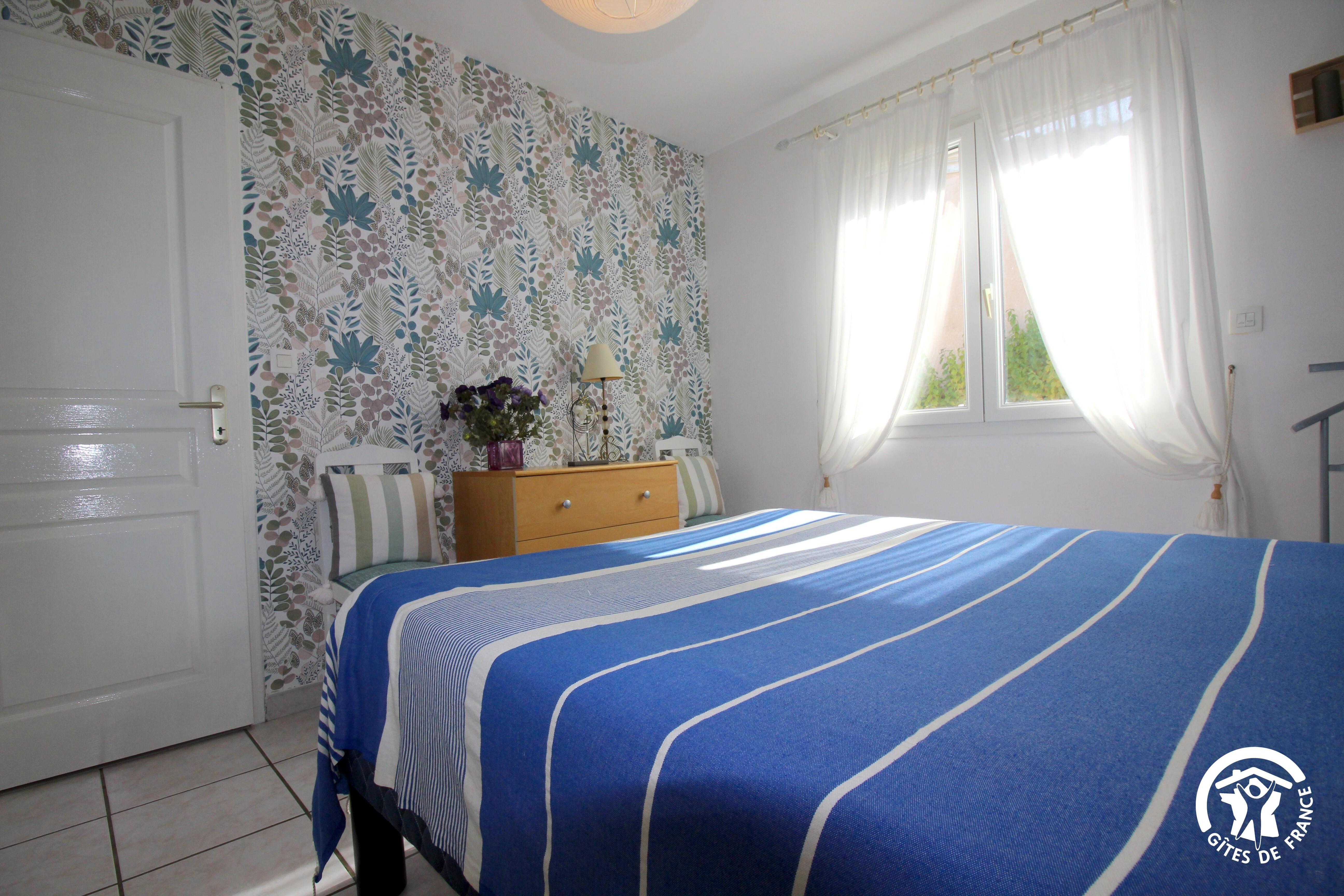Salon avec espace repas et cuisine ouverte, accès direct à la terrasse par baie vitrée, 2 chambres avec 1 lit en 140 chacune, Salon avec canapé et fauteuil, salle d’eau avec douche, WC séparé, cellier. Équipement bébé: lit + chaise haute..