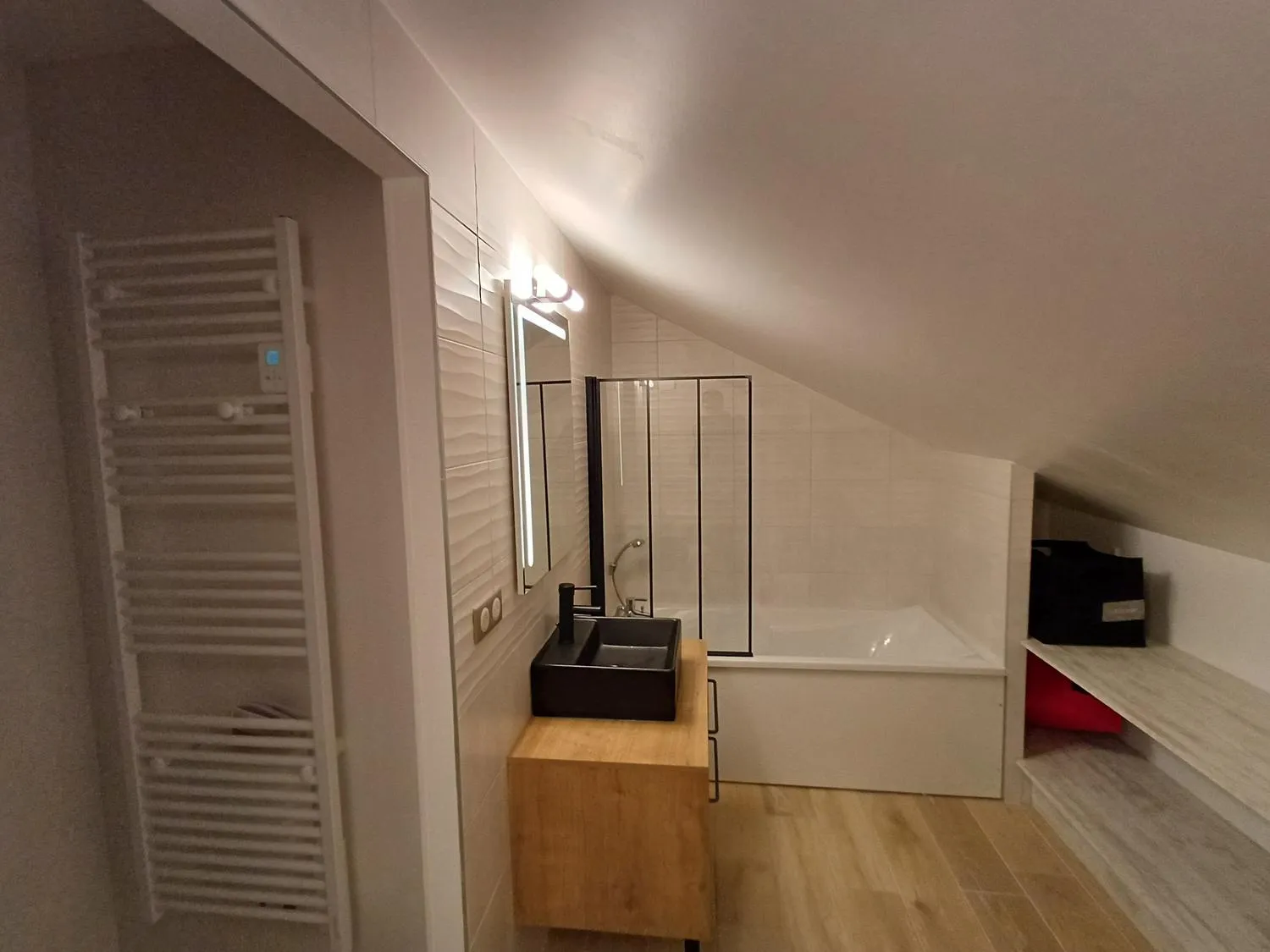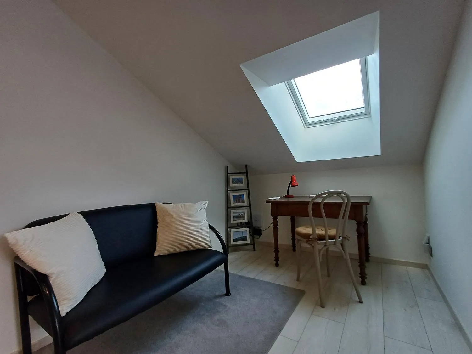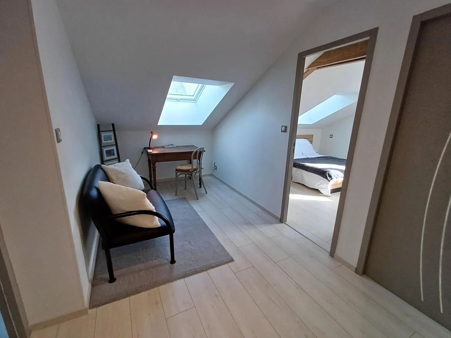 A l’étage 2 chambres mansardées, une salle de bain, une petite pièce bureau.