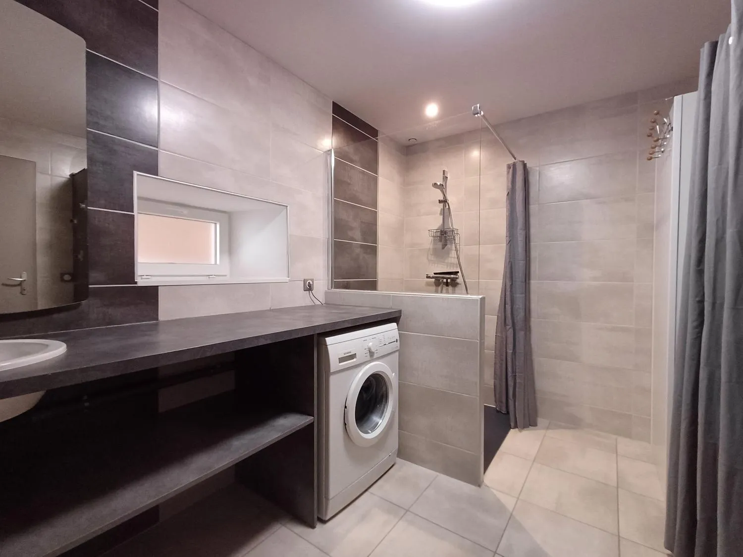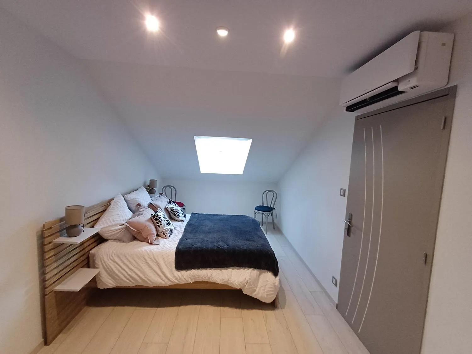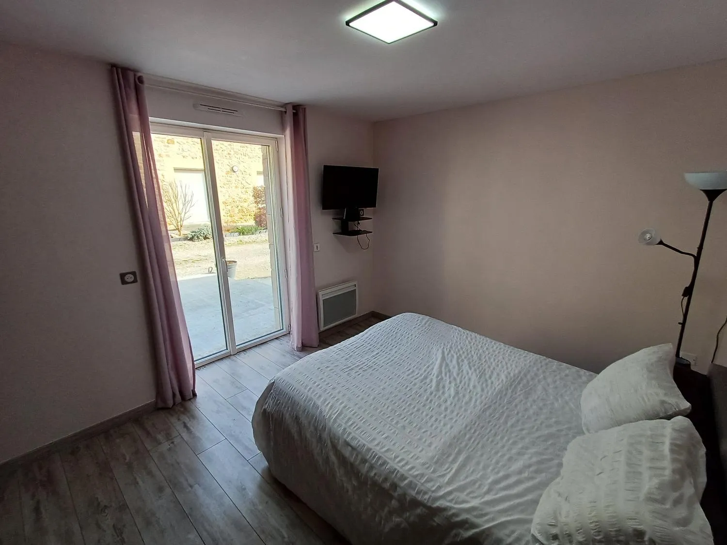 1 chambre au rez de chaussée avec télévision et salle de bain attenante avec douche à l’italienne et WC.