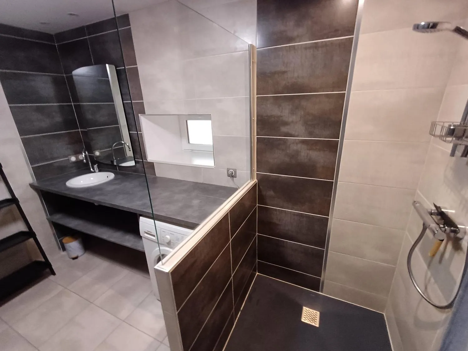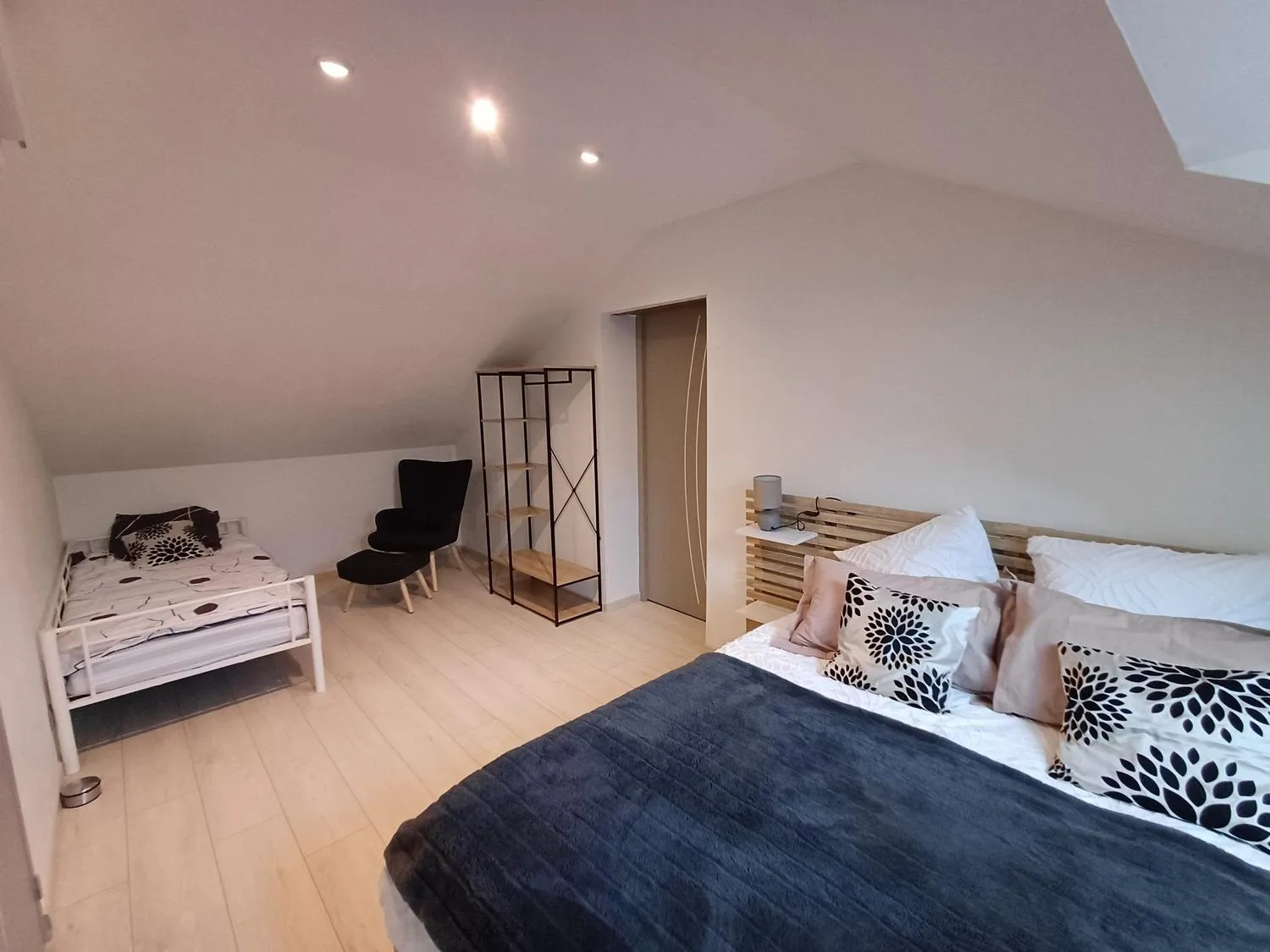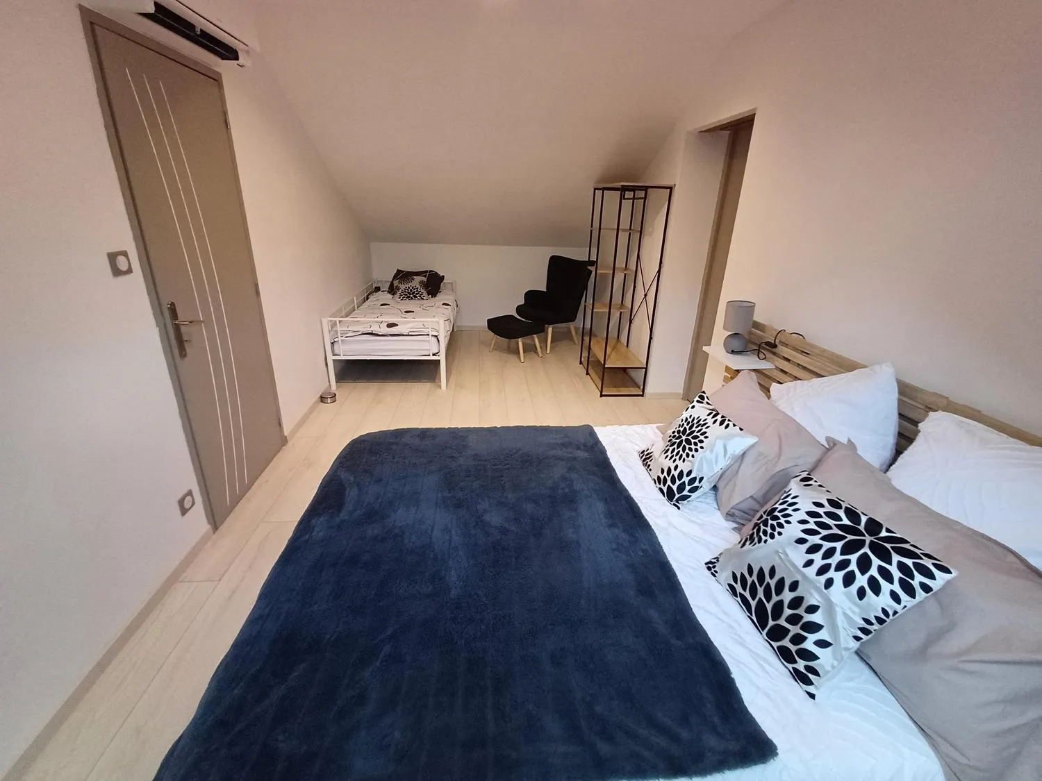 1 chambre au rez de chaussée avec télévision et salle de bain attenante avec douche à l’italienne et WC.