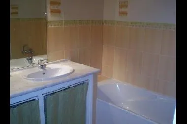 RDC: coin-cuisine/séjour (55 m²) (canapé, fauteuils, cheminée avec insert, TV), 1 chambre (12 m²) avec 1 lit 160, salle bains avec baignoire, 2 vasques, lave-linge, wc indépendant