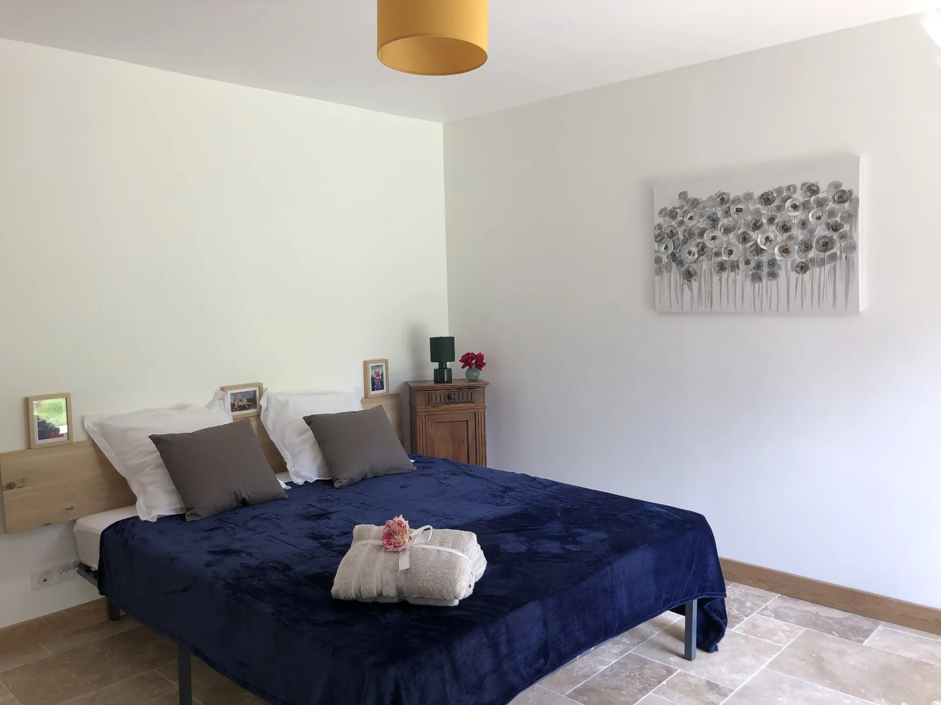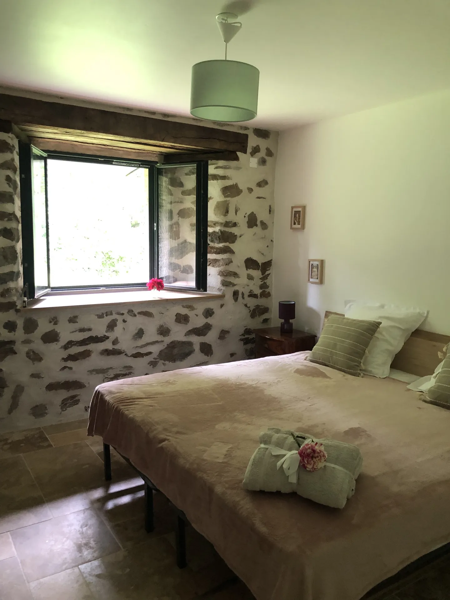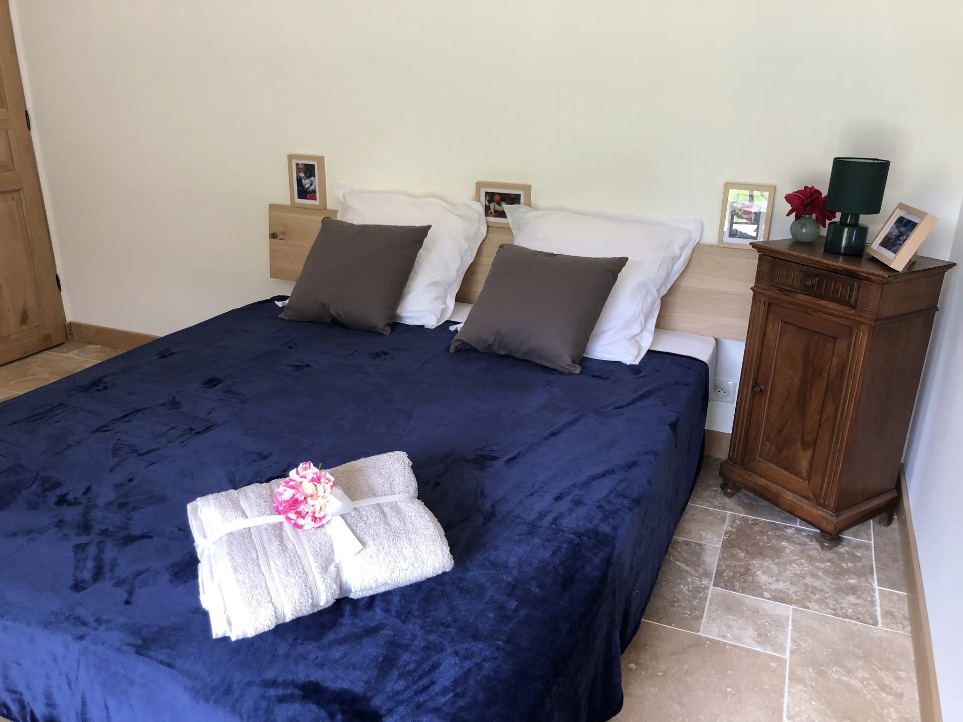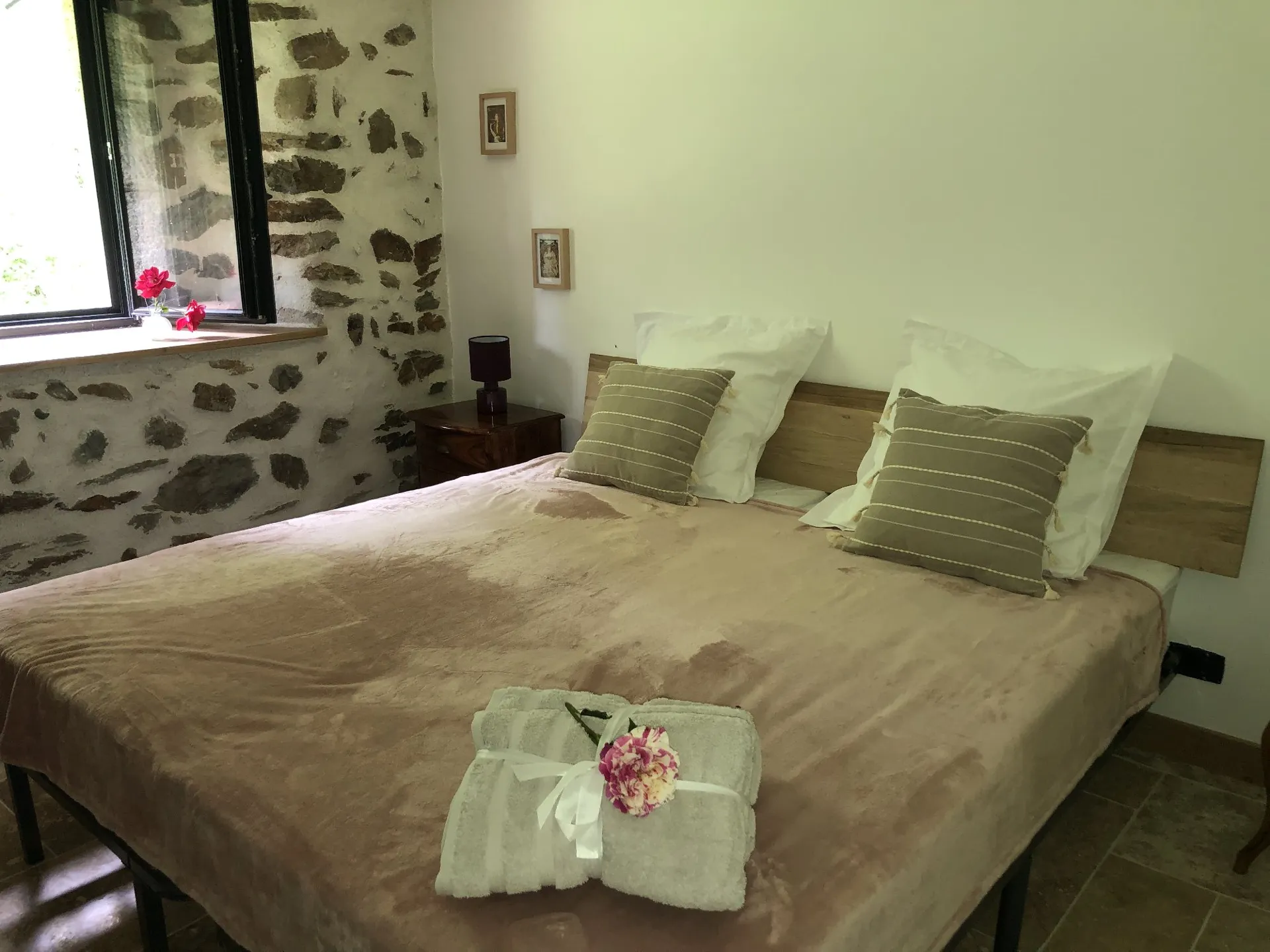 L’espace nuit, situé au rez-de-chaussée afin de profiter de la fraîcheur de la nuit en été, est composé de quatre chambres chaleureuses et “cosy”, aux murs en pierres apparentes. Elles sont décorées hautes en couleur, mêlant mobilier ancien et contemporain. Deux des chambres disposent d’un accès direct sur le jardin/terrasse, et toutes sont équipées de literie “grande taille”.