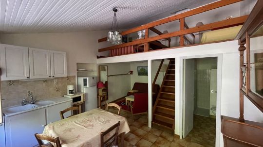 Cuisine dans séjour avec cuisson au gaz + frigo + Four Micro-ondes + cafetière. Terrasse privative.