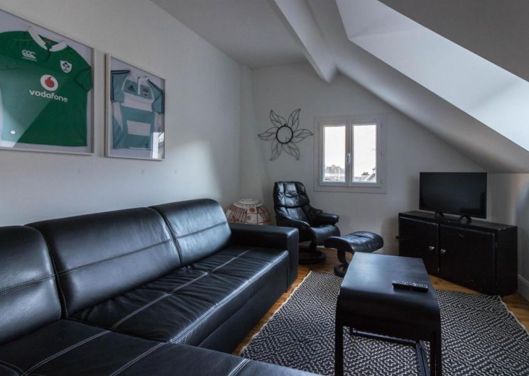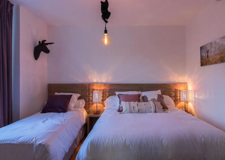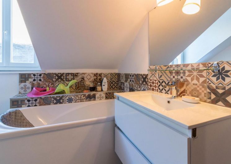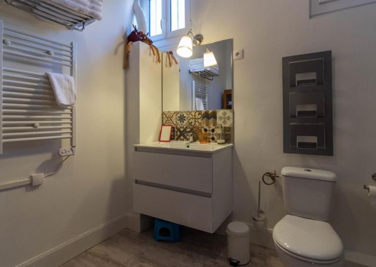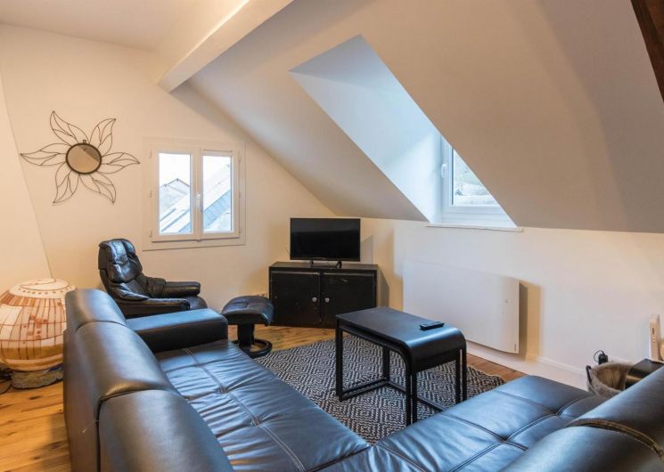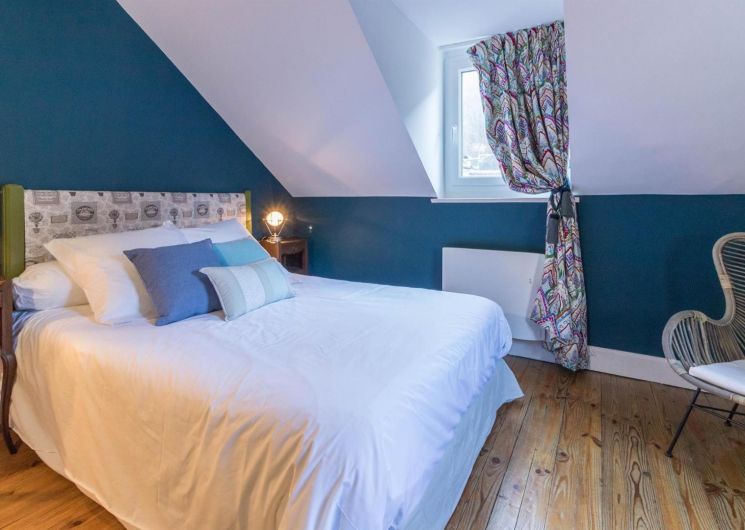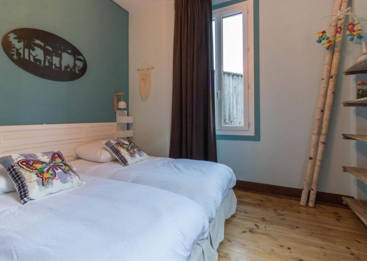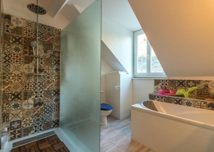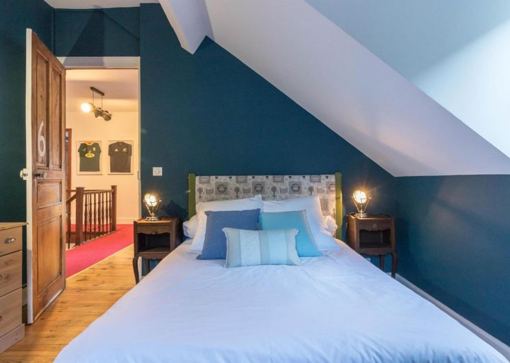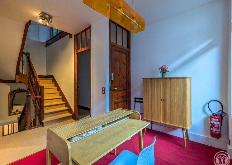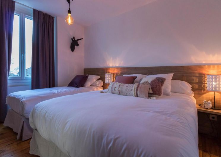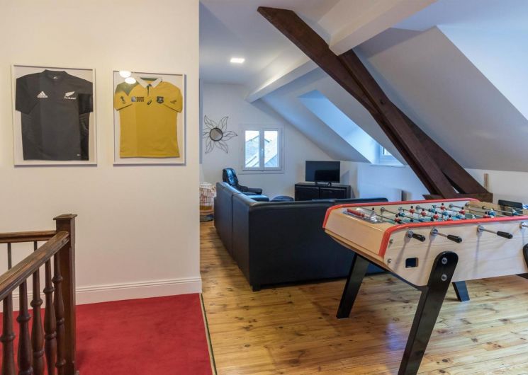 – Au deuxième étage, sous combles : espace détente/jeux en mezzanine avec babyfoot et flipper, 3 chambres (3 lits 1 personnes en 80cm dont 2 jumelables avec salle d’eau/WC privative) (1 lit 2 personnes en 140cm avec salle de bains/WC + douche privative) (1 lit 2 personnes en 160cm avec salle d’eau/WC).