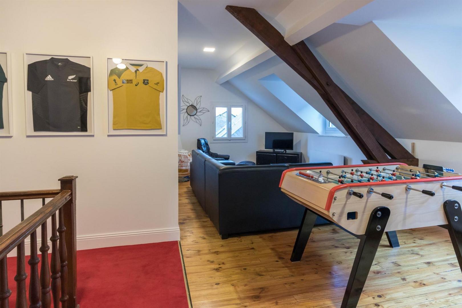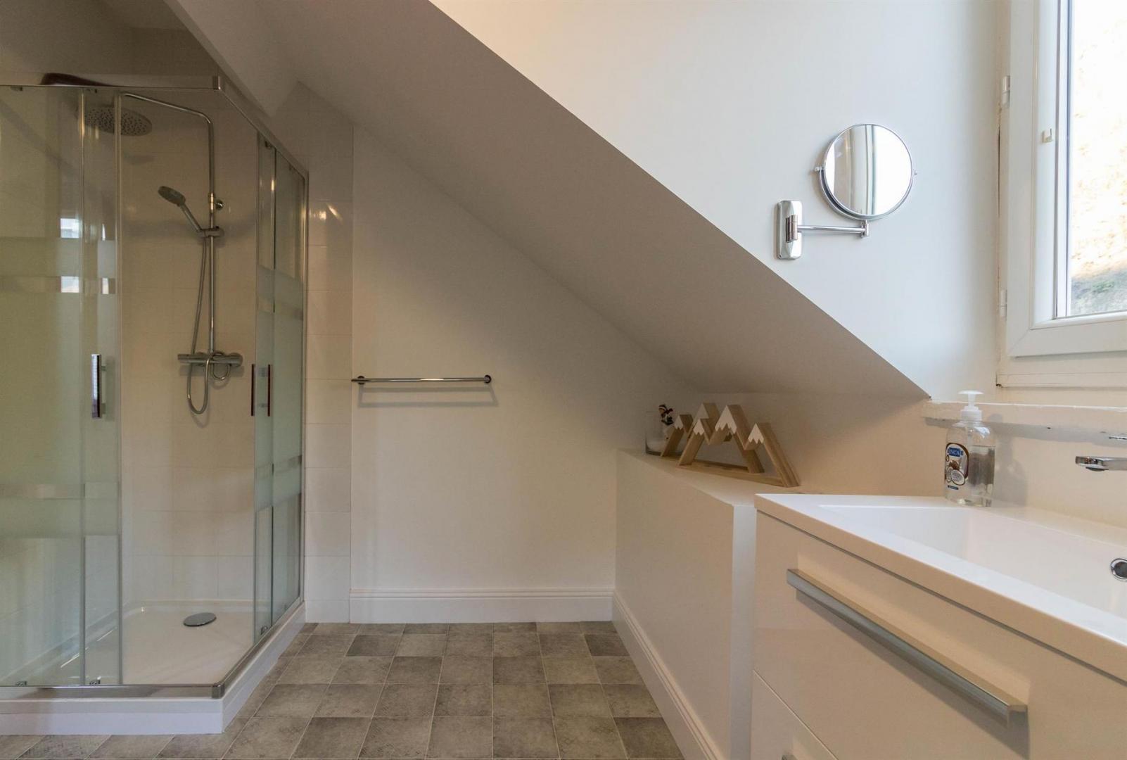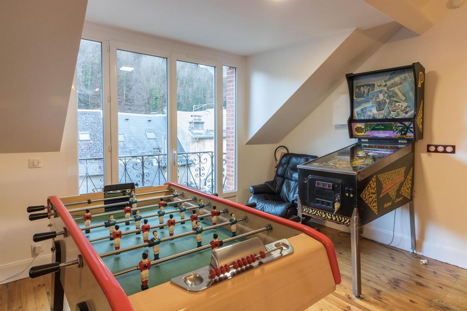 – Au deuxième étage, sous combles : espace détente/jeux en mezzanine avec babyfoot et flipper, 3 chambres (3 lits 1 personnes en 80cm dont 2 jumelables avec salle d’eau/WC privative) (1 lit 2 personnes en 140cm avec salle de bains/WC + douche privative) (1 lit 2 personnes en 160cm avec salle d’eau/WC).