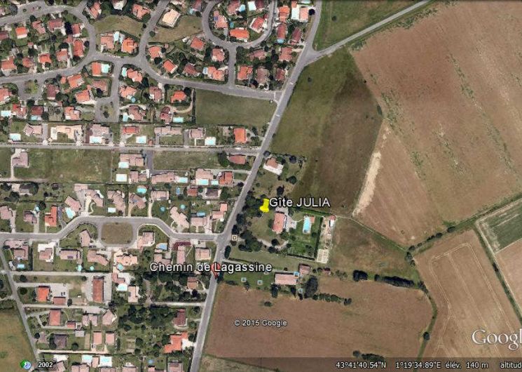 Accès : De Toulouse, prendre la direction de l’aéroport de Blagnac. Puis suivre la D902 vers Beauzelle/Seilh/Grenade. A Seilh, prendre à gauche la D63 jusqu’à Aussonne. Là, suivre le chemin de Peyrelong (tout droit aux deux ronds-points) puis tourner à droite sur le chemin de Lagassine (n° 889). – De Montauban quitter l’autoroute et prendre la direction Toulouse par la Nationalel : passer dans Grisolles, Ondes, Grenade, là prendre direction Blagnac Aussonne rouler environ 7 kms, sur la gauche un domaine fruitier La Faugade, prendre tout de suite à droite le 2ème chemin : chemin de Myllau continuer sur 1,5 km et à la fin du chemin tourner à gauche chemin Lagassine 2ème maison à gauche N°889