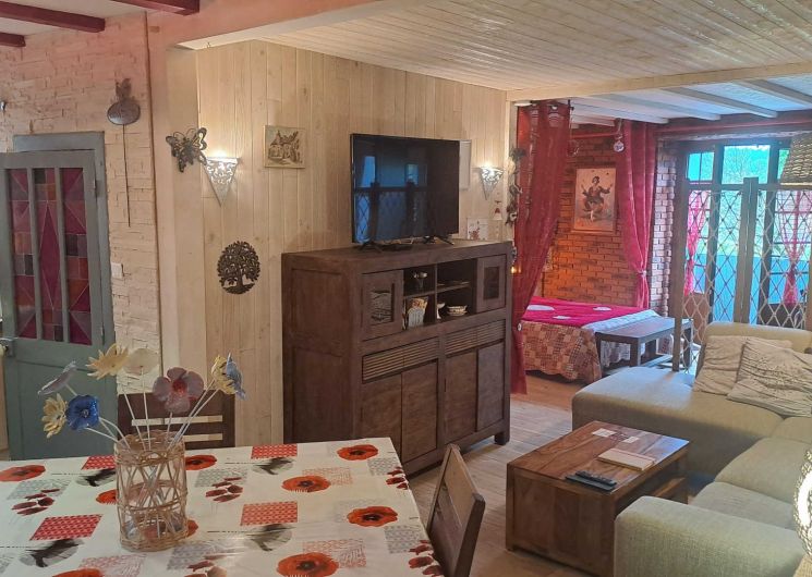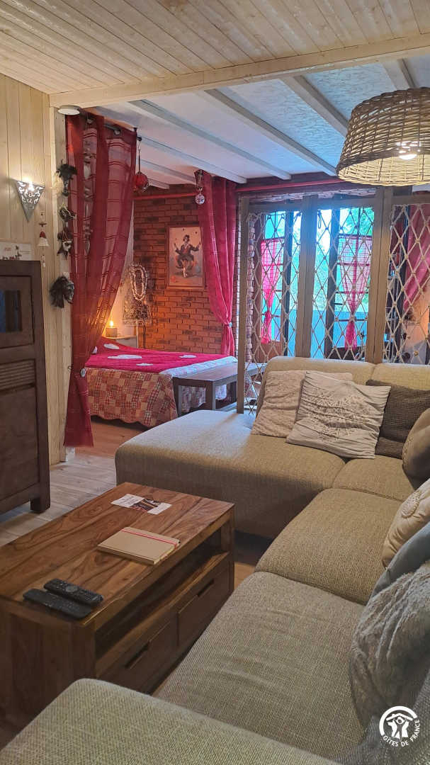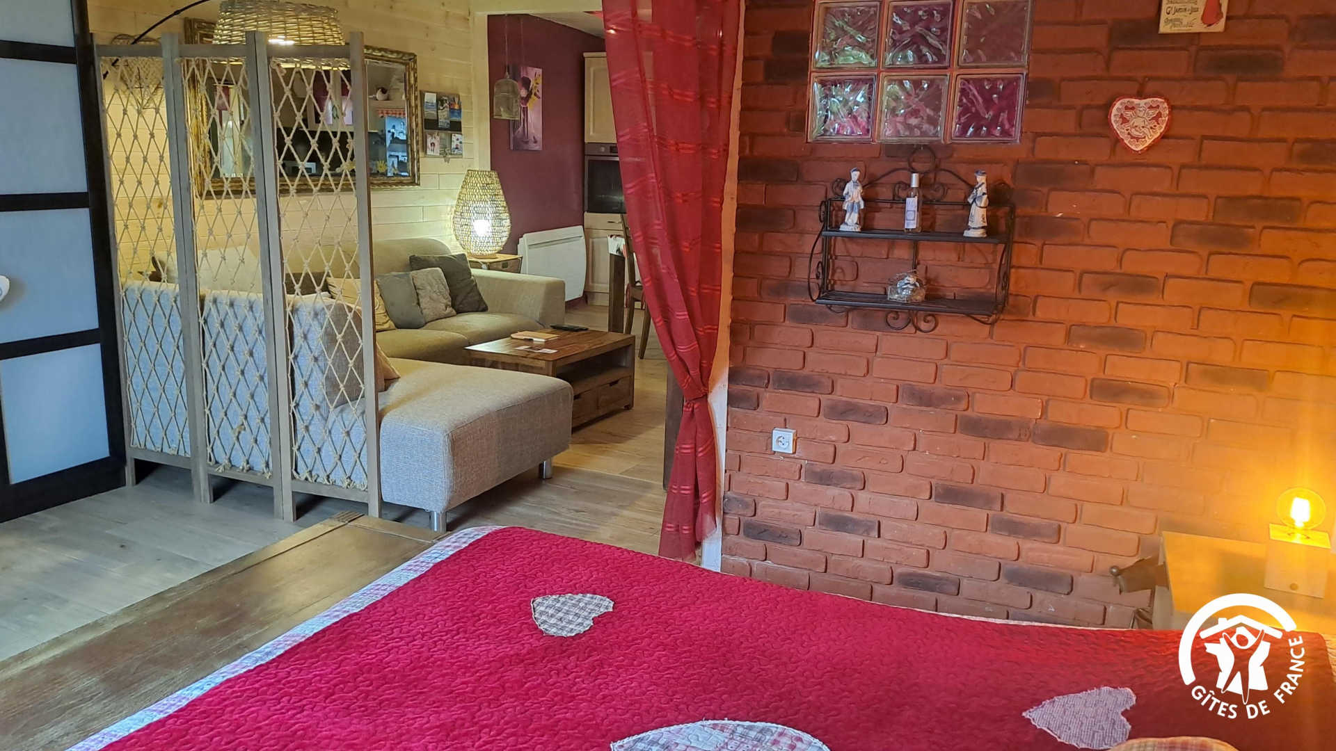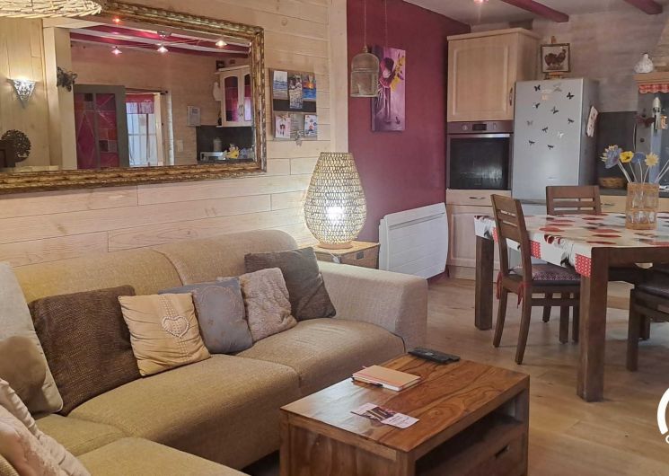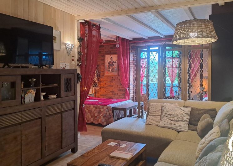 Cette petite maison de village rénovée comme un loft peut accueillir agréablement 2 personnes avec sa partie cuisine/séjour, son salon avec canapé et son coin couchage.