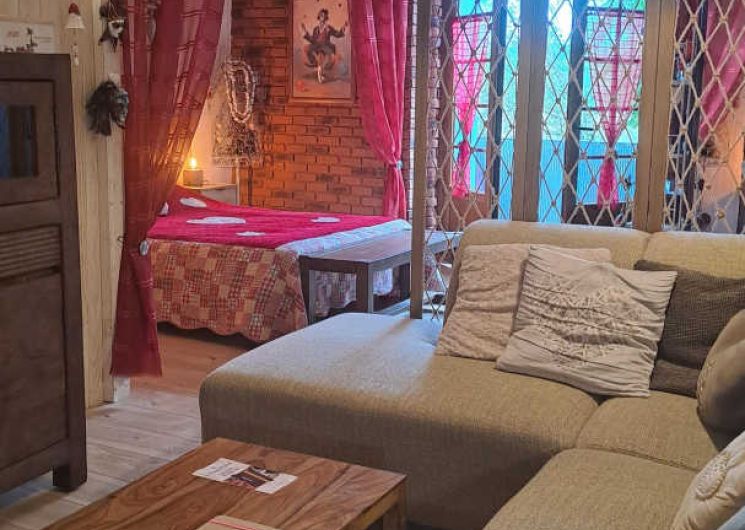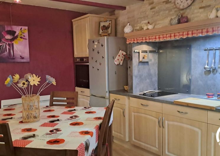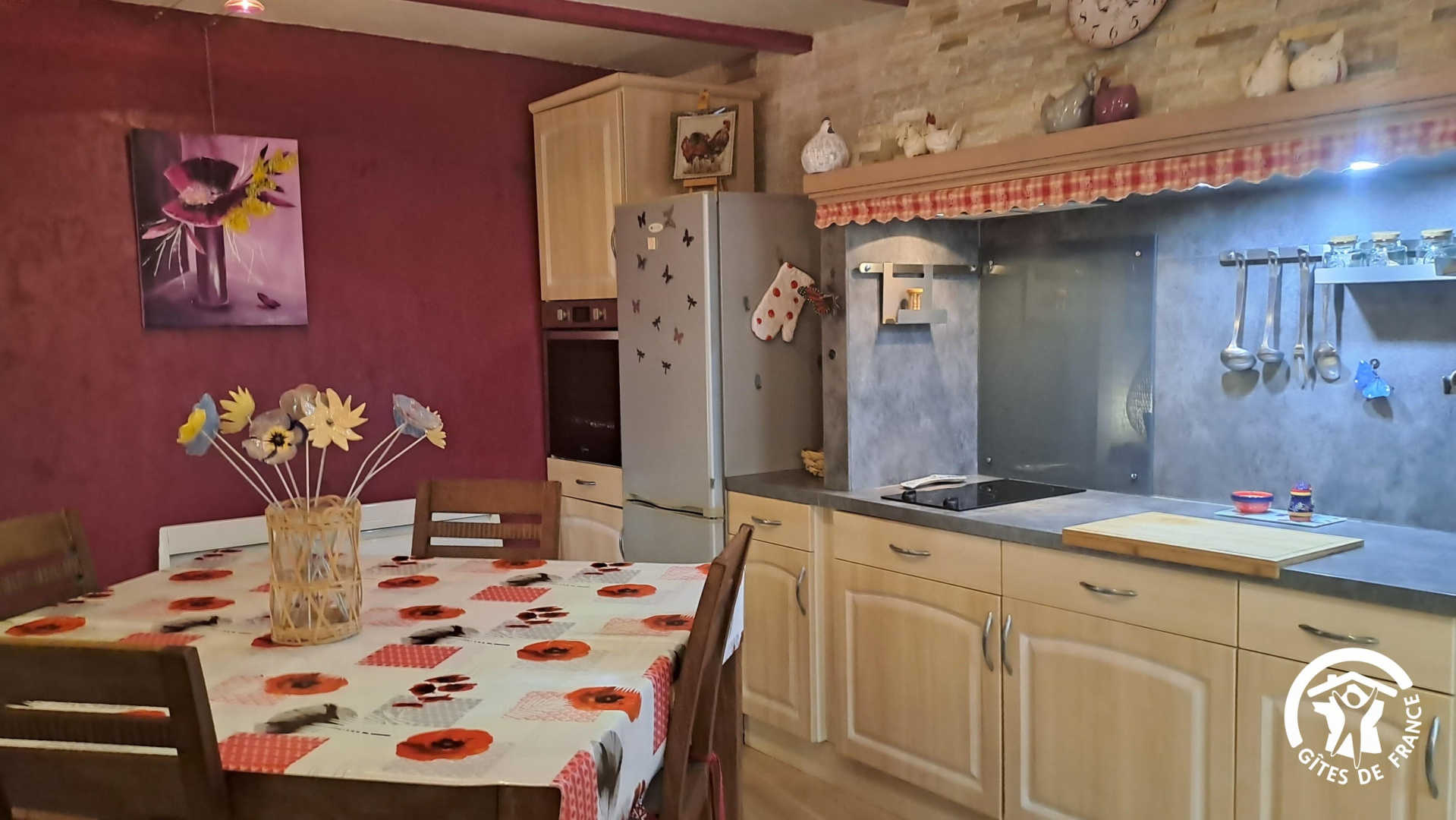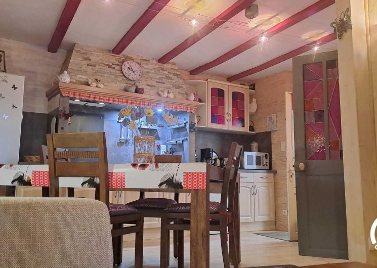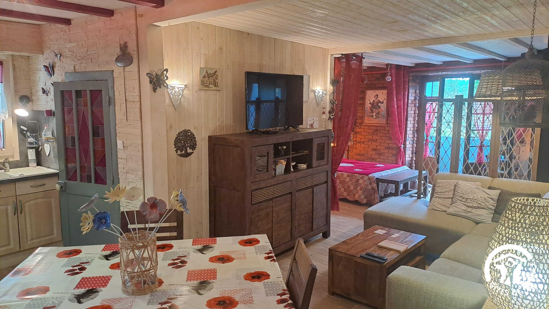 Cette petite maison de village rénovée comme un loft peut accueillir agréablement 2 personnes avec sa partie cuisine/séjour, son salon avec canapé et son coin couchage.