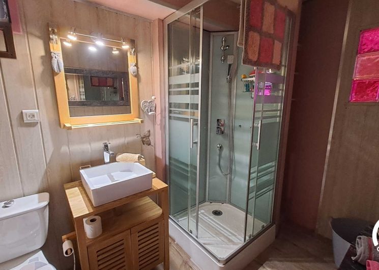 Depuis ce séjour, la porte de gauche accède à la salle d’eau équipée d’une cabine de douche, d’un meuble vasque et d’un WC.