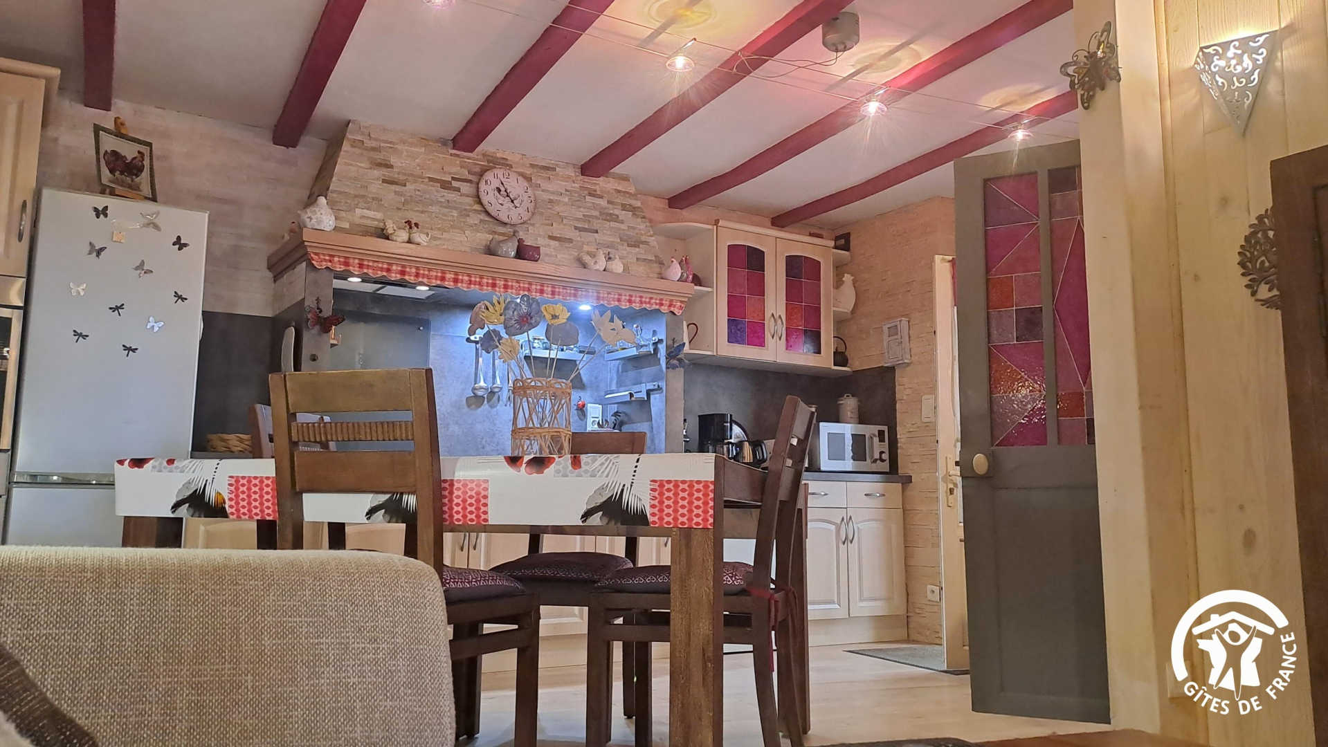 A ce niveau on se trouve dans la partie cuisine/séjour entièrement équipée, plaque de cuisson 2 feux, four, réfrigérateur, congélateur, micro-onde, cafetière à filtre et à dosettes type Senseo, grille pain.