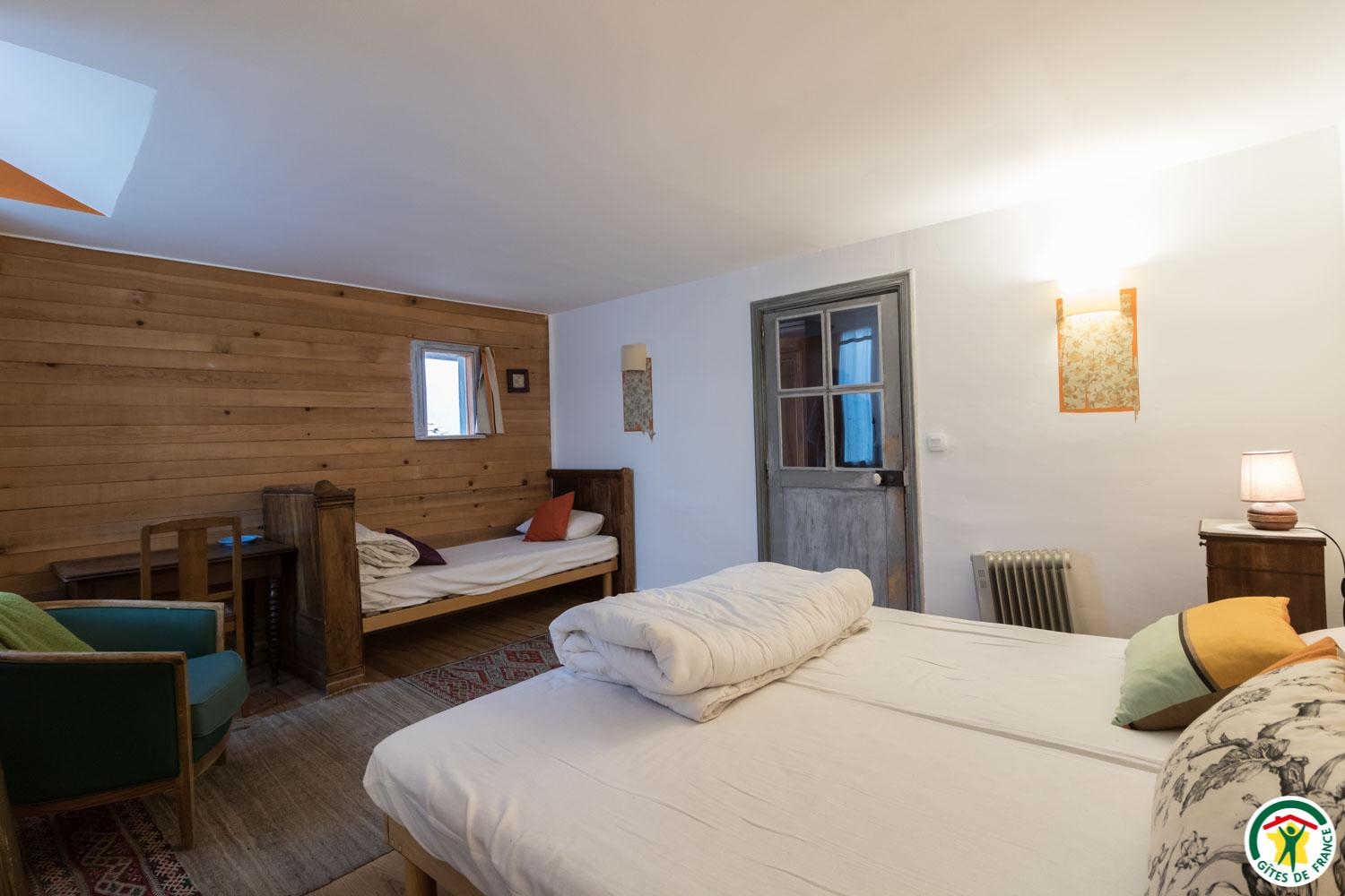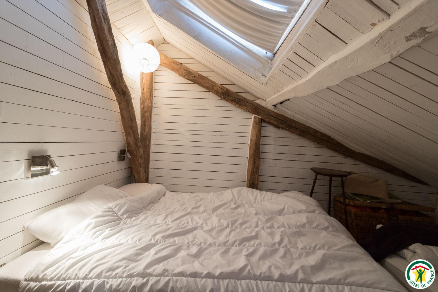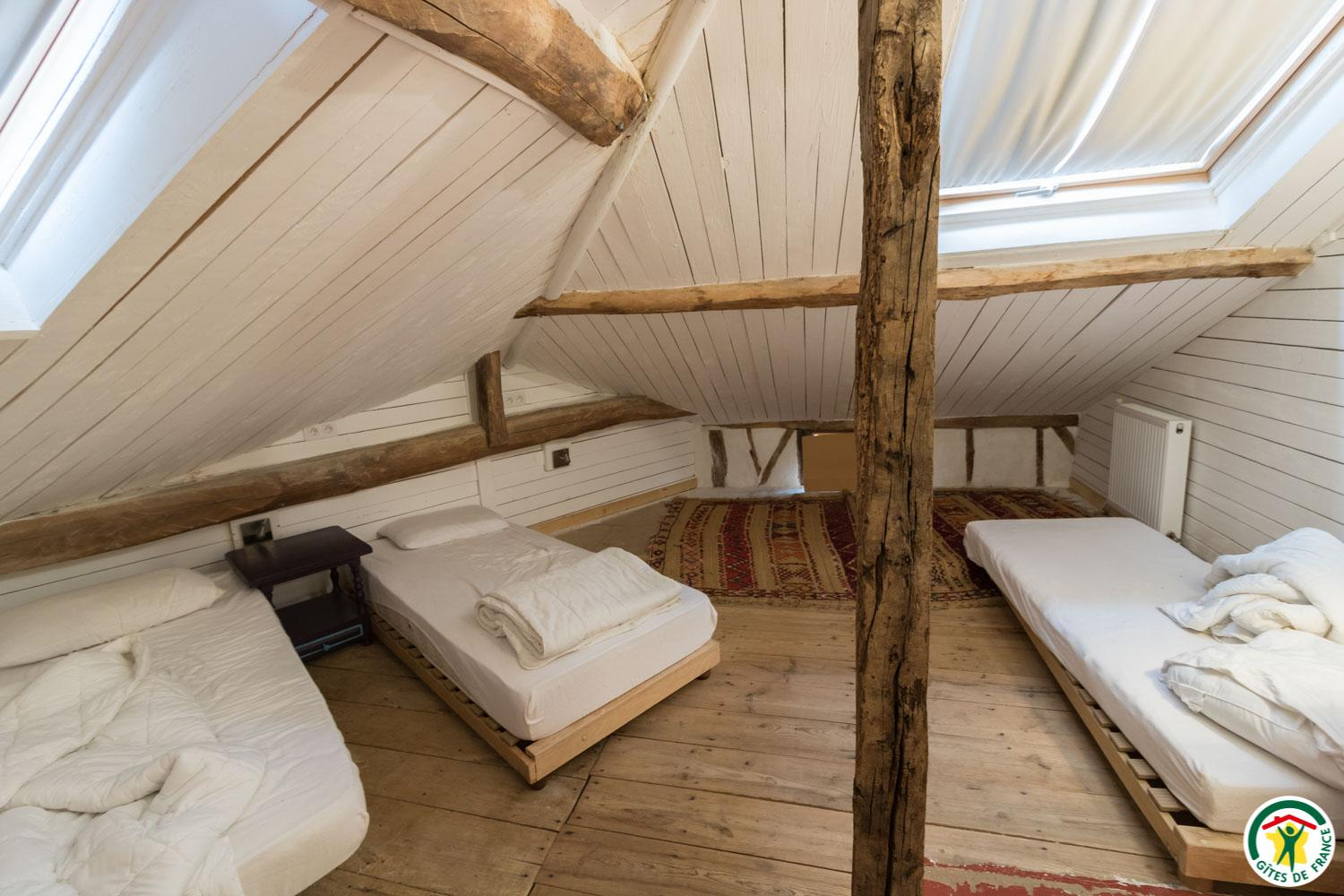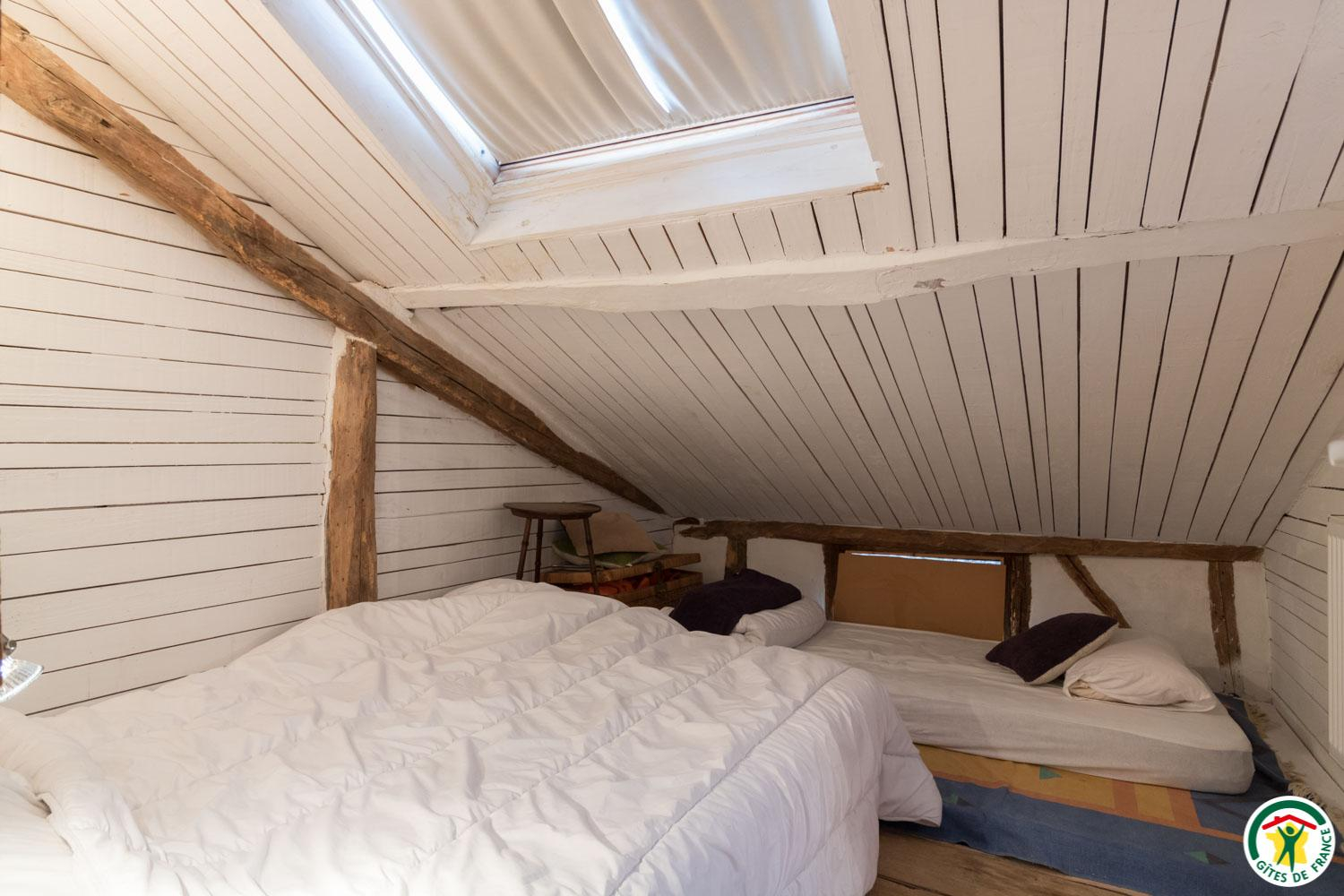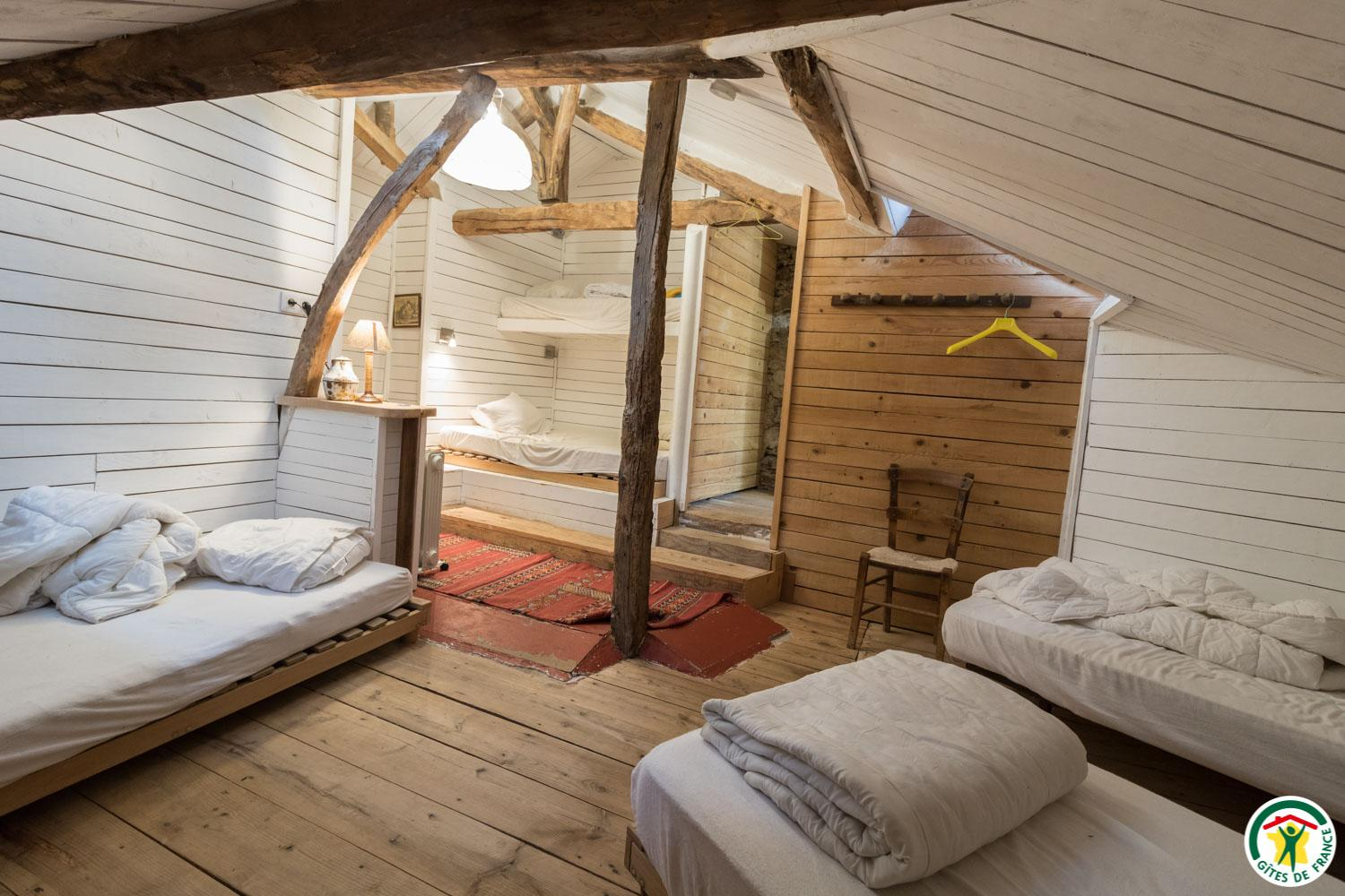 – Au deuxième étage sous combles : 1 chambre (1 lit double en 140*190cm) et 1 petit dortoir (1 lit double en 140*190cm et 3 lits simples en 90*190cm). Chaque unité de couchage (chambre ou dortoir) est équipée d’une salle d’eau/WC privative, à l’exception du deuxième étage où le WC est commun.