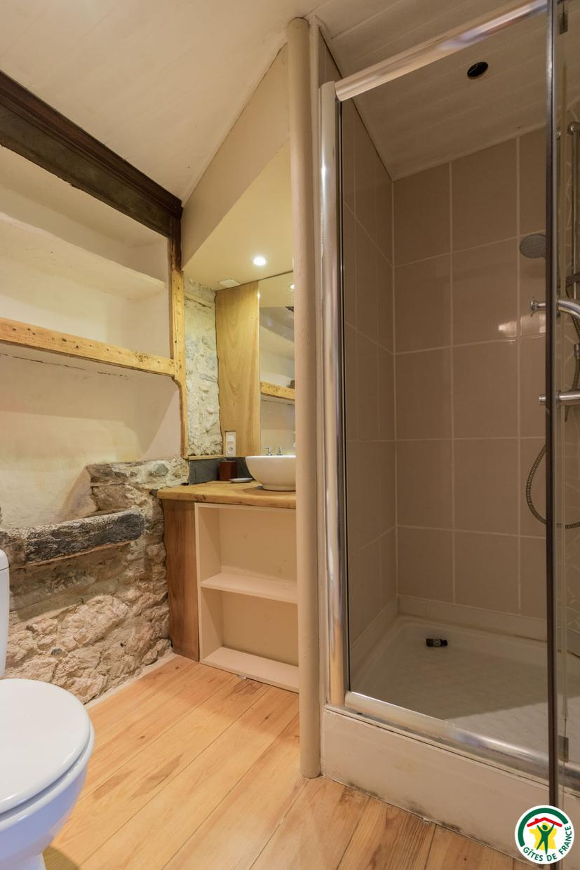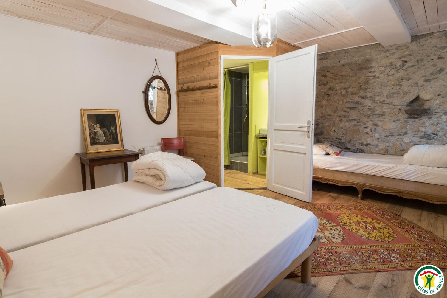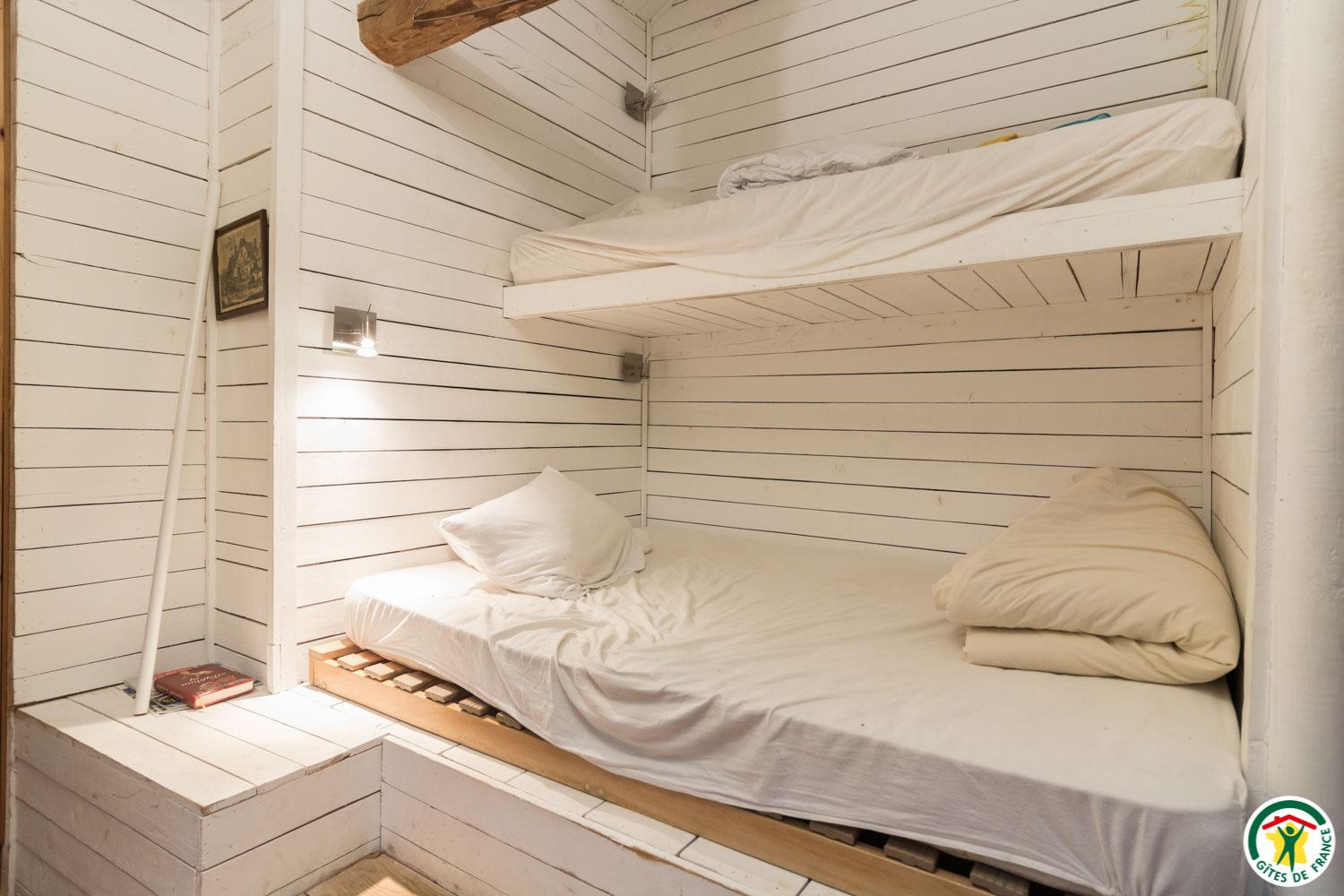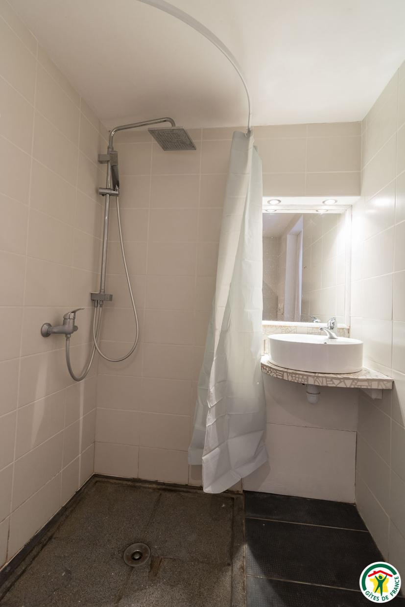 – Au deuxième étage sous combles : 1 chambre (1 lit double en 140*190cm) et 1 petit dortoir (1 lit double en 140*190cm et 3 lits simples en 90*190cm). Chaque unité de couchage (chambre ou dortoir) est équipée d’une salle d’eau/WC privative, à l’exception du deuxième étage où le WC est commun.