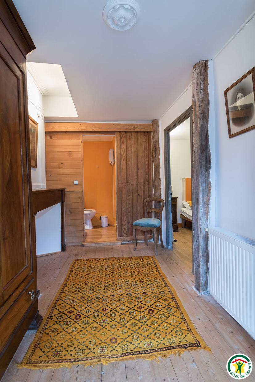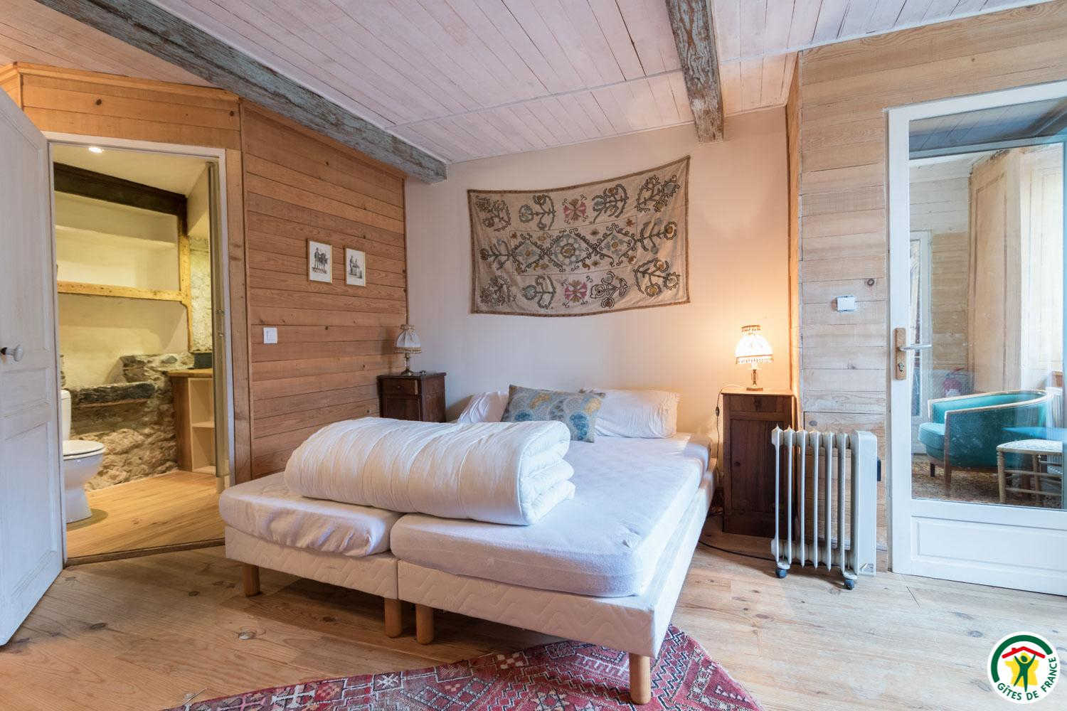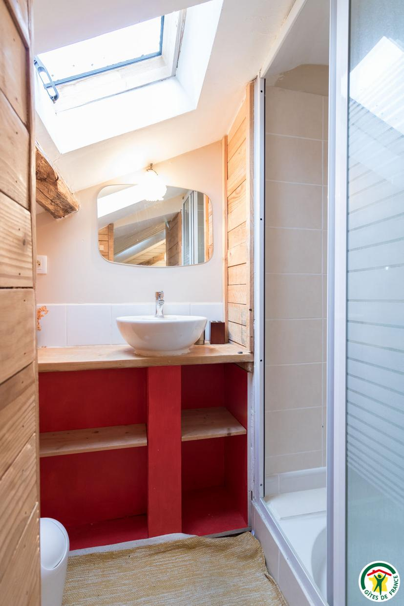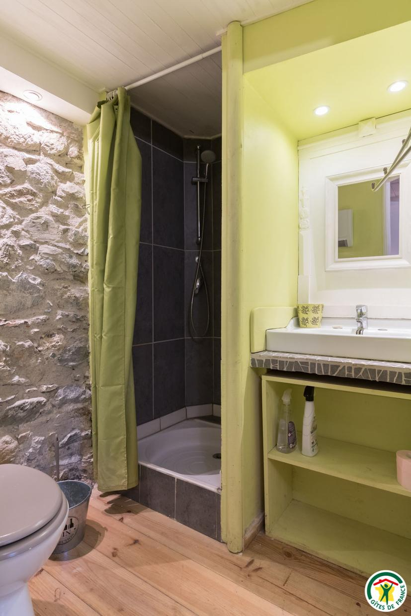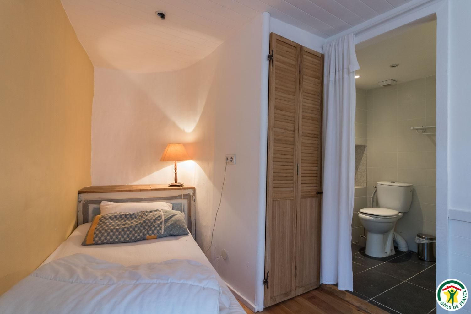 – Au deuxième étage sous combles : 1 chambre (1 lit double en 140*190cm) et 1 petit dortoir (1 lit double en 140*190cm et 3 lits simples en 90*190cm). Chaque unité de couchage (chambre ou dortoir) est équipée d’une salle d’eau/WC privative, à l’exception du deuxième étage où le WC est commun.