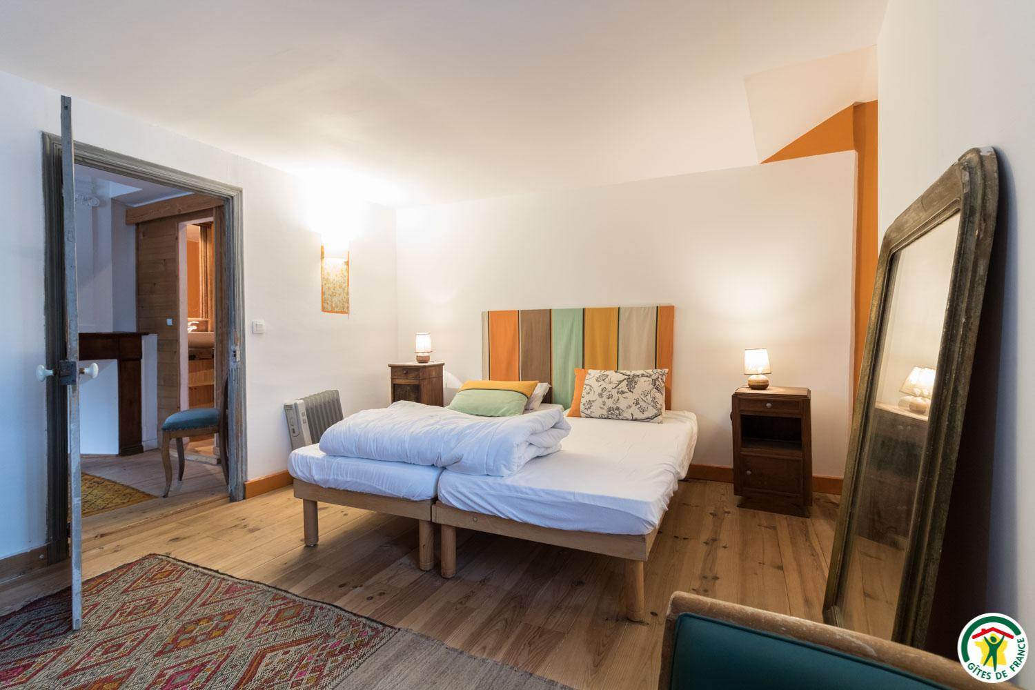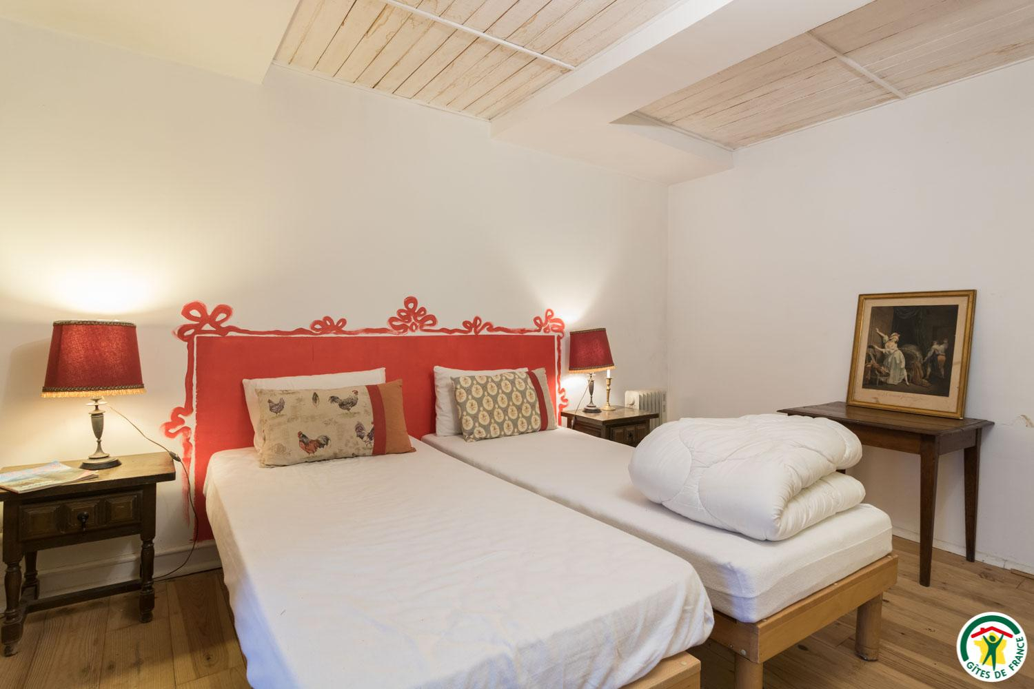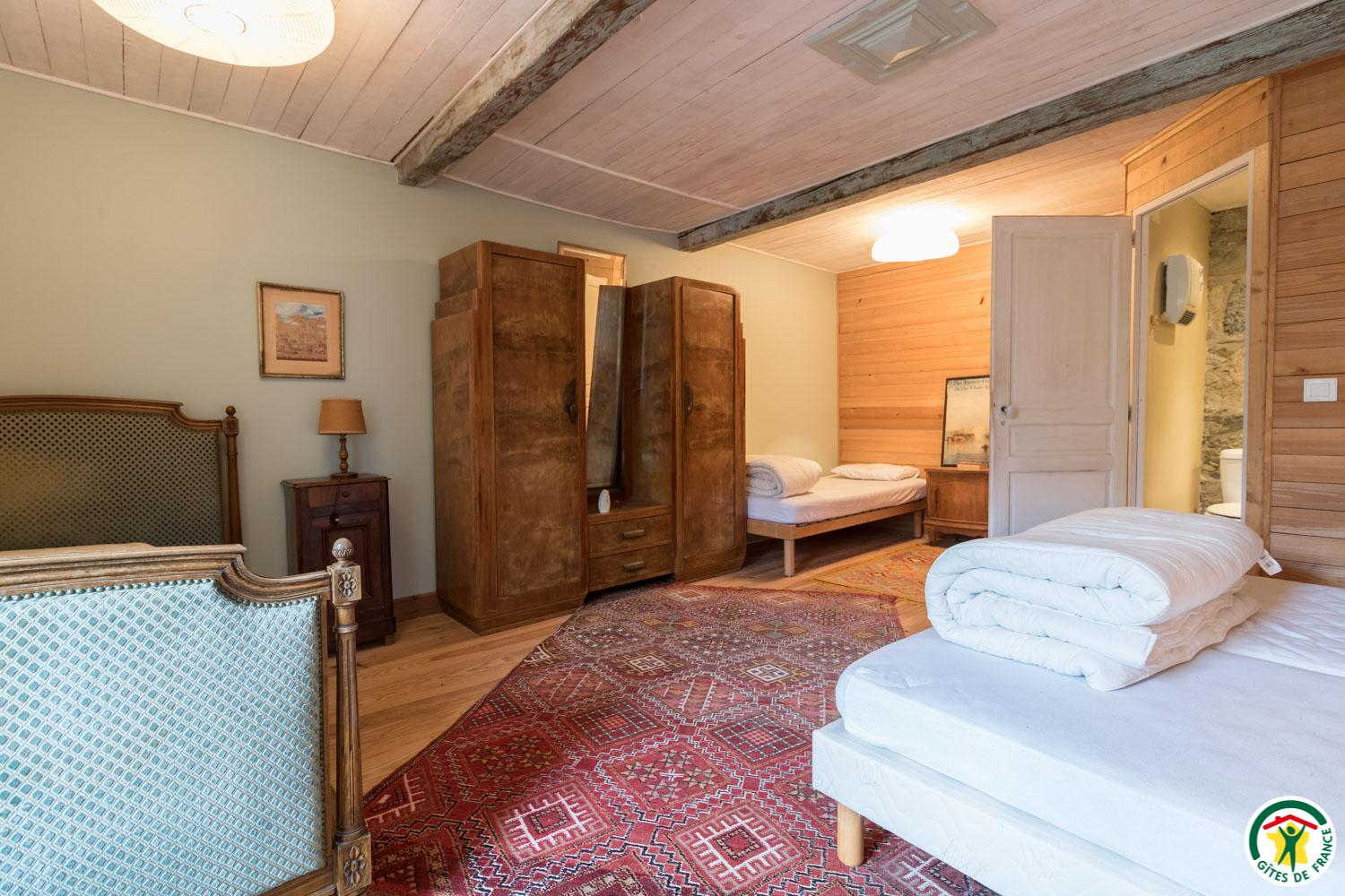 – Au premier étage : 3 chambres, une avec 4 lits simples en 90*190cm (dont 2 jumelables), et 2 accessibles depuis la galerie avec chacune 2 lits simples en 90*190cm jumelables.