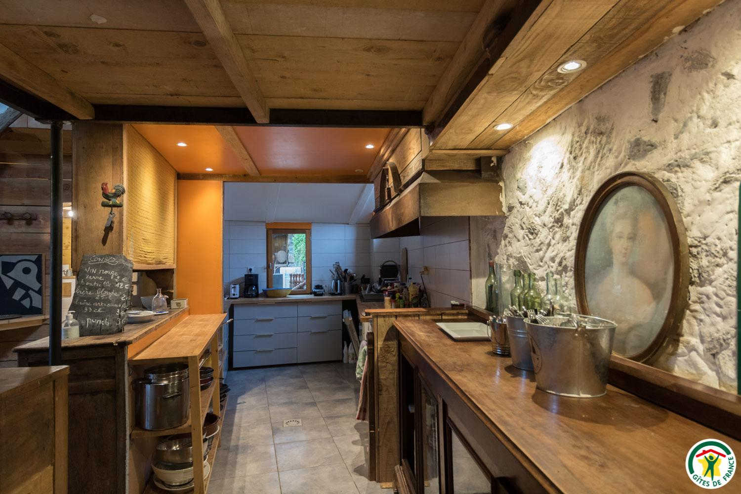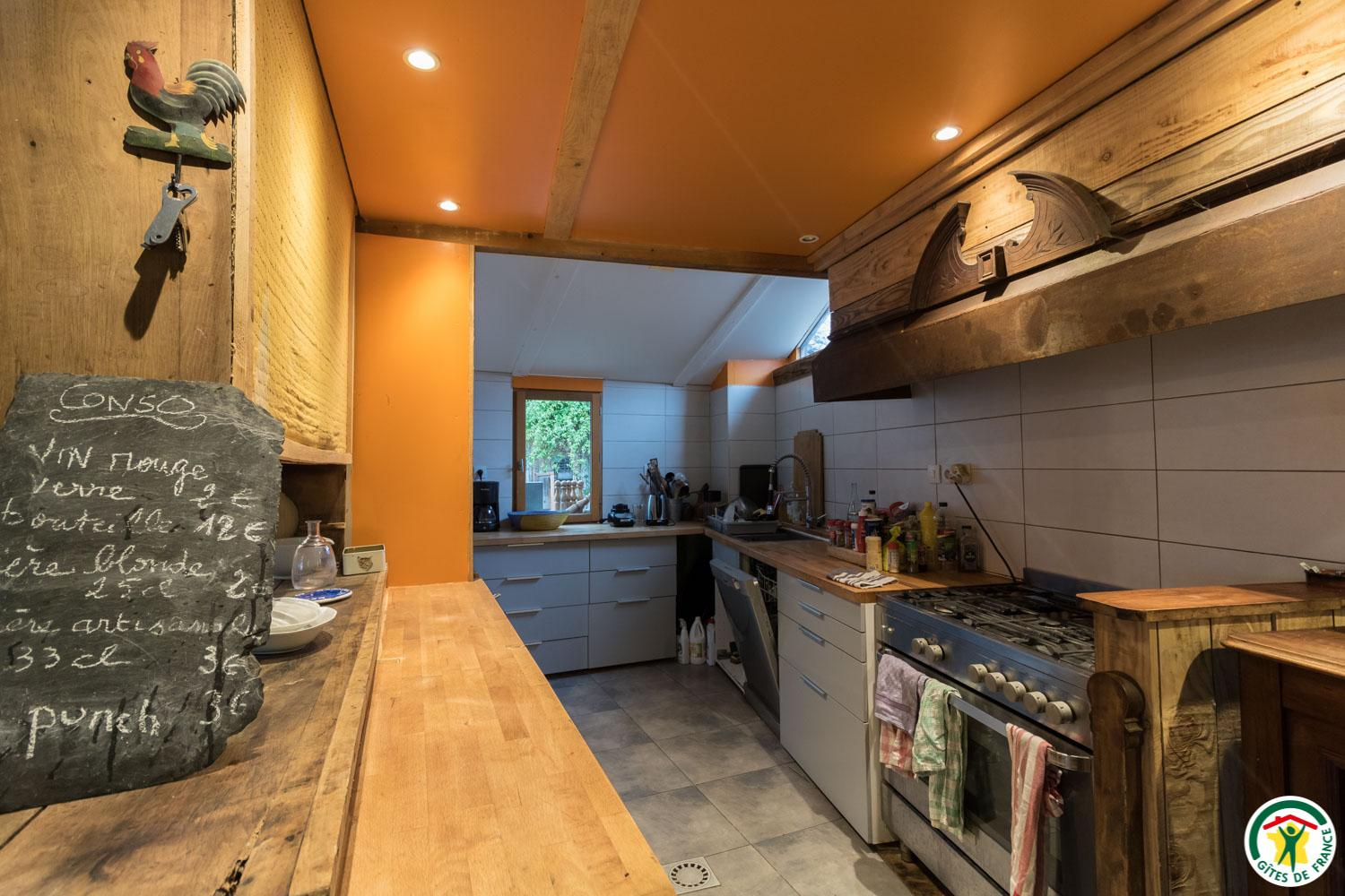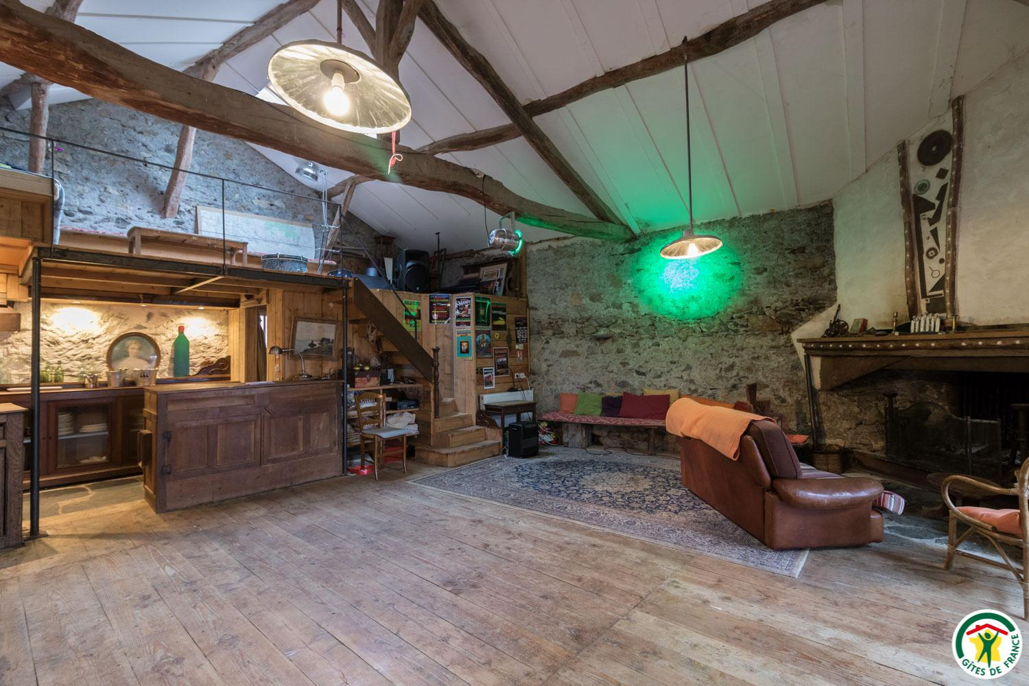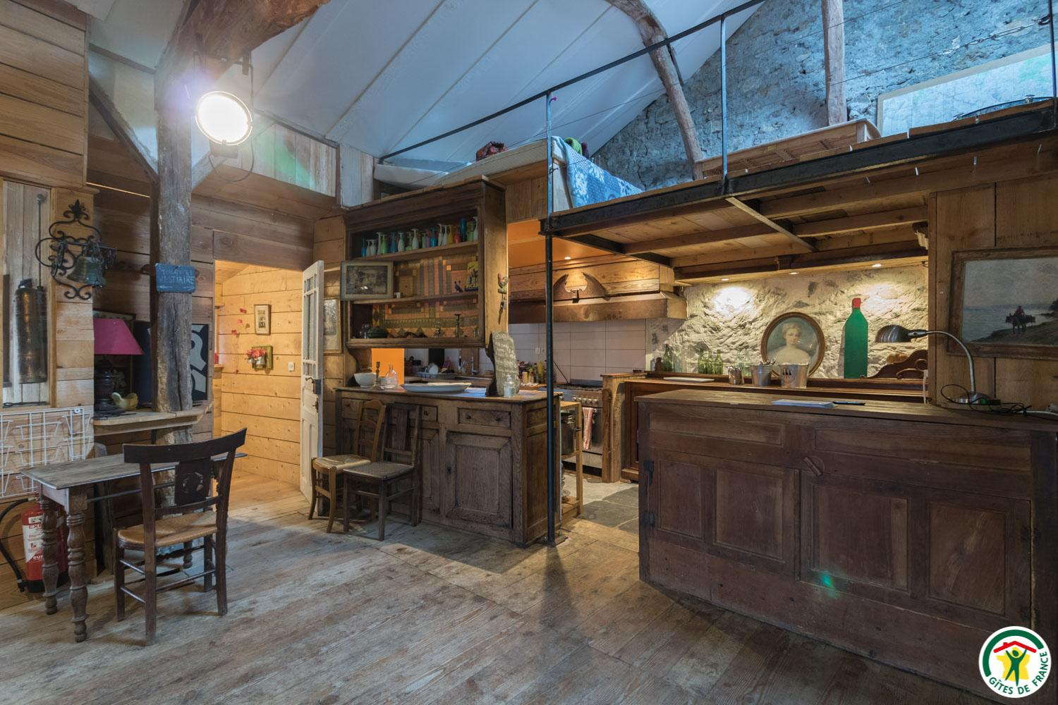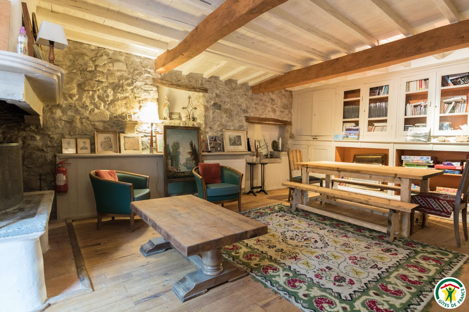 – Au rez-de-chaussée : cuisine en gestion libre et salon (cheminée, bibliothèque, jeux…), 1 chambre accessible aux personnes à mobilité réduite (2 lits simples en 90*190cm), WC.