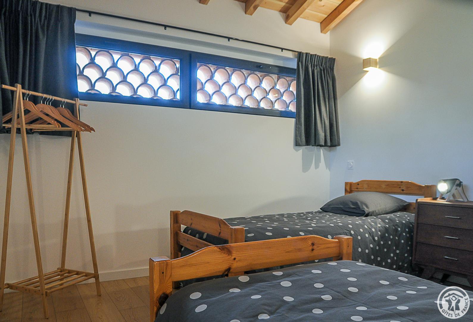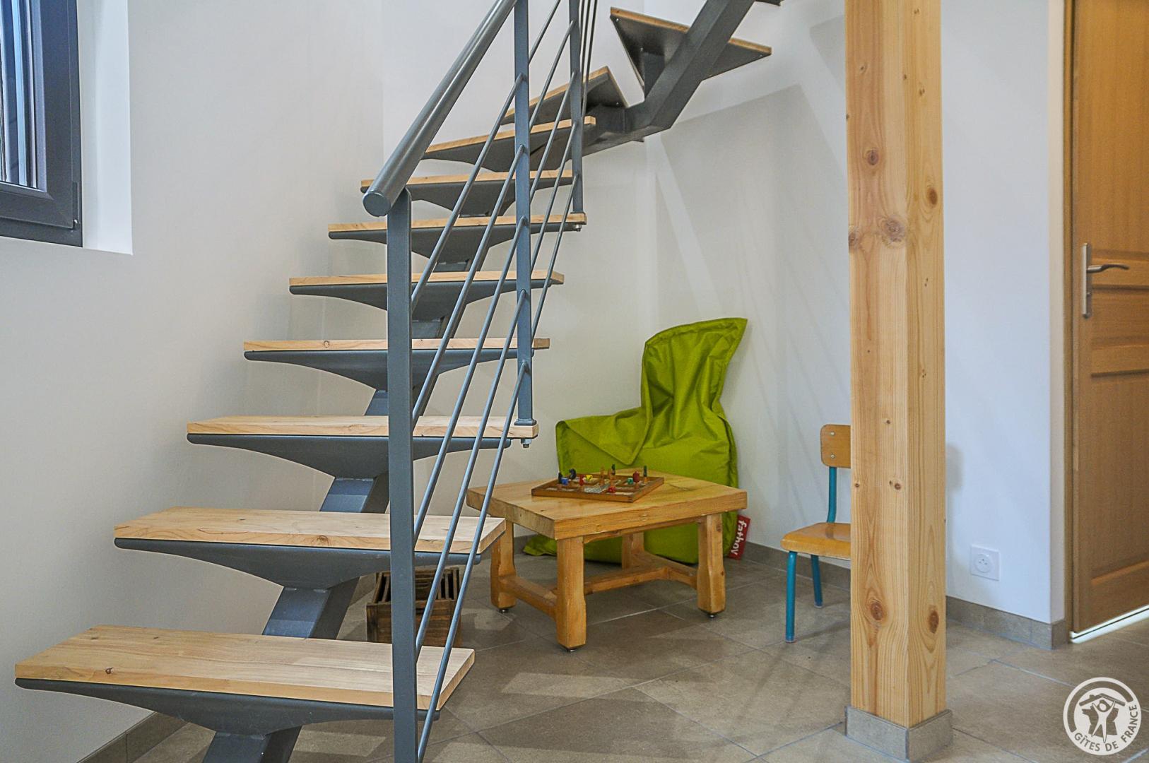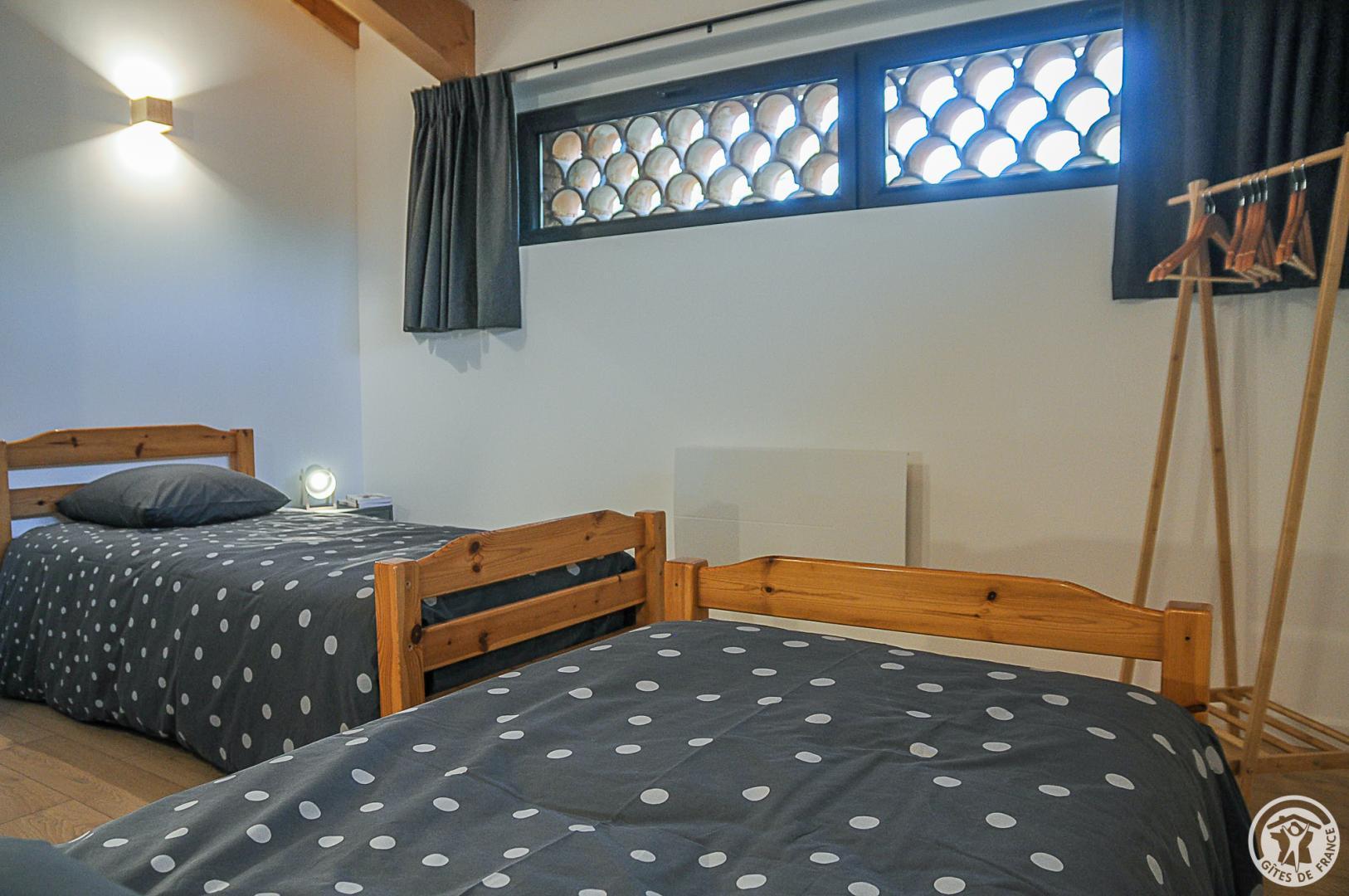 Au RDC : entrée sur l’espace cuisine / salle à manger ouvert sur le salon, coin-jeux pour les enfants sous l’escalier, salle d’eau et WC indépendant distribués par un petit couloir accueillant l’espace buanderie. A l’étage : dégagement ouvrant sur 3 chambres (1 lit pour 2 personnes en 140cm) (1 lit pour 2 personnes en 140cm) (2 lits pour 1 personne en 90cm), WC indépendant. Climatisation réversible au RDC, convecteurs à l’étage. Connexion internet filaire et Wifi. Gîte non fumeurs.